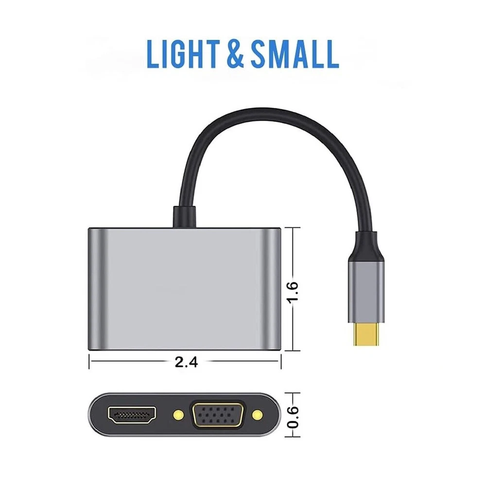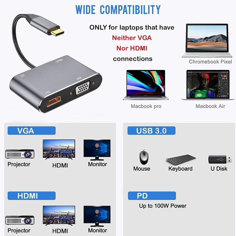 About this item: 【Plug and Play】Right out of the box this USB C to HDMI VGA adapter has no external software drivers required or power adapter needed 【Dual Monitors Setup simultaneously】HDMI and VGA ports can work simultaneously, and you can use USB C to HDMI and VGA at the same time. ⚠️ Note: Under extend mode, you can only get two screen images, not three 【Vivid 4K Resolution】this VGA to USB C HDMI port supports resolutions up to 4k*2k@30HZ, 4 times clearer than 1080P, HD and VGA signals output simultaneously, the resolution is 1080P. 【Port Compatible】This Type C to VGA can be connected a device equipped with a USB-C or Thunderbolt 3 port to the monitor or display. ⚠️Before purchasing, please make sure your USB C host device must support video output or DP Alt Mode. Not all USB C device is compatible. USB C to VGA Adapter doesn't compatible with iPad Pro 2021 11" and iPad Pro 2021 12.9" Support 100W PD fast charging, to meet your daily office needs. Support replication mode and expansion mode to meet your different needs. Aluminum alloy shell, shockproof, wear-resistant and scratch-proof, efficient heat dissipation, stable and durable. Specification: Type: 4-in-1 Type-C hub Material: ABS+Aluminum alloy Expansion port: 1*USB3.0, 1*USB-C PD, 1*HD, 1*VGA USB3.0 theoretical transmission rate(max): 5Gbps PD power: Up to 100W HD resolution: Up to 4K VGA resolution: 1080P Packing list: 1 * Hub Support Mirror & Extend Dual Mode: -- Mirror and Extend Mode Settings: For MacOS, Top left corner Apple icon-->System Preferences-->Displays-->Mirror or Extend Displays; For Windows 10, press Windows key + P combination command-->choose Duplicate or Extend. For Windows system laptop, if the external monitor could not work, please update the BIOS and graphic card driver from laptop official website. -- Stereo Settings: For MacOS, Please go to Apple icon-->System Preferences-->Sound-->Output, choose your TV as the sound output. For Windows 10, please click right bottom of your sound icon-->choose your TV as the sound output. For Sony TV, if you are running MacOS, you probably need to go to Launchpad-->Other-->Audio MIDI Setup-->DisplayPort-->Output-->Please choose 2 ch 16-bit integer. If the resolution of your laptop is higher than the external monitor. For windows: Windows Menu--> Setting--> Display--> Advanced Display Settings, set your laptop's resolution same as or lower the resolution of external monitor. For MacOS: Left-upper Apple icon-->System Preferences-->Displays-->Mirror displays. Then your HDMI & VGA monitor would mirror your Mac. However here you have two choices. One is "Optimize For" your built-in Retina Display, the other is "Optimize For" your HDMI monitor. You can choose which one you like. Compatible Devices(not a full list): * MacBook Pro 2020 / 2019 / 2018 / 2017 / 2016 / Mac Pro / iPad Pro 2018 2020, NOT compatible with iPad Pro 2021 11" and iPad Pro 2021 12.9" * iMac (Mid 2017) and newer / iMac Pro * Mac Mini (Late 2018) and newer * MacBook (Early 2015) and newer / MacBook Air (Late 2018) and newer * New Chromebook Pixel / Pixelbook 2-in-1 / Pixel Slate 2-in-1 / Chromebook Pixel (2015) * XPS 15 / 13 / 12 * EliteBook Folio G1 / HP Spectre 13 laptop / Spectre x360 2-in-1 * Thinkpad E580 / T470 / T480 / X1 Carbon (2017) / A485 / A285 / E485 / E585 / Yoga 900 / 910 / 920 * Asus Zen AIO All in One PC * Surface Book 2 / surface go * Galaxy S20 / S20+ / S20 Ultra / S8 / S8+ / Note8 / S9 / S9+ / Note9 / S10 /S10e / S10+ / Note 10 and Tab S4. * LG G5 / G7 / G7+ / Q8 / V20 / V30 /V30+ / V35 / V35+ / V40 / Exodus 1 * HTC 10 / HTC U Ultra / U11+ / HTC U12+ * Mate 10 / Mate 10 Pro / Mate 20 / Mate 20 Pro / Mate X / P20 / P20 Pro / P30 / P30 Pro / Honor Note 10 / Honor View 20 If your laptop not included in the list, please feel free to let us know ,we are very gladly to help you to check if your device can work with the adapter.