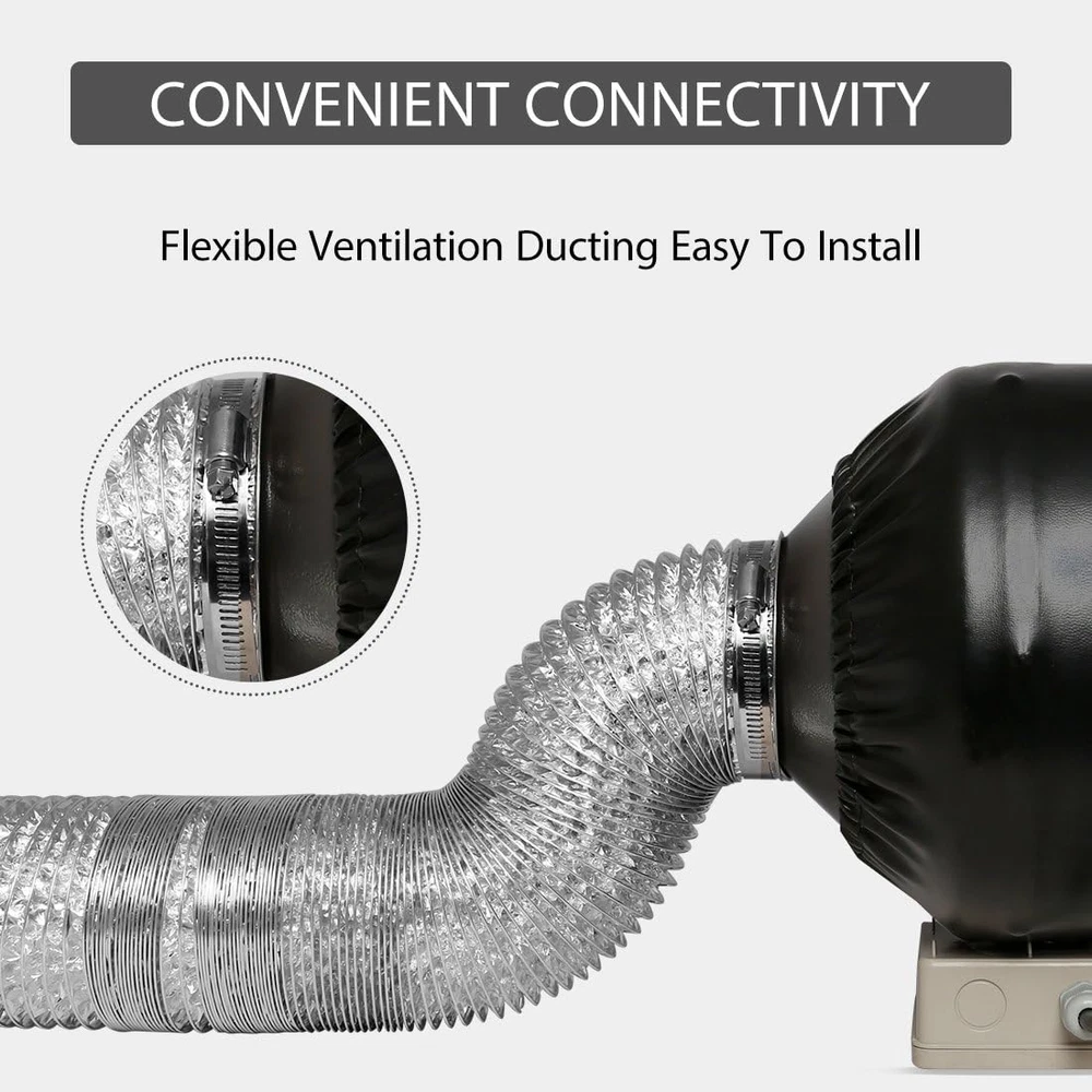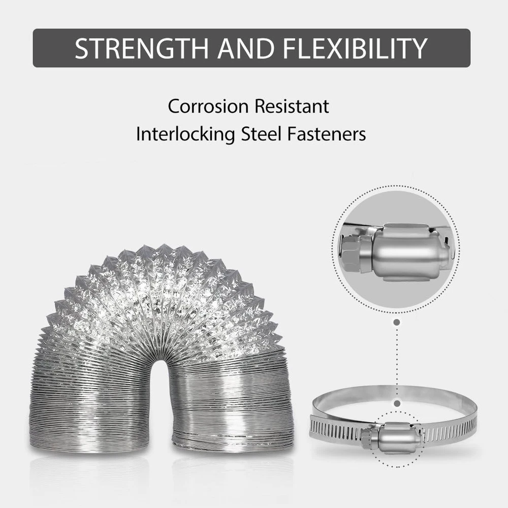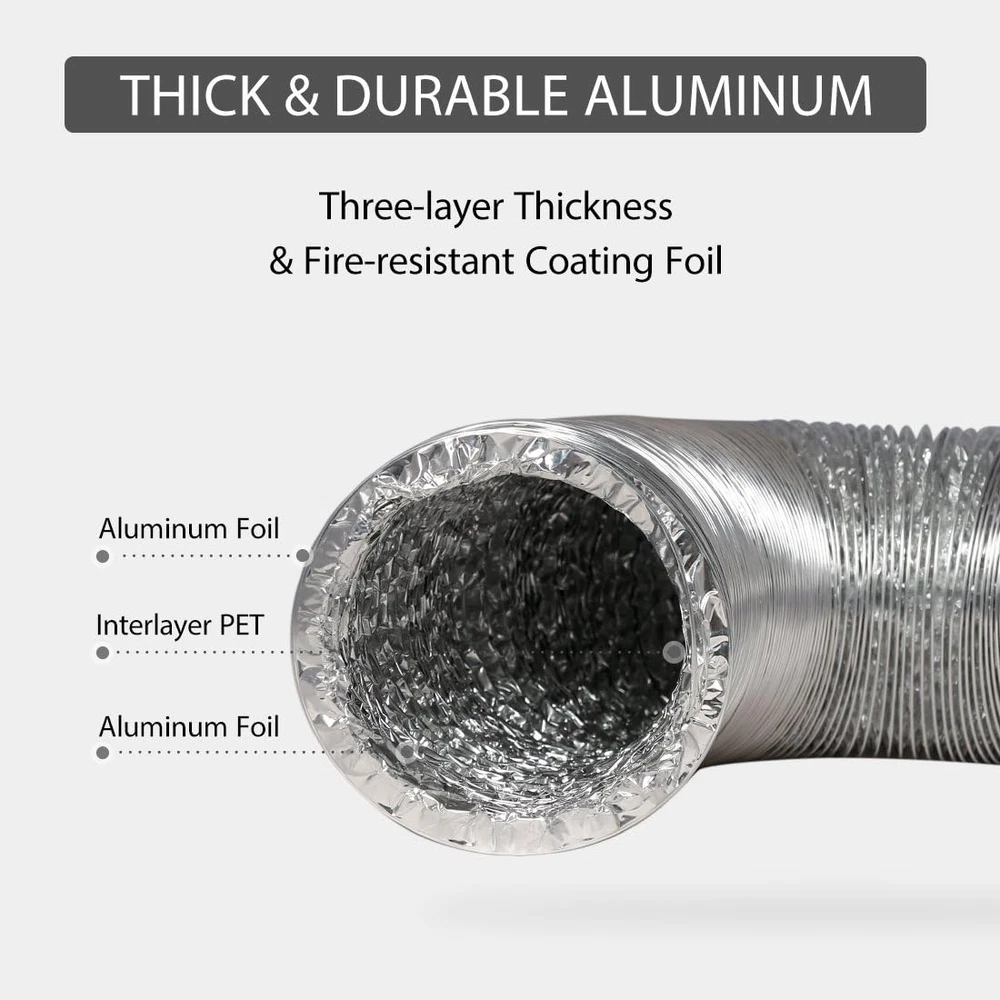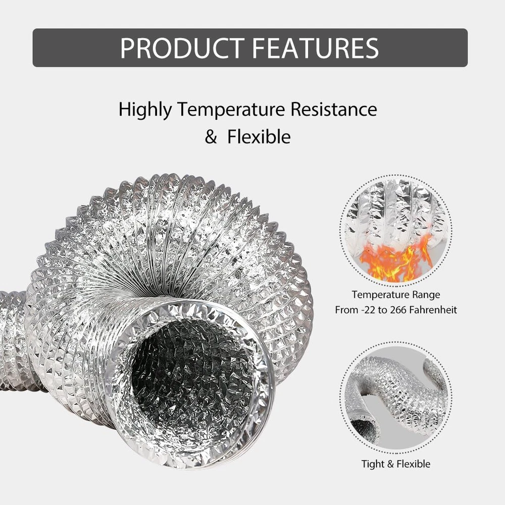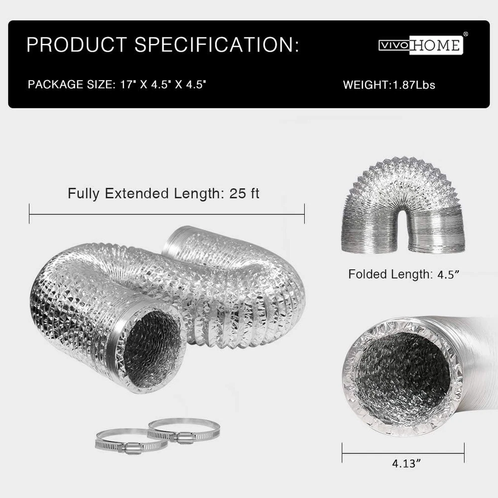 IDEAL CONNECTOR - Used in exhaust fan applications to move and transport air, which increases airflow and eases connections between spaces; It's compatible with front-mounted and top-loading dryers/fans ADVANCED STRUCTURE - Made of heavy-duty aluminum foil laminated and PET for durability; 3-layer design with flame-retardant coating, which is resistant to corrosion and temperature variations; It only takes up little space when not in use due to the flexible length of inline fan EASY INSTALLATION - Super flexible and super simple to set-up; With 2 bonus metal screw clamps, it can be easily slid right onto the duct fans, exhaust vents, carbon filters or light reflectors, and firmly fixed on the joints; The attached clamps can help you connect the vent more closely; Please wear gloves to avoid being injured during assembly DUCTING PARAMETERS - 4" in diameter, 25 ft long when fully extended and can be folded down to 13.5"; Thermal endurance ranges from -22 to 266 F (-30 to 107 C) WIDE APPLICATIONS - Commercial and residential air duct solutions; Widely used in HVAC applications, bathroom venting, stove exhaust, dryer ventilation, kitchen cooking exhaust, planting room or greenhouse air circulation, etc Product Description Durable & High Quality VIVOHOME 4 Inch 25 Feet Aluminum Flexible Dryer Vent Hose VIVOHOME Flexible Aluminum Foil Duct is an ideal choice for exhaust applications. The tubing is flexible enough to bend and turn around curves while maintaining strength. 25FT extended length suits most situations while 13.5 compressed length makes it portable. Let s bring the vent hose back! 1 Flexible Design 2 Laundry room 3 Diy Projects 4 Bathroom 5 Green Room Product and Package Information Material Aluminum Color Silver Product Dimensions 4"Diameter*25ft Long Package Dimension 17(L) × 4.5(W) × 4.5(H) inches Gross Weight 1.87lbs. Package Includes 1 x Vent Hose; 2 x Metal Clamps Related Products Recommendations Add to Cart Add to Cart Add to Cart Add to Cart Customer Reviews 3.8 out of 5 stars 400 4.4 out of 5 stars 2,652 4.0 out of 5 stars 1,426 4.4 out of 5 stars 15,824 4.1 out of 5 stars 3,717 3.9 out of 5 stars 2,305 4.0 out of 5 stars 45 Price — $79.99 $ 79 . 99 — $39.99 $ 39 . 99 $89.99 $ 89 . 99 $239.99 $ 239 . 99 — Material Alloy Steel Alloy Steel Alloy Steel PP Polycarbonate, Aluminum, ABS Stainless Steel, PP plastic PP, Iron Product Dimensions 23.6 x 15.7 x 26.8 inches 13.8 x 48 x 48 inches 61.5 x 83 x 71 inches 20 x 20 x 28 inches 39.6 x 38 x 11 inches 22.4 x 9.8 x 11.4 inches 27.5 x 25.6 x 36.2 inches Item Weight 63 lbs. 18.7 lbs. 25 lbs. 4.4 lbs. 8.6 lbs. 37.5 lbs. 21.6 lbs Color White Black Blue & Green Copper Transparent Black Black Function Drying clothes Storing firewood Outdoor play Hold water and food for birds Shade from sun and rain Pumping and irrigation Make rich organic compost