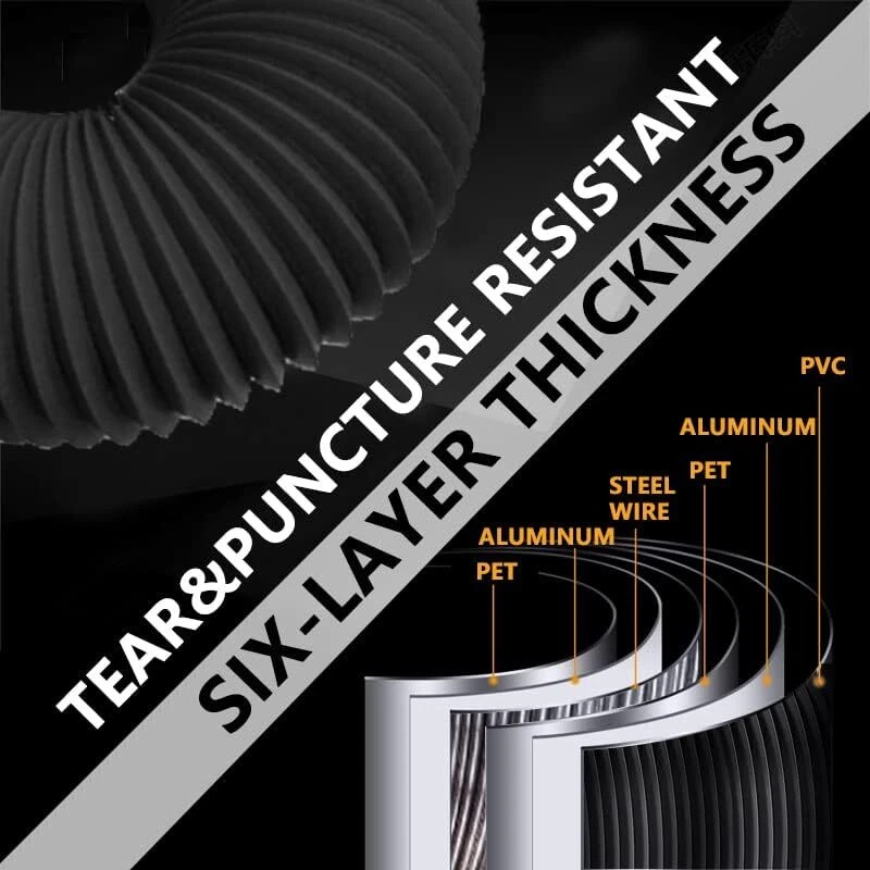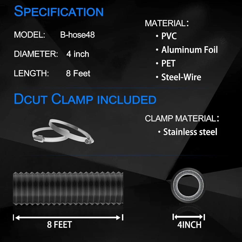 4 Inch 8 Feet Dryer Vent Hose,Flexible Insulated Air 8feet, Black Product Details Brand: TEAIERXY Material: Alloy Steel, Aluminum, Plastic Color: Black Product Dimensions: 96"L x 4"W Nominal Wall Thickness: 0.001 inches Outside Diameter: 4 Inches Item Length: 96 Inches Manufacturer: TEAIERXY Brand Name: TEAIERXY Item Weight: 14.6 ounces Material Type: Alloy Steel, Aluminum, Plastic Batteries Included?: No Batteries Required?: No Brand: TEAIERXY Material: Alloy Steel, Aluminum, Plastic Color: Black Product Dimensions: 96"L x 4"W Nominal Wall Thickness: 0.001 inches Outside Diameter: 4 Inches Item Length: 96 Inches Manufacturer: TEAIERXY [Six-layer thickness]:The Dryer Vent Hose is made of 6 layers thickness(2 Aluminum Foil +2 PET +Steel wire+ PVC),The hose steel wire diameter is 1mm prevent deformation.The PVC film help to be light-proof,noise reduction and Insulation. [Ducting parameters]:TEAIERXY 4 inch dryer vent can be 360° and freely stretched as well without deformation. [Easy to Install]:Flexible and simple to Install the dryer vent hose.TEAIERXY supply two clamps to Fix the dryer vent hose.The dryer vent hose can be cut to the required length. [Wide Application]:The dryer vent hose is applicable for HAVC ventilation systems,dryer,inline duct fan,vent exhaust and carbon filter. [Dimensions]: 4 inch x 8 feet;4 inch x 16 feet.Color:white,black,grey.