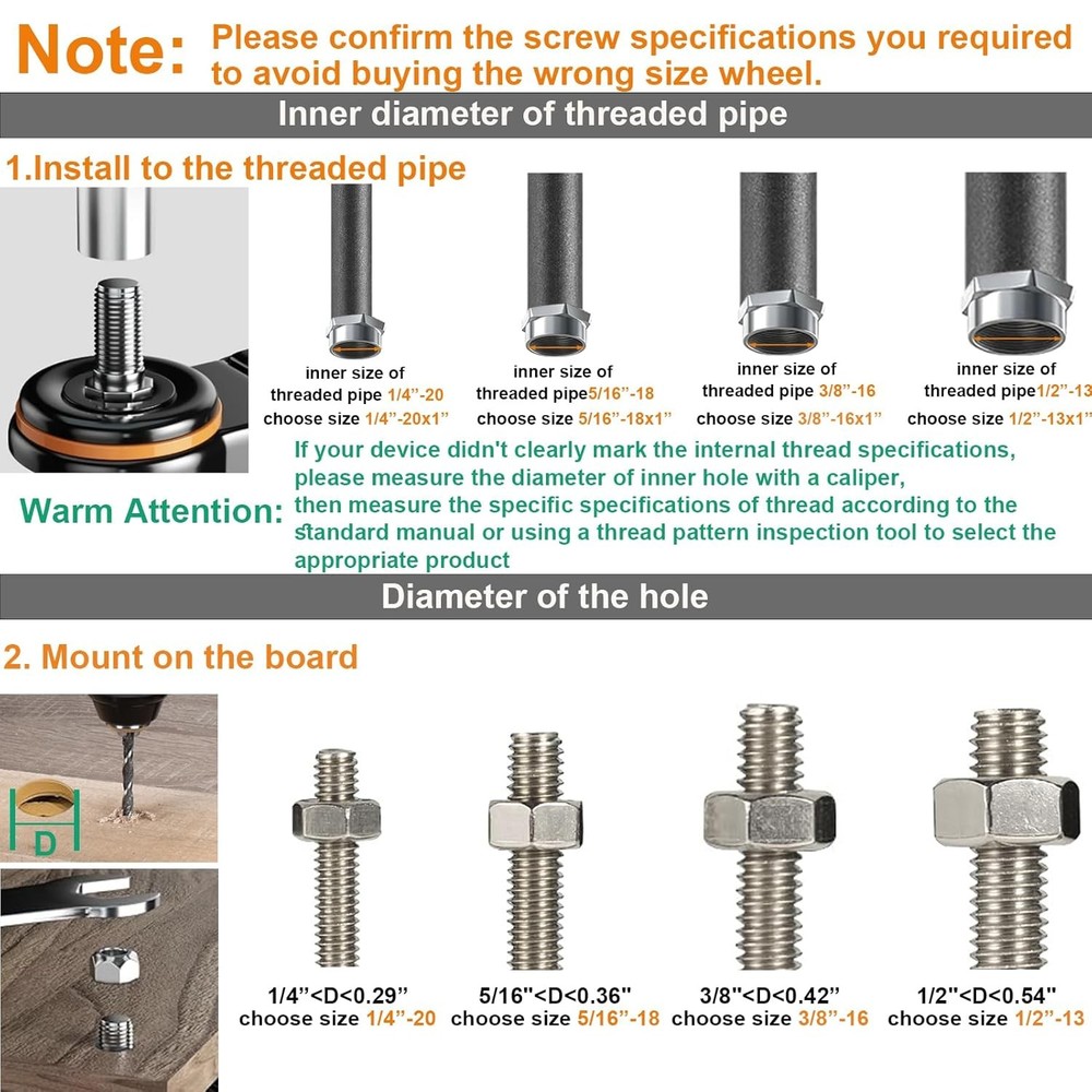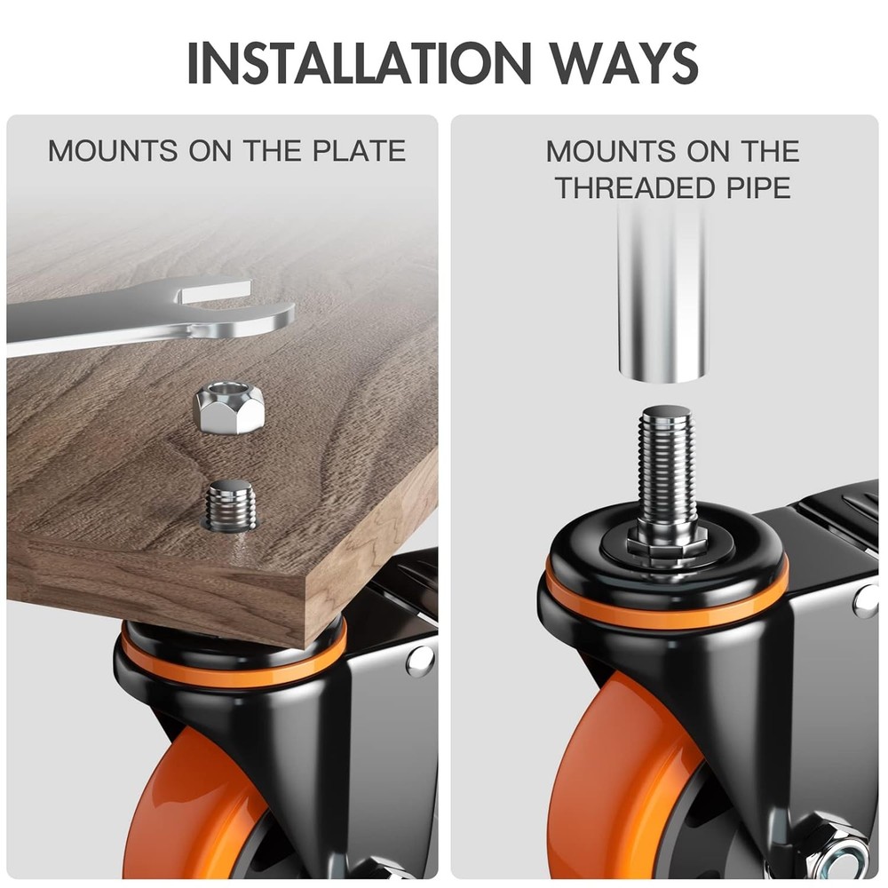 Free eBay listing template designed by dewiso.com 4 Inch Caster Wheels 2000Lbs, Threaded Stem Casters Set of 4 Heavy Duty, 1/2"-13 x 1 (Screw Diameter 1/2", Stem Length 1"), Safety Dual Locking Industrial Castors, Wheels for Cart, Furniture FREE AND FAST SHIPPING! About this item STABLE HEAVY DUTY CONSTRUCTION: The housing of caster wheels is made of heavy duty steel for high load, which is designed to be thicker and stronger with our unique cold-rolled technology. Each threaded stem caster supports 500lbs of load, 2000lbs total capacity for casters set of 4 heavy duty. Saving time and labour while moving. STANDARD AMERICAN SIZE 1/2" -13UNC x 1": Please measure the stem size of your old thread dual locking caster wheel with Brakes before purchasing. Our cart wheels screw size is 1/2" -13x1" (Screw Diameter 1/2", Screw Length 1"). The castors are quickly attached to medium and large equipment like workbench, trolley, carts. SAFETY DUAL LOCKING SYSTEM: Double lock mechanism locks both the heavy duty wheel and the swivel bearing at the same time, which is holding the equipment firmly in place to reduce accidents, essential for safety. While releasing the brake, the heavy duty casters become 360-degree swivel, can respond immediately to changes in desired direction. QUIET MOVEMENT ON HARD FLOORS: The wheels for cart are adopted non-marking polyurethane as its main material, won't harm your wooden floor, no noise, the surface of the rubber stem casters is soft and better protects the ground. The casters set of 4 have a better performance of durability, shock absorption and quiet rolling operation. HARDWARE KITS PROVIDED & WIDELY USED: We prepared 4 x bolts and 4 x washers and 1 x spanner to help you quickly and easy to assemble. These castor wheels are widely used, generally used for workbench, cart, trolley, shelf, wooden cabinet, furniture, home appliances, etc. Whatever your workplace needs assistance making mobile, our caster wheels are a quick fix. Product We offer a 30-Day Return Policy on items which you are not completely satisfied with. You have the option for a full-refund or an exchange of the item. No returns are available on items shipped outside of the US . Shipping We offer Free Shipping to the US and ship within 2 business days of payment, usually sooner. We use UPS express shipping. That's why your products are usually delivered within 3 days . Contact We try our very best to make sure every customer is completely satisfied. If there's a problem , message us! We're happy to help. 24/7 live chat available.