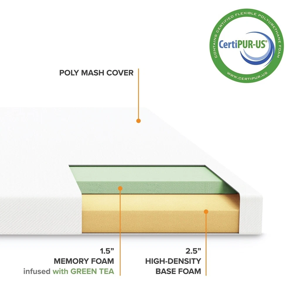 Add a touch of comfort to your mattress with this 4-inch memory foam topper from Crown Comfort. Body-contouring memory foam provides a comfortable resting surface while the temperature-smart feature helps keep you cool throughout the night. With even weight distribution and heat release this mattress topper ensures a good night's sleep. Memory Foam Details:Resistant to dust mites, naturally antimicrobialTemperature-smart memory foam responds to body heat and movement, reshaping to distribute body weight and relieve pressure points to improve circulationNever needs turningMemory Foam Tips:Conveniently arrives tightly packed in portable box.Remove from packaging within 72 hours to maximize expansion.You can sleep on it the same night it is unwrapped, however allow 48 hours to fully return to Free Shipping Over $49.99* Details 4 Inch Green Tea Infused Memory Foam with Cover - Comfort Crown Product Description: Add a touch of comfort to your mattress with this 4-inch memory foam topper from Crown Comfort. Body-contouring memory foam provides a comfortable resting surface while the temperature-smart feature helps keep you cool throughout the night. With even weight distribution and heat release this mattress topper ensures a good night's sleep. Memory Foam Details: Resistant to dust mites, naturally antimicrobial Temperature-smart memory foam responds to body heat and movement, reshaping to distribute body weight and relieve pressure points to improve circulation Never needs turning Memory Foam Tips: Conveniently arrives tightly packed in portable box. Remove from packaging within 72 hours to maximize expansion. You can sleep on it the same night it is unwrapped, however allow 48 hours to fully return to its original shape. Vacuum sealing sometimes traps odors. After unwrapping, air for a few hours to eliminate trapped odors. Due to machine-cutting manufacturing processes, there may be slight variances in the dimensions of this product. Due to the nature of memory foam, the firmness level of similar products may produce different firmness results. Once opened this product is non-returnable.