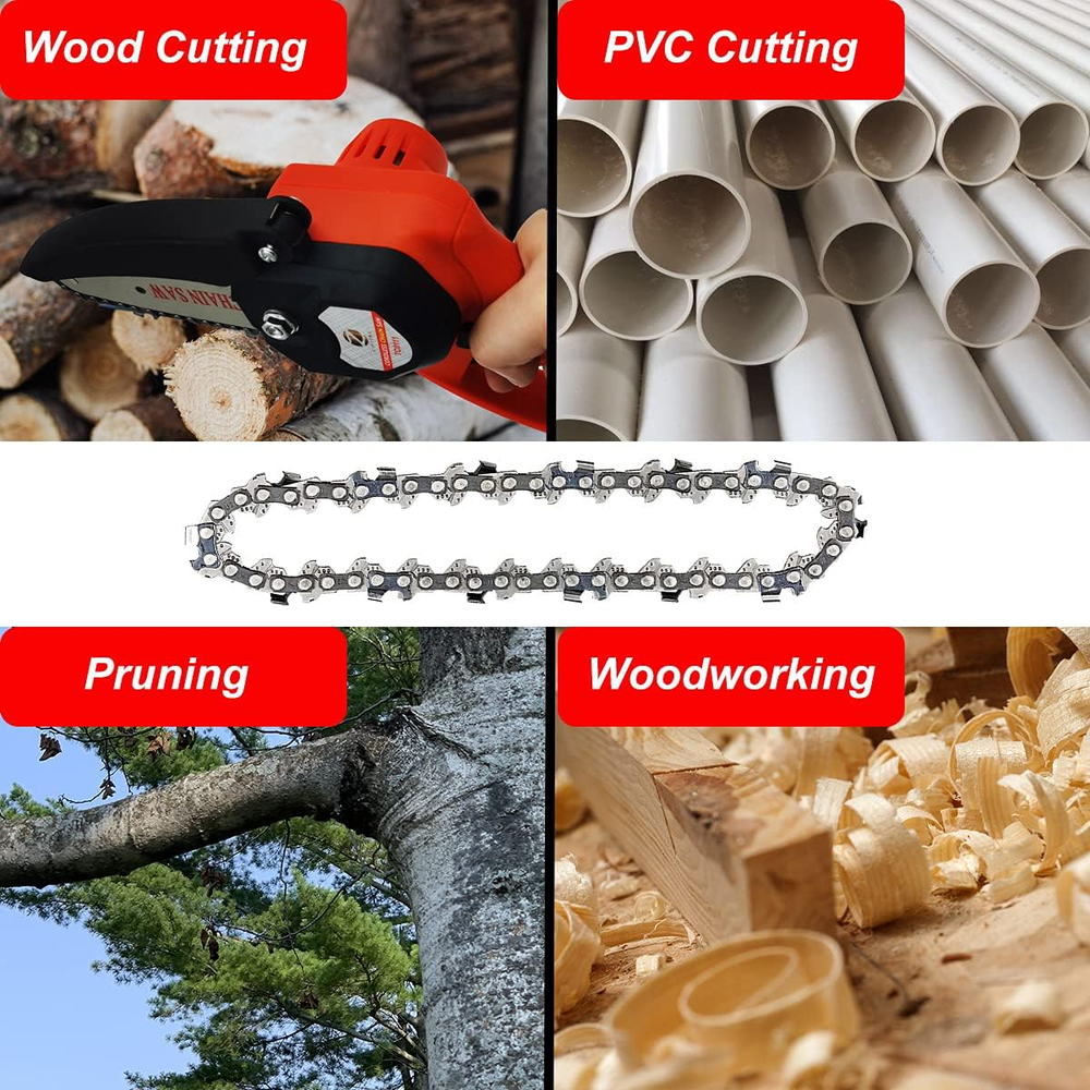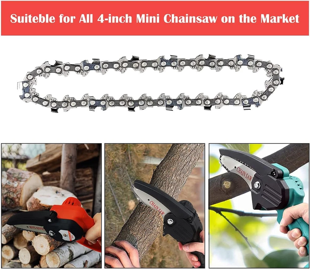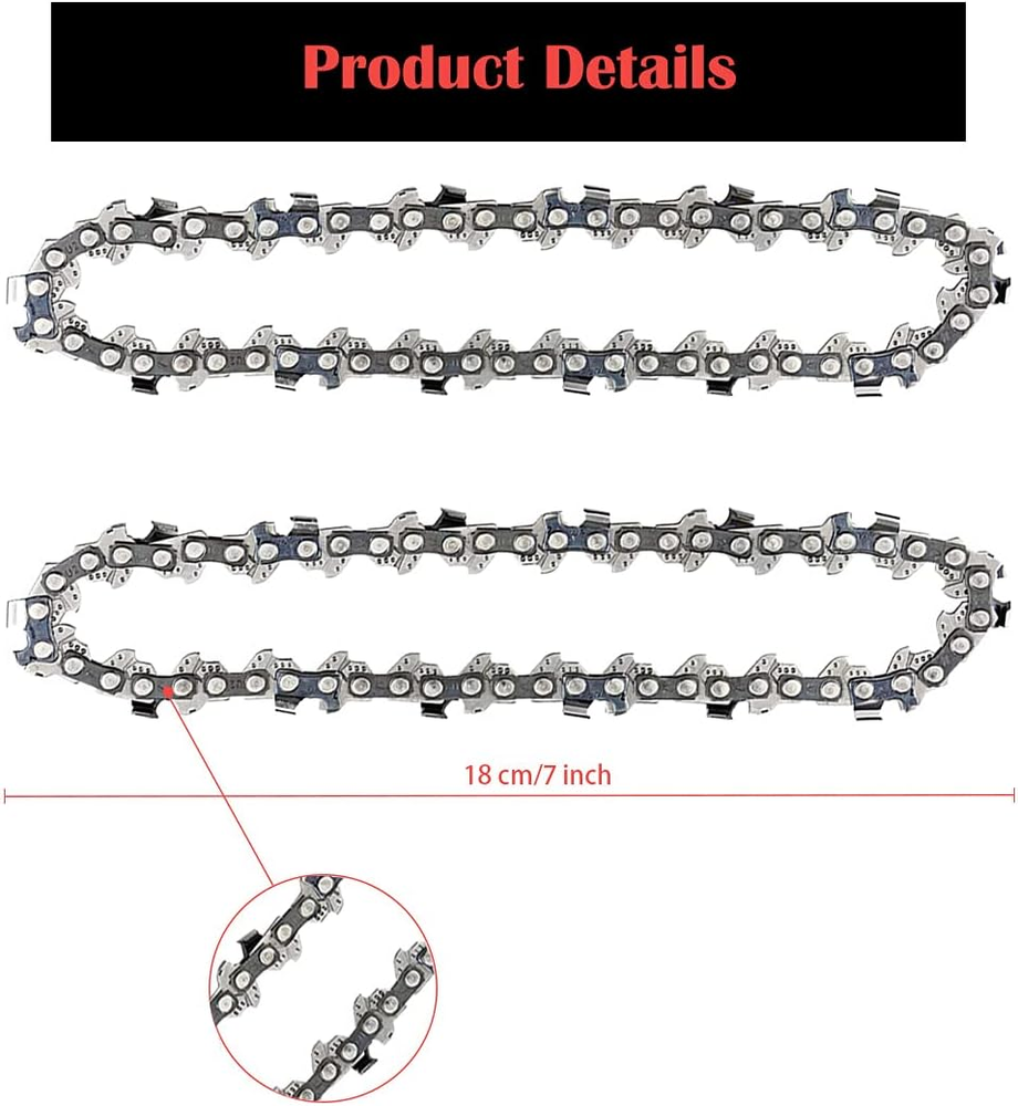 Store New Arrivals Add to Favorite View Feedback 4 Inch Mini Chainsaw Chain, Replacement Cordless Battery Powered Electric Portable Chainsaw Chain, Mini Cordless Electric Chainsaw Chain for Wood Branch Pruning Trimming Cutting (4 Pcs) Description Item Package Quantity 1 Style 4 pcs Power Source corded-electric, battery-powered Color 4 Pcs Pattern 4 pcs Brand Zinyeme Material Carbon Steel,Wood Batteries Required? No Package Dimensions 5.71 x 4.06 x 1.57 inches Drive Link Count 50 Item Weight 6.7 ounces Batteries Included? No Item Length 7 Inches Chain Length 4 Inches Manufacturer Zinyeme Durable material and light weight: The chain is made of carbon steel which has been deep-hardened to ensure smooth cutting. And it only weighs 1.2 ounces. Wooden Teeth Design: The wooden teeth design can make the chainsaw strike on the branches, cutting more efficient and faster. Pointed teeth: The gear teeth are pointed and wear-resistant, which can help you improve work efficiency. With high hardness, the carving chains are durable, practical and hard to break. Versatile usage: These mini chainsaw replacements are suitable for most 4 inch chainsaws on the market. They can be applied to a variety of materials. The chainsaw is intended for cutting, trimming, pruning, carving and shaping wood, cutting plywood, laminated flooring, chipboard, PVC, plastic pipe, ice, rubber, etc. Quick and easy replacement: Just turn the screw; remove the original chain; then replace it with the new chain, and tighten the screw. Please make sure the chain is the right direction, which the long sharp blade is pointing forward. ABOUT US We offer the best prices around on high quality products. Our E-store includes media such as books, movies, music and games while offering electronics, toys, sporting apparel, clothing, tools, general home, garden items and more. SHIPPING We are always working hard to ensure your package arrives as soon as possible. Please understand that some factors like weather, high postal traffic, and the performance of shipping companies are outside of our control. We offer free shipping to the lower 48 states and ship within 2 business days of payment, usually sooner. We do not accept P.O. Boxes. Please provide a physical address. RETURNS We offer a 30-Day Return Policy on items which you are not completely satisfied with. You have the option for a full-refund or an exchange of the item. No returns are available on items shipped outside of the USA. PAYMENT We accept PayPal. CONTACT US This page content is yet to come Please ad us to your favorite seller and visit again later Thank You
