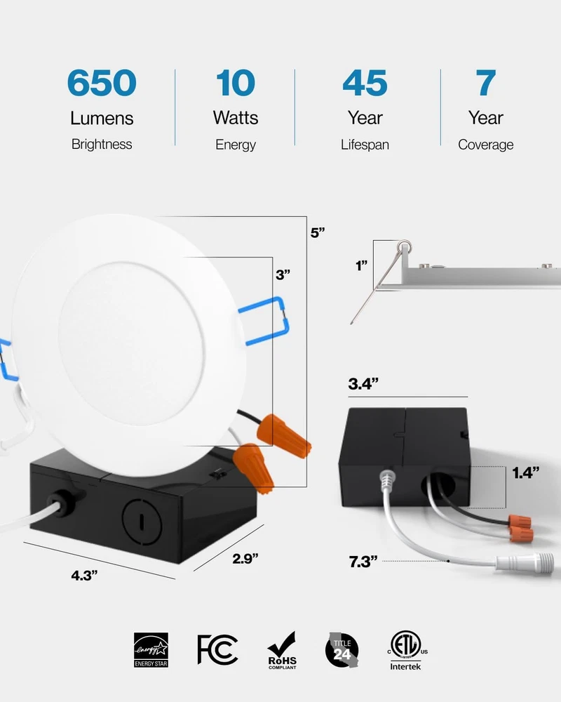 4 Inch Slim LED Downlight with Junction Box and Smooth Trim IC RATED - Sunco's slim downlights are IC rated, meaning they are thermally protected and won’t overheat or ignite surrounding insulation in the roof or overhead joist space. Both the light and its junction box are safe for direct contact with ceiling insulation. SIMPLE INSTALL - Our LED slim downlights come equipped with a junction box which means they do not need a can. Spring-loaded brackets fit any ceiling type: double drywall, single drywall, and soffit. DIMMABLE - Seamless dimming capabilities (10%-100%) to fit any mood or décor. Our slim downlights give off sunlight-like quality for true color rendering. SUNCO BENEFITS - 7 Year Protection! Sunco is proudly based in the USA, offering quality products at affordable prices backed by industry-leading warranties and knowledgeable support specialists. Product Description Similar Products Add to Cart Customer Reviews 4.3 out of 5 stars 2,152 4.4 out of 5 stars 1,535 4.6 out of 5 stars 1,571 4.4 out of 5 stars 123 4.7 out of 5 stars 1,144 Price — $99.99 $ 99 . 99 — $54.99 $ 54 . 99 $24.99 $ 24 . 99 Lumen Count 650 Lumens 650 Lumens 650 Lumens 750 Lumens - Wattage 11W 10W 10W 12W - Equivalency 60W 60W 60W 75W - Dimmable ✓ ✓ ✓ ✓ - Junction Box Included ✓ ✓ Integrated ✓ - Color Rendering - - - CRI 90+ - Voltage 120V 120V 120V 120V - Moisture Rating Damp Rated Damp Rated Damp Rated Damp Rated - IC Rated ✓ ✓ ✓ ✓ - Can Required No No No No -