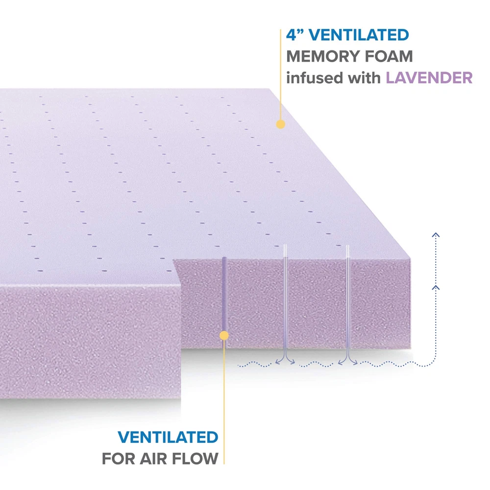 Instantly upgrade your old mattress with Best Price Mattress' lavender-infused ventilated bed topper. It's a mattress topper pad, made with 4 inches of CertiPUR-US certified, premium memory foam to revamp your old mattress for maximum comfort and improved sleep quality. The lavender infusion works as a natural relaxant to soothe you into a good night's sleep. Its breathable open cell design optimizes airflow, reducing body heat and helping to keep your topper fresh for a longer time. Memory foam is well known for its body contouring features and pressure comfort throughout your whole body. Once you lay down, our memory foam toppers will start reacting to the temperature of your body and begin to mold itself to your shape, evenly distributing your weight. Product Note: Please allow 24 - 72 hours for your Mattress to regain its full shape. Any memory foam will expand faster in a warmer room. In cold temperature, at delivery, your mattress may take a bit longer to return to full sized from its compressed state.The expansion time of the mattress will vary as per the surrounding 4-inch ventilated memory foam topper to upgrade your sleep quality Ventilated design optimizes airflow and reduces trapped body heat Infused with lavender, a natural relaxant, for a soothing night's sleep Responsive active suspension isolates motion to provide undisturbed sleep for you and your partner CertiPUR-US certified memory foam, 3-year manufacturer's
