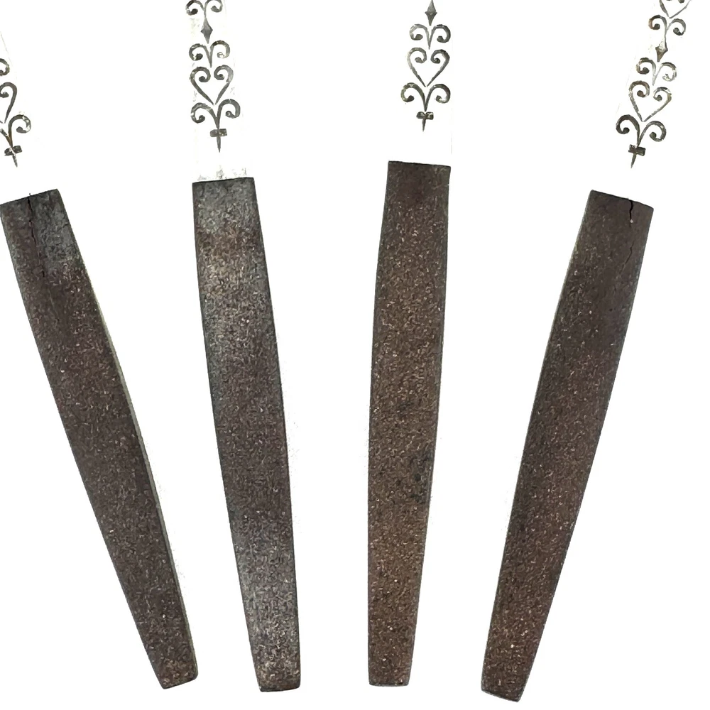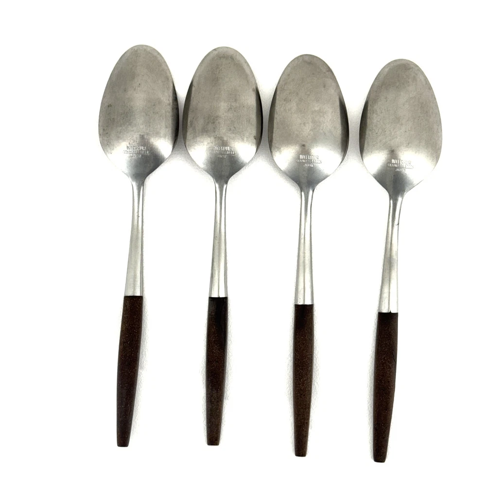 Offering a lot of 4 Interpur INR2 oval soup spoons 7.75” long, mid-century modern style, a discontinued pattern made in Japan. The brown synthetic handles are sturdy and have cracks. The stainless steel is in good condition, no chips, dents, or disposal damage. There are surface scratches and wear consistent with normal use. Please view the photos for details and condition. Measurements and photo colors are approximate. For extra protection your items will be packed in plastic sleeves and shipped in a box. For combined shipping, request an invoice before paying. Shipping is your choice of USPS Ground Advantage or USPS Flat Rate Priority at the rate determined by eBay. Terms of Sale: Photos are of the actual item you will receive and is sold "as is". Placing an order is your agreement that you know what you are buying, have viewed the photos and find the condition acceptable. If you have any questions or concerns about your order, contact me through eBay Messages. Please inspect your item upon arrival and contact me if there are any problems so we may work out a solution, before you leave feedback or request a refund . No returns please.