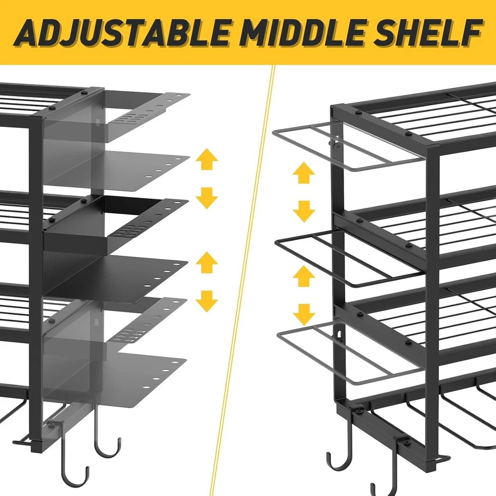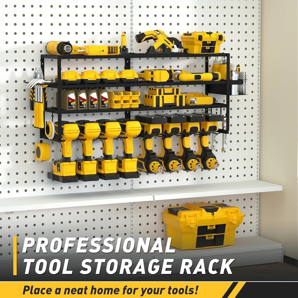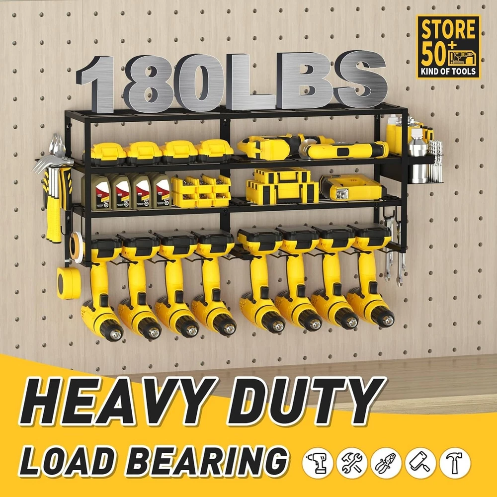 4 Layers Large Wall Mount - Heavy Duty 8 Drill Holders for Garage Storage Rack, Suitable Tool Rack for Workshop, Workbench with Hammer Pliers Racks, and Hooks SPACIOUS 4-TIER DESIGN: Dominate your tool chaos with the , featuring 4 ultra-wide tiers (" per tier), over 2 inches wider than average racks for heavy-duty storage. Securely store 8 cordless drills on the reinforced bottom tier, while the expansive top tiers effortlessly organize bulky power tools, wrenches, and small accessories. No more cramped layouts—engineered with 16-inch stud compatibility to maximize wall space and keep every tool visible and within arm’s reach for garages, workshops, or DIY projects REINFORCED DURABILITY & HEAVY-DUTY CONSTRUCTION: Built to last, the features upgraded welding points and a scratch-resistant, anti-rust coating, ensuring enhanced strength and longevity. Constructed from thickened heavy-duty steel, this rack confidently supports over 180 pounds without bending or breaking. Rigorously tested for strength and stability, it resists deformation and securely stores your heaviest tools, making it the ultimate choice for garages, workshops, or DIY projects. REMOVABLE TOOL RACKS & HOOKS FOR VERSATILITY: This tool organizer comes with removable racks for hammers, pliers, screwdrivers, and paint cans, plus 4 sturdy hooks for hanging floating tools. Customize the layout to fit your specific needs and make the most of your workspace EFFORTLESS 10-MINUTE ASSEMBLY: Get your garage organized in record time! With a tool-free, hassle-free setup, the is ready to use in just 10 minutes—no complicated instructions or extra tools required. Spend less time assembling and more time organizing your tools with ease UNIVERSAL WALL COMPATIBILITY: Designed to adapt to any workspace, our tool rack seamlessly mounts on wood, drywall, cement, and more, making it perfect for garages, workshops, or basements. Whether you're upgrading your own space or gifting it to a DIY enthusiast or dad, this organizer is the ultimate solution for a clutter-free, streamlined workspace