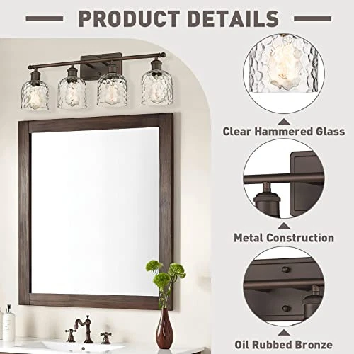 Menu 1. We require immediate payment. 2. We currently accept payment via eBay managed payments only. 3. Once payment is cleared, we will dispatch your shipment within 1-3 business days. Please refer to the "Shipping" tab for more information regarding shipping speed to your destination. 4 Light Fixtures for Bathroom Above Mirror, Vintage Vanity Lighting Fixtures, Oil Rubbed Bronze Finish with Clear Hammered Glass, ZJF63B-4W ORB Product description 【FARMHOUSE & INDUSTRIAL DESIGN】: The 4-light vanity lights over mirror feature a clear hammered glass shade and oil-rubbed bronze finish, reflecting the vintage minimalist design that is suitable for most homes and providing perfect lighting for any space. 【UP/DOWN EASY INSTALLATION】: Hard wired. This farmhouse mirror light can be mounted facing upward or downward to suit your needs. Includes all mounting hardware for quick and easy installation. 【ETL LISTED & WARRANTY】: ETL listed for your safety. It is backed by a 1-year manufacturer's warranty. This oil rubbed bronze bathroom light fixture is ideal for the bathroom, bedroom, dressing room, powder room, headboard, vanity table, makeup dressing table, mirror cabinets, hallway, etc. 【BULB REQUIREMENTS】: Requires 4 x E26 base 60W bulb (incandescent, LED, or CFL). Bulb sold separately. 【24/7 QUALITY SERVICE】: We offer a 30-day money-back for any reason. If you encounter any quality or installation issues, such as a broken glass shade, need replacement parts or help with installation, please don't hesitate to contact us for easy and fast customer service. PLEASE MESSAGE US IF YOU HAVE ANY OTHER QUESTIONS, AND MANY THANKS FOR READING ALL OF THIS. Copyright ©#. All Rights Reserved.