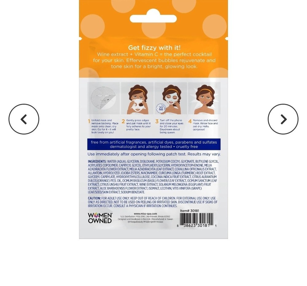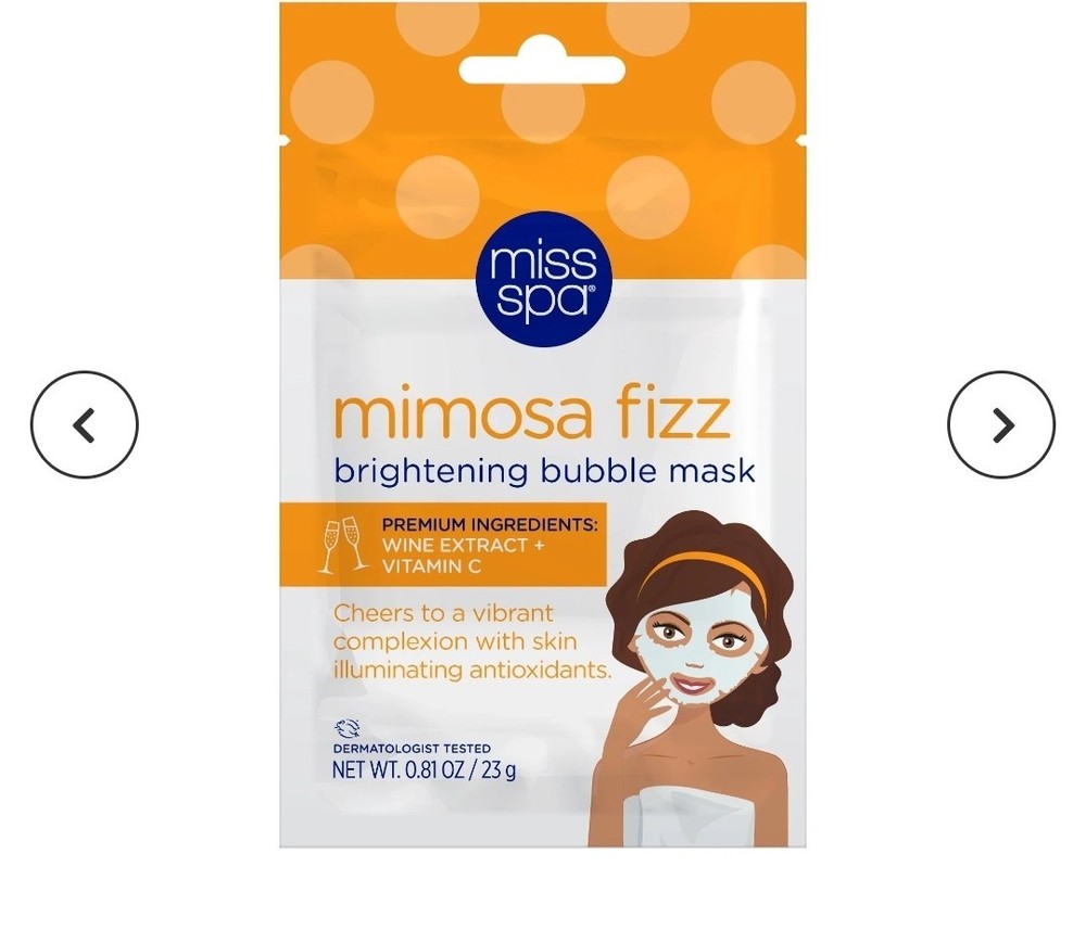☆ 3 x Miss Spa Mimosa Fizz Brightening Bubble Mask 0.67oz BNIB. • Cheers to a vibrant complexion with skin illuminating antioxidants. • Rejuvenate and boost skin radiance with your favorite new fizzy treat. Antioxidants in Vitamin C and wine extract help to reverse damage done by free radicals while restoring collagen, fading imperfections, and increasing skin luminosity. Say cheers to brighter skin! • GET EFFERVESCENT, GLOW-WORTHY SKIN: rejuvenate dull skin with bubbling facial masks that help give you a vibrant complexion with illuminating antioxidants. • HELP BRIGHTEN DULL SKIN: energize, brighten, and help even skin texture and tone with Vitamin C and Wine Extract. • EFFECTIVE INGREDIENTS: Vitamin C and Wine Extract • ONLY THE BEST INGREDIENTS: everything you want, and nothing you don’t. Miss Spa masks are dermatologist tested, vegan, and cruelty free. • Free from parabens, sulfates, phthalates, and artificial fragrances and dyes. BNIB #missspa #Mimosafizz #sheetmasks #sheetmaskbundle #rejuvenating #antiaging #brightening #vitaminc #grapeextraxt #glowingskin #illuminating
