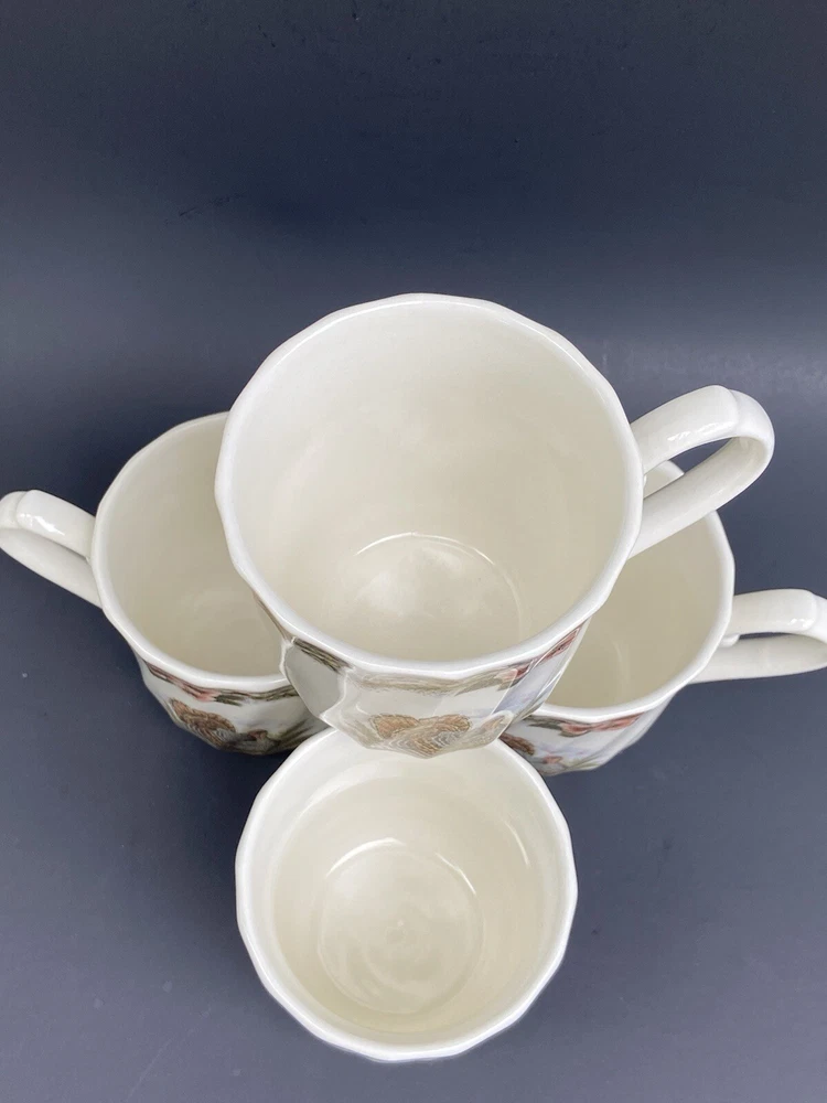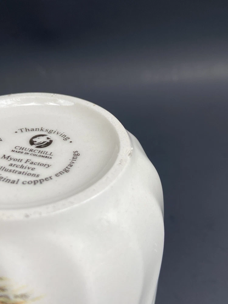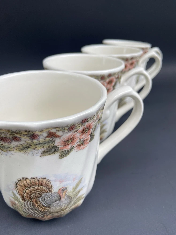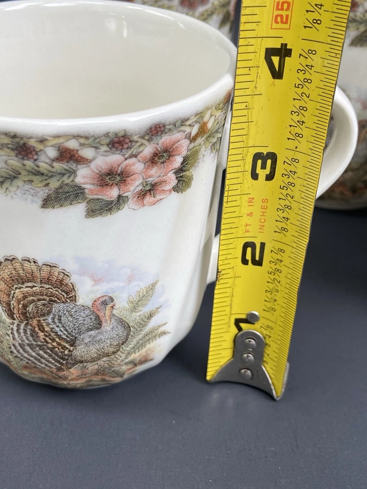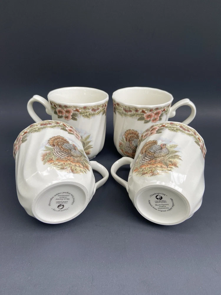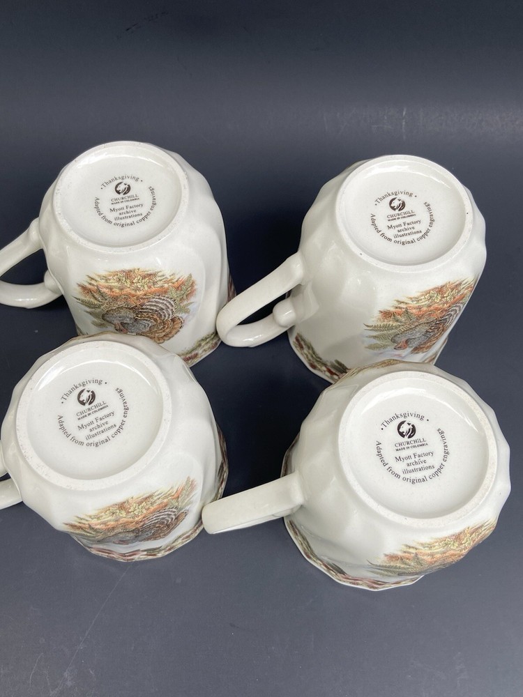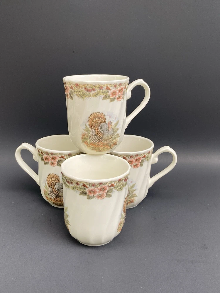 4 Churchill Myott Thanksgiving Tea/Coffee Mugs Turkey Floral Swirls NEW. Approximately diameter of 3.25 inches wide, height 3.75 inches tall and capacity of approximately 10 US fluid ounces. All are unused, glossy and no signs of wear; no surface scratches. No chips, no crazing, no cracks nor chips noted. All of the pictures were taken in natural daylight to capture the closest actual shade of color; however and in person, the mugs might be slightly brighter or darker than the photos due to camera’s autofocusing features. The set weighs approximately 2 pounds and 2 ounces without packaging material. Will package with great care and thank you kindly for your consideration. REASONABLE SHIPPING: Calculated shipping: Weight and distance based shipping via USPS Ground Advantage domestically USA from South Florida. USPS Ground Advantage is lowest shipping cost. Estimated delivery of 2-8 business days. Shipping costs is based on item(s) weight including packaging materials and the distance from the seller’s zip code to the buyer’s zip code. Buyers whose shipping address/zip code is in the East coast of USA tend to have higher shipping costs as distant is longer from seller’s South Florida zip code. Ships globally via Ebay International Shipping Delivery.
