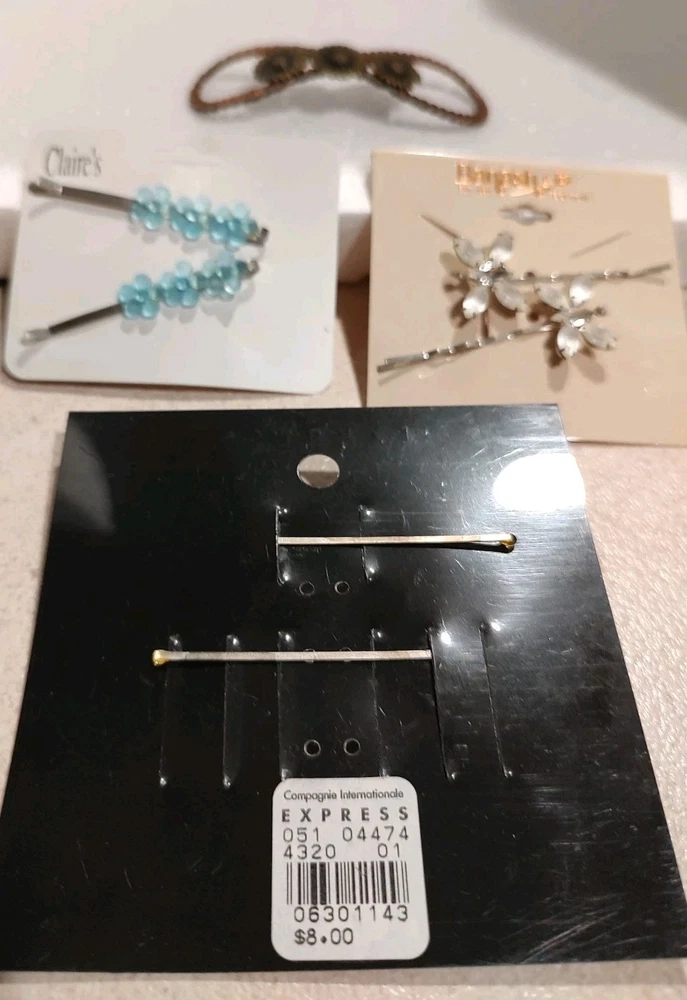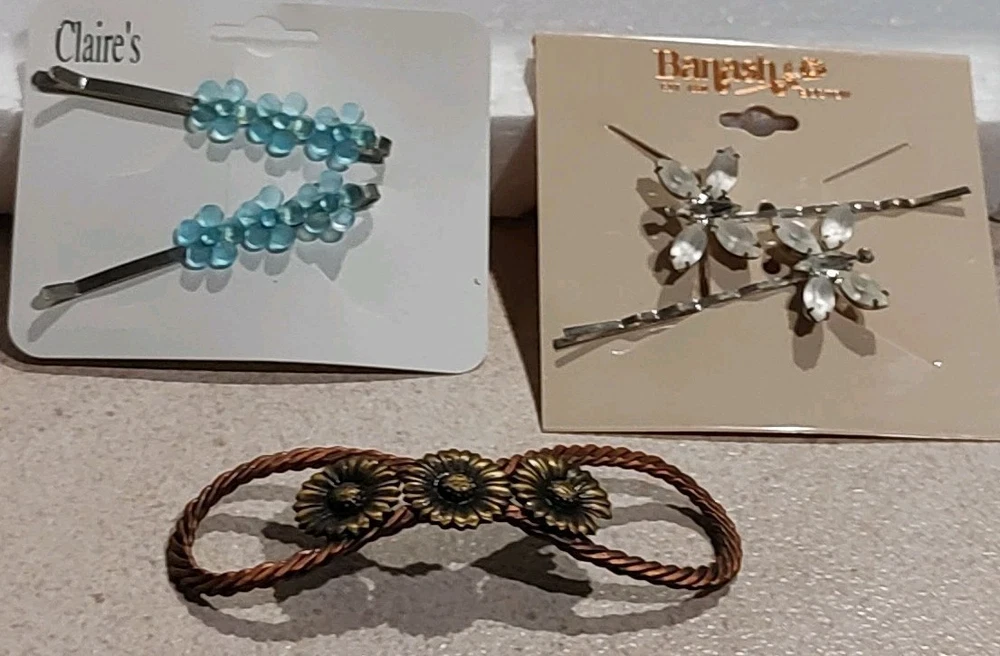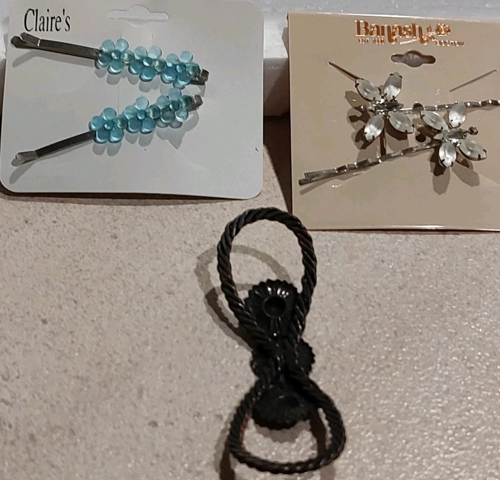 Add some floral beauty to your hair with this lot of 4 hair pins from Express, Banash, Claire, and cohors. These pins are perfect for any hair type and feature a retro crystal flower design with rhinestone accents. The pins are made of metal and plastic and are eco-friendly. These hair pins are unisex and can be personalized to suit your style. They are perfect for adding a touch of glam to any outfit and are great for special occasions or everyday wear. Get ready to express your personality with these stunning hair pins from Express, Claire, Banash and Cohoes