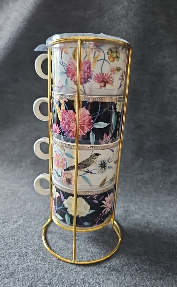 4 New Grace Teaware Fine Porcelain Stacking 12oz Floral/Birds Coffee Mugs & Rack