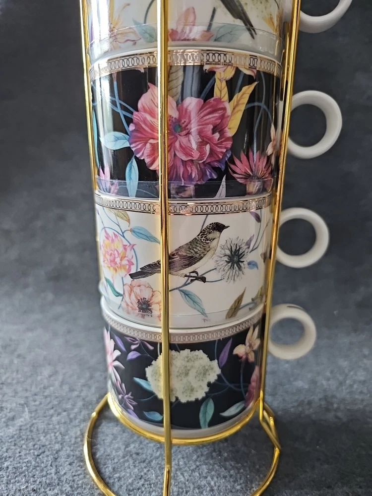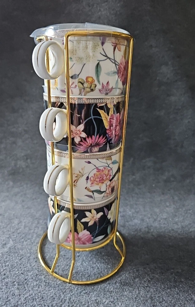 Enjoy your coffee or tea in style with these 4 stackable mugs with gold metal organizing display holder from Grace Teaware. The contemporary design features a beautiful floral and bird pattern, perfect for any occasion. The round shape and shiny finish add to the elegant appearance, while the handle allows for easy and comfortable use. These mugs are perfect for hot beverages and have a convenient storage rack. They are machine washable and dishwasher safe, making them easy to clean and maintain. The date-lined design adds a touch of sophistication, and the multi-color palette is sure to impress. Whether you're a coffee or tea lover, these mugs are a must-have addition to your collection.