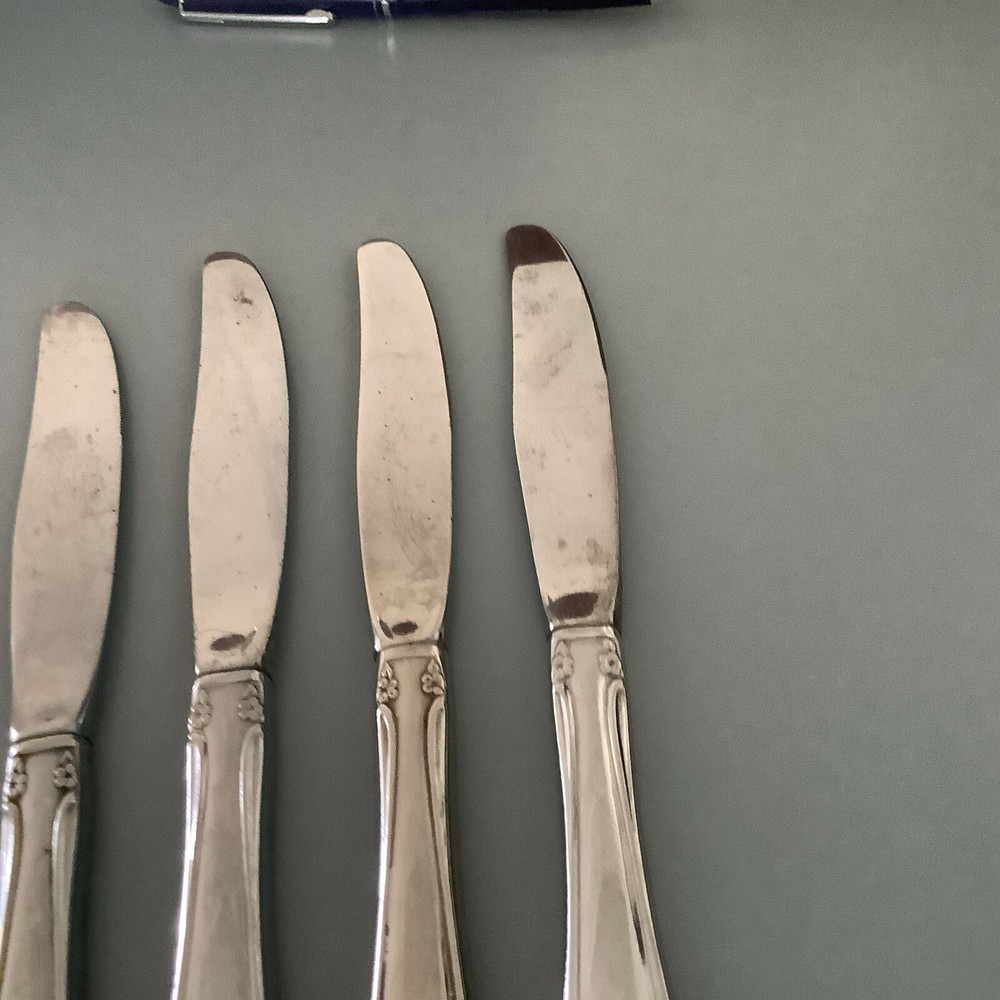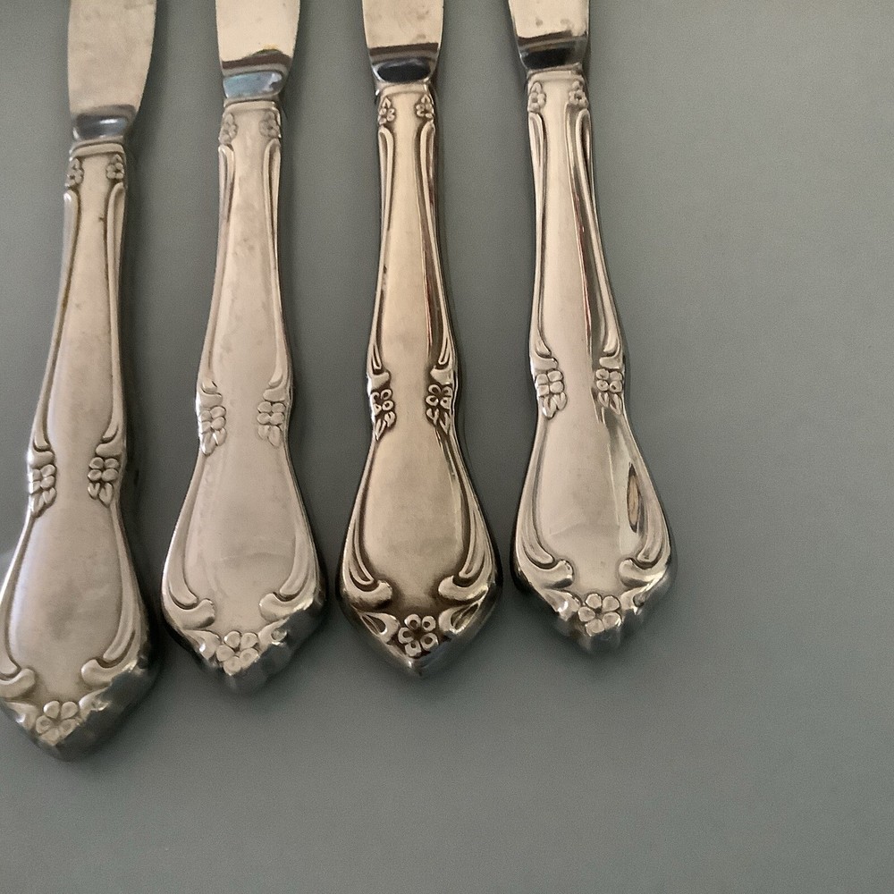 You are getting 4 dinner knives they are in good used condition with every day uses. And scratches and they are about 8 1/2 inches long.