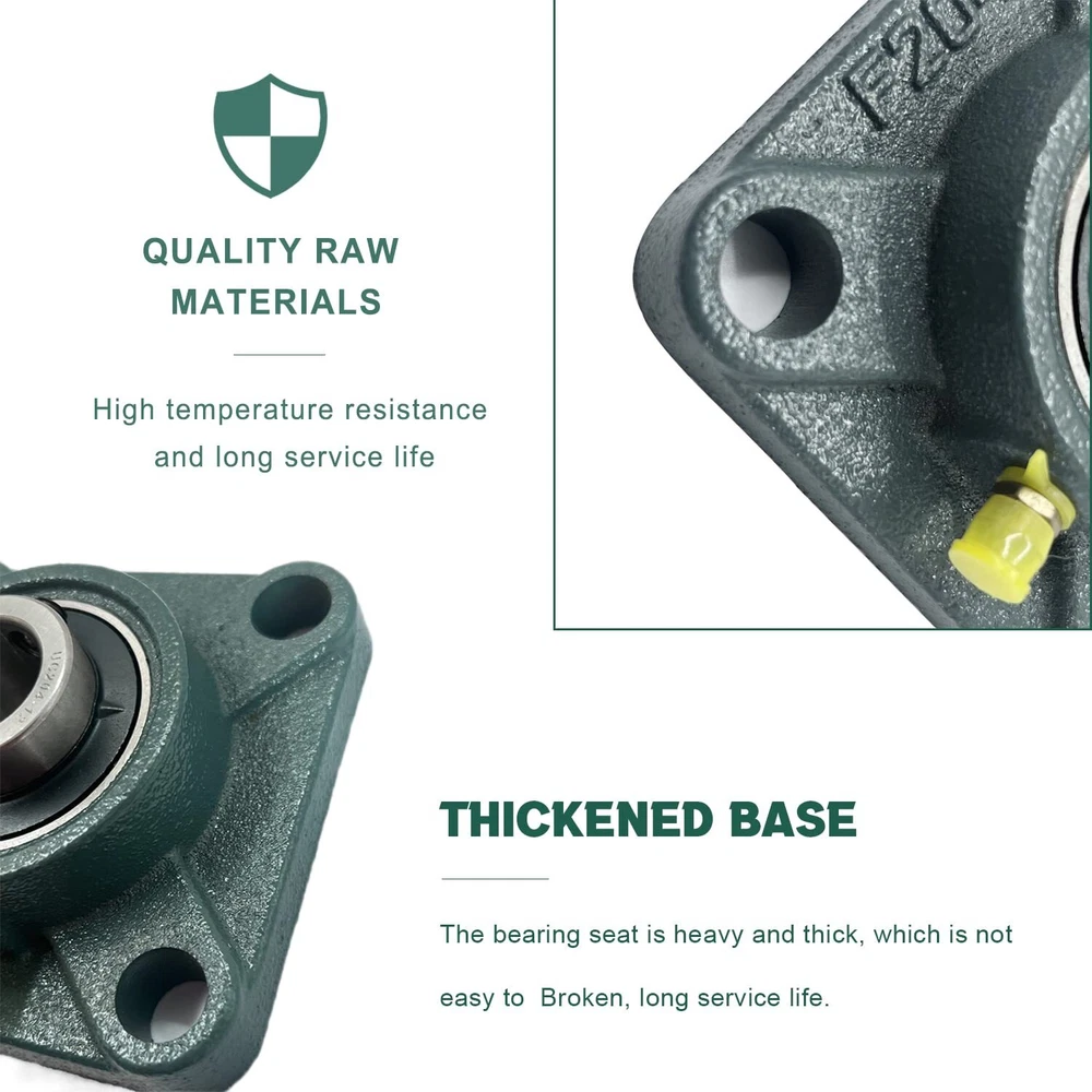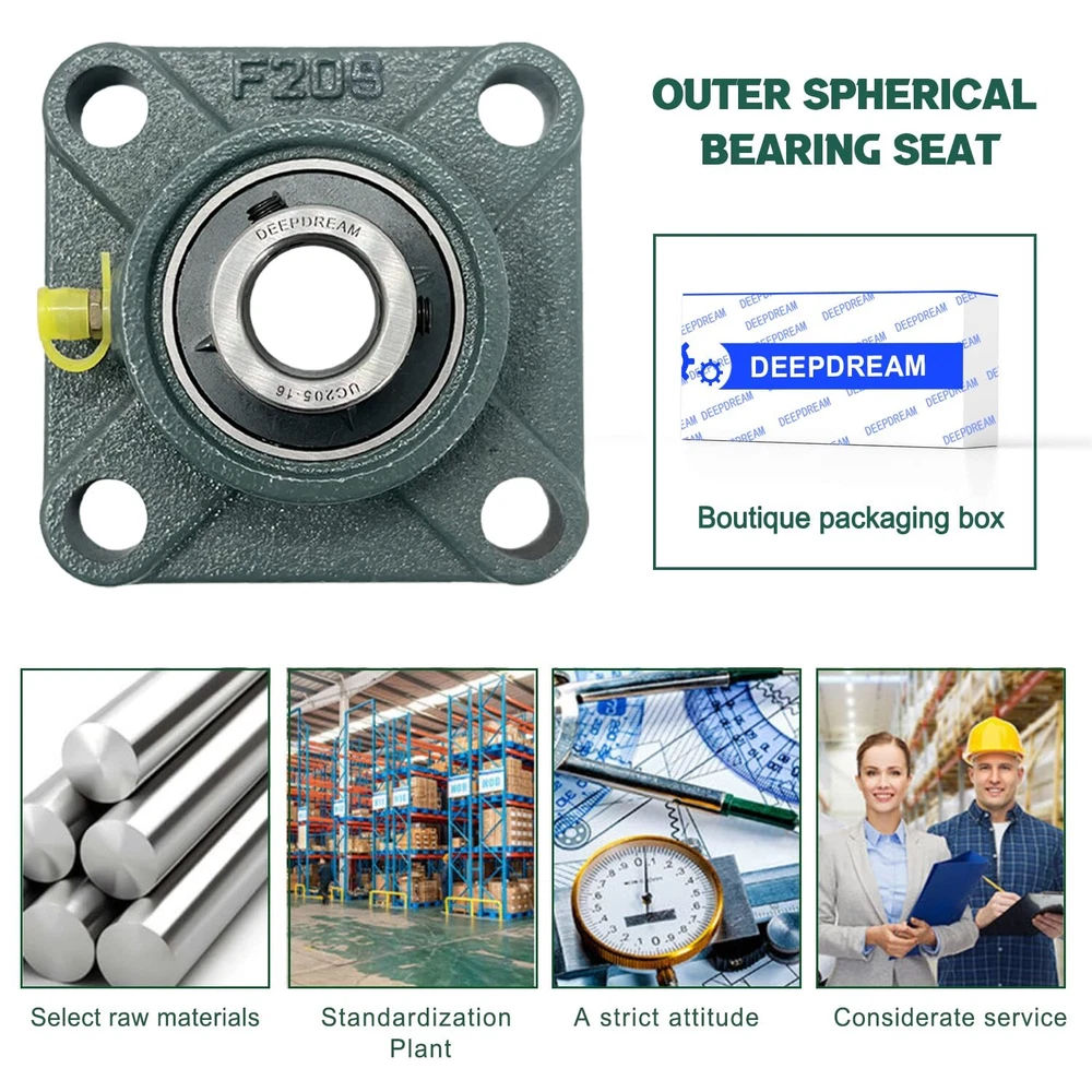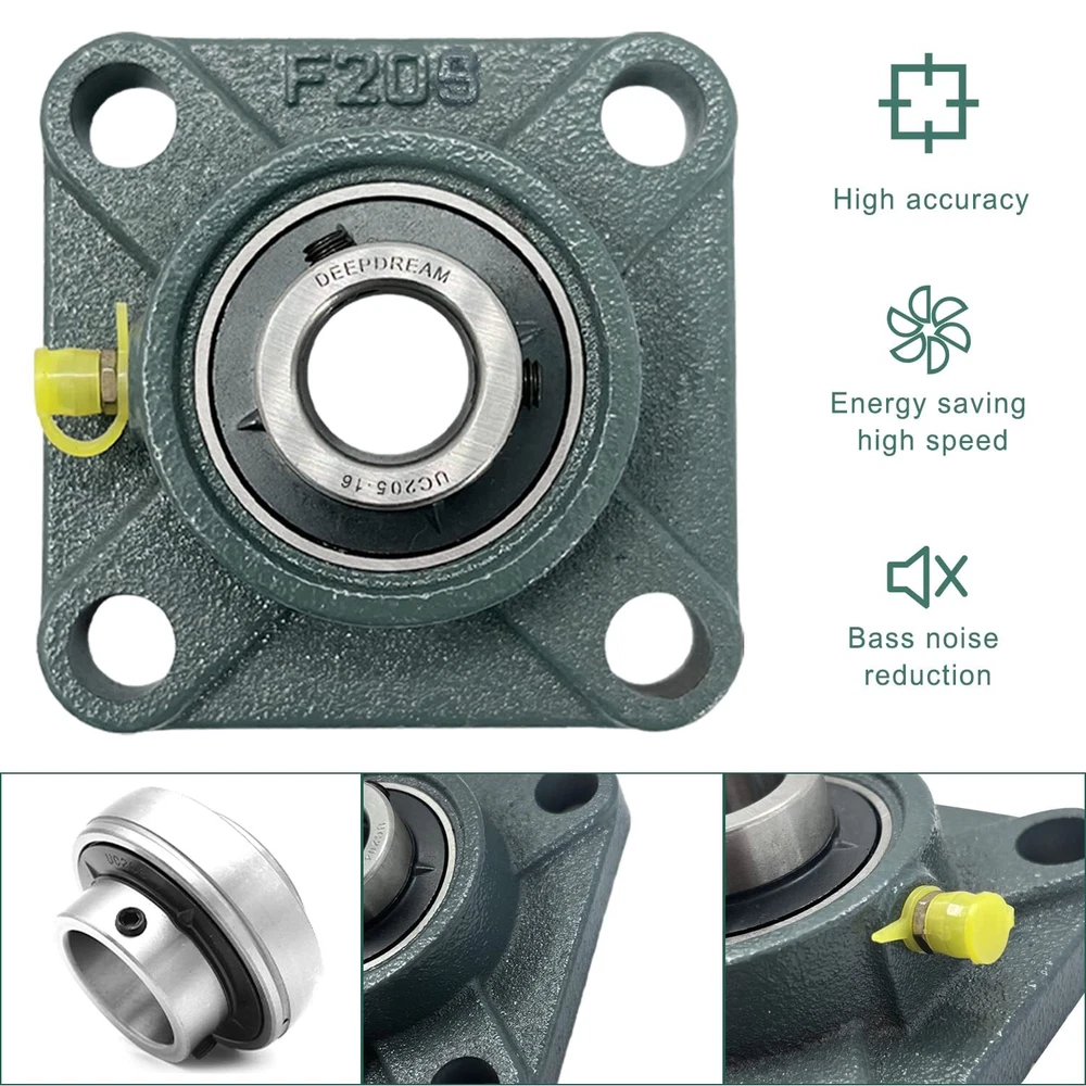 The UCF205-16 pillow block mounted bearing with a 3/4" inside diameter, four bolt holes, and a set screw lock is designed for mounting onto bearing surfaces parallel to the shaft axis, such as conveyor belts. This ready-to-mount unit has a cast iron housing, chrome steel bearings, and is designed for efficient operation at a wide range of speeds. Overall Height51.2mm Overall Length130mm Overall Width130mm SeriesUCF StandardsISO, AFBMA Locking TypeSet Screw Bolt Size1/2" Bore Dia.1-1/2" Static Load Capacity4069 lb. Dynamic Load Capacity6631 lb. Bearing Insert TypeBall Bearing LubricationShell Alvania RL2 or NLGI #2 Equivalent High Premium Quality 100% Satisfaction Guarantee *Colors may vary based on availabilityThe bearing is secured to the shaft with set screws to prevent slippage and the housing requires four 3/8” bolts (sold separately). This mounted bearing is used in industrial manufacturing, food and beverage manufacturing, and in the textile industry. Mounted bearings combine a bearing mounted inside a housing unit. The bearing housing replaces the need for a casting or weldment to position the bearing securely for reliable operation, and its design determines the type of insert bearing. Insert bearings use rolling elements (ball, cylindrical, spherical, barrel, needle, spindled, or tapered) to maintain the separation between moving parts to reduce rotational friction, and to support radial and axial loads. Available in a variety of materials and mounting configurations, mounted bearings can be one- or two-piece, they can have an extended inner ring and locking device, and they can have seals and end caps that retain lubrication and protect the working parts of the bearing from environmental debris. Mounted bearings support shafts in a variety of mounting configurations (flange block, hanger, pillow block, and take-up block), and are used in a range of applications from ligh ISO 9001:2008 CERTIFICATE Chrome Steel (AISI 52100) Ball Bearing for higher resistance and durability Self Aligning Feature Our high-quality bearing is made to reduce your replacement frequency and maintenance cost 1" inside diameter fits conventional cylindrical shafts