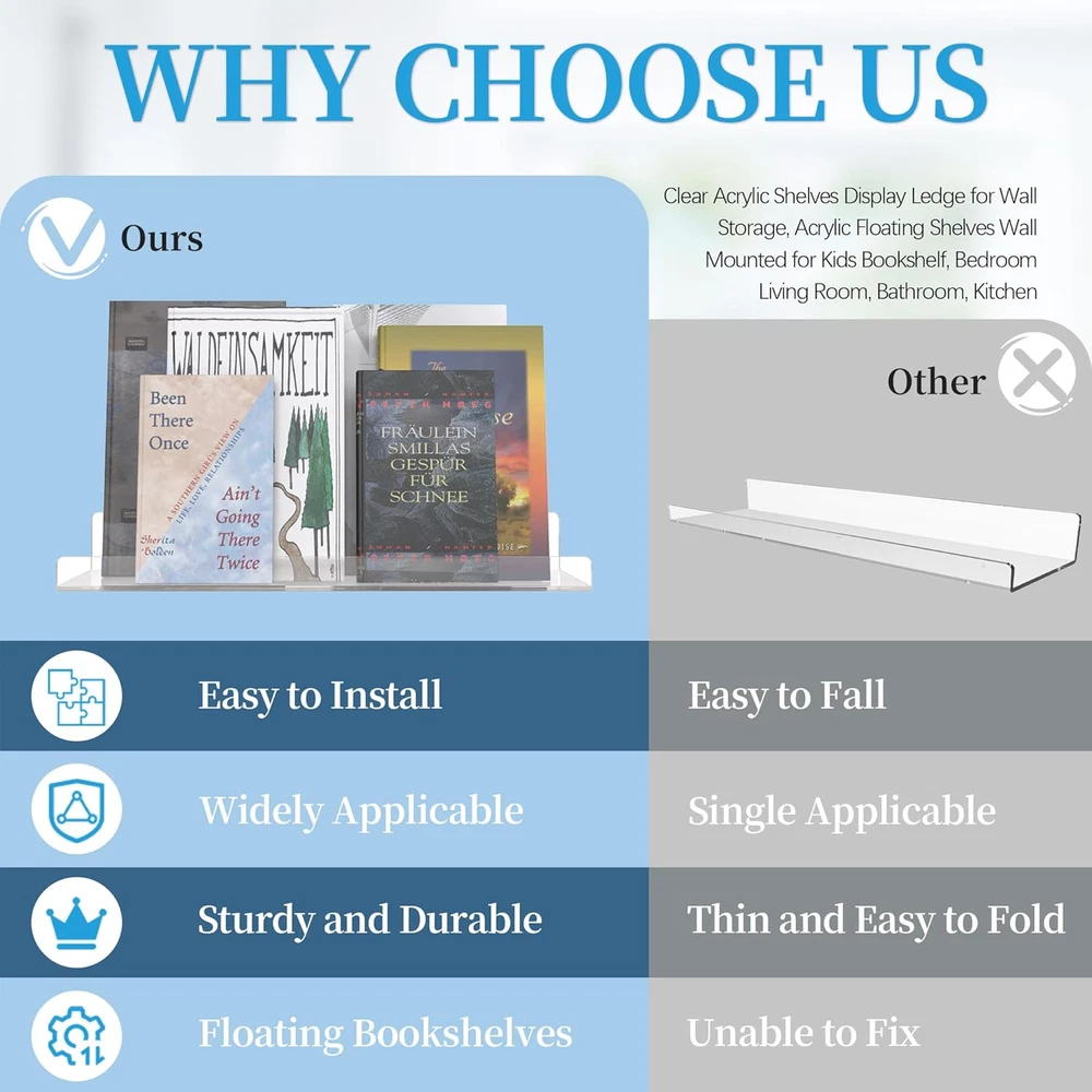 Store New Arrivals Add to Favorite View Feedback Contact 4 Pack 15'' Clear Acrylic Shelves for Wall Mounted Display Ledge Storage Racks Description Style Modern Number of Items 4 Country of Origin China Room Type Office, Bathroom, Bedroom, Study Room Assembly Required Yes Product Dimensions 15"D x 4"W x 1.88"H Installation Type Wall Mount Age Range (Description) Adult Material Acrylic Mounting Type Wall Mount Specific Uses For Product Decorative Items, Kitchen Utensils, Plants, Books Manufacturer Hmdivor Item Package Quantity 4 Product Name Bedroom, Study Room Back Style Backless Item Weight 2.78 pounds Number of Shelves 4 Special Feature Space Saving Shelf Type Floating Shelf Shape Rectangular Recommended Uses For Product Bathroom, Kitchen, Living Room, Bedroom Included Components Installation Instructions, Screwdrivers, Screws, Non-marking Stickers, Screw Expansion Tubes Brand Hmdivor Product Care Instructions Wipe with Dry Cloth Size 15 inch Space Saving: The acrylic shelves can turn the neglected wall into a multi-level storage space, which not only increases your storage space, but also makes your room look more tidy and clean.First Available Date: 4th July, 2023 Easy to install: The 15"X 4"X 1.88" acrylic shelves not only have complete accessories (accessories include screwdrivers, screws, non-marking stickers, screw expansion tubes), but also come with instructions. We provide you with two installation methods, you can choose the method you want and follow the steps to install Easy to clean: The smooth surface of the clear shelf is not only difficult to get dust, but also when you need to clean it, you only need to wipe it with a rag or paper towel to make it look brand new Beautiful and stylish: The transparent color of the acrylic floating shelves complements the popular minimalist style, it can add a stylish charm to your room, and it can also keep your room organized Wide range of uses: The acrylic wall shelves are suitable for displaying figures, books, CDs, certificates, condiments, cosmetics, photo frames, suitable for installation in your study, living room, kitchen, bathroom, etc. in every place you want Product Description Compare these products Add to Cart Add to Cart Add to Cart Add to Cart Customer Reviews 4.2 out of 5 stars 254 4.2 out of 5 stars 254 4.2 out of 5 stars 254 4.2 out of 5 stars 254 Price $14.99 $ 14 . 99 $18.99 $ 18 . 99 $26.99 $ 26 . 99 $34.99 $ 34 . 99 Quantity 4 Pack 6 Pack 8 Pack 12 Pack Size 15 IN 15 IN 15 IN 15 IN Color Clear Clear Clear Clear Material Acrylic Acrylic Acrylic Acrylic Install ✔ ✔ ✔ ✔ ABOUT US We offer the best prices around on high quality products. Our E-store includes media such as books, movies, music and games while offering electronics, toys, sporting apparel, clothing, tools, general home, garden items and more. SHIPPING We are always working hard to ensure your package arrives as soon as possible. Please understand that some factors like weather, high postal traffic, and the performance of shipping companies are outside of our control. We offer free shipping to the lower 48 states and ship within 2 business days of payment, usually sooner. We do not accept P.O. Boxes. Please provide a physical address. RETURNS We offer a 30-Day Return Policy on items which you are not completely satisfied with. You have the option for a full-refund or an exchange of the item. No returns are available on items shipped outside of the USA. PAYMENT We accept PayPal. CONTACT US This page content is yet to come Please ad us to your favorite seller and visit again later Thank You CUSTOMER SATISFACTION We try our very best to make sure every customer is completely satisfied. If there's a problem, message us! We're happy to help.