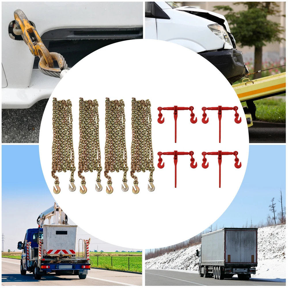 4 Pack 5/16"-3/8" Chain and Binder Kit Ratchet Load Binder w/ 4x 20ft Chains NEW Chain and Binder Kits Ratchet Load Binder 5/16''- 3/8''+20ft Chains 4 Set Pack Description The high-quality ratchet binder and chain set made of high-quality 45 gauge steel is ideal for hauling and tying cargo. The upgraded ratchet gears, rings, and hooks not only increase the strength and load-bearing capacity of the product but also extend its service life. Buy this ratchet and chain set to make hauling goods easier and safer. Specification Material: 45 Steel Color: Red, Gold Hook Rating: G70 Process: Die-forging, Casting, Spraying, Precision Milling Gross Weight: 55kg/121.25lbs Net Weight: 53kg/116.84lbs Package Size: 40*41*20cm/15.75*16.14*7.87in Rated Pulling Force: 5400lbs Test Pulling Force: 10,800lbs Breaking Tension: 19000lbs Handle Length: 35.3cm/13.42in Chain Length: 6m/20ft Chain Diameter: 0.78cm/5/16in Package Included 4*Ratchet Binders 4*Chains Key Features High-quality Materials : The ratchet binder and chain are made of strong, wear-resistant 4 5 steel, which provides excellent durability for the product. Strong Connecting Ring : The high-strength hanging ring forged from 45 steel is very strong and solid to effectively prevent falling off. A strong connection ring can effectively avoid accidents. Upgraded Gears : The ratchet gears are made of exquisite forging and fine milling process to make them have excellent performance of high strength, not easily deformed and durable. At the same time, the flexible ratchet wheel is adjustable and tight to adapt to different scenarios. Excellent Loading Capacity : The ratchet chain set has an excellent loading capacity of 5400 pounds and a breaking pull of 19,000 pounds, making it excellent for most industrial jobs. Labor-saving and Safe : The ratchet binder has a 13.42'' long handle that provides extra leverage, which makes it easier for you to operate with less effort. And the ratchet gear and pawl prevent you from danger when loading and unloading. Easy to Use : The 360° rotatable pawl engages easily with the chain to smoothly lift heavy loads. The smooth ratchet gear and pawl design tighten the chain and hold the load faster. Long Service Life : The ratchet binder uses a superb spraying ,casting and die-forging process to make it wear and corrosion-resistant , which enables it to withstand harsh weather conditions. The superb craftsmanship greatly extends the product's life. Customer Service : We aim to provide quality products and services. If you have any problems, please feel free to contact us. We will reply and solve the problem for you as soon as possible. Details Extended Galvanized Chains : The extended chain (20 feet long) allows for a wider range of hauling of goods, which is more convenient and fa ster. The surface of the chain is galvanized so that the product has better corrosion resistance and wear resistance , w hich extends the service life. High-strength Nuts : The nuts are processed with special treatment to make them high-strength and durable. They will not be deformed or damaged even after a long time of use. Application They are ideal for strapping, recording, securing, and pulling loads for most industrial applications such as factories, warehouses, garages, and docks. Notes 1. Develop good lifting habits, and plan how to hang, lift and unload before the lifting work starts. 2. Make preparations: determine the weight and center of gravity of the object to be lifted and mark the lifting and weight data. Only after the center of gravity is determined can the hook be hung in the proper position. 3. The crane operator should be informed of the weight of the object to be lifted. 4. The crane hook should be hung vertically above the center of gravity of the object to be lifted. 5. The lifting object is to be lifted in such a way as to avoid damage to the lifting object, damage to the rigging itself, rotation, or dropping. The following conditions need to be observed to ensure safe lifting. 5.1 For single-leg rigging, the lifting point should be vertically above the center of gravity of the object being lifted. 5.2 In the case of double-legged rigging, the lifting point should be located on both sides of the lifting object, with the lifting point above the center of gravity. 5.3 In the case of three-legged and four-legged rigging, the lifting point should be evenly located at the level of the center of gravity of the lifted object and above the center of gravity of the object to be lifted. 6. This product is only suitable for binding and tightening, not for high-altitude hoisting. 7. Pleas e allow the slight color difference caused by the shooting light and 1-3cm error due to manual measurement. Please make sure you do not mind before you order. Payment Delivery details Terms of sales About us Contact us Payment We accept ebay payment 。 Fees such as import duties, taxes are not included in the item price or shipping costs. These charges are the buyer's responsibility. Delivery details Shipping: 2-9 working days to: USA Terms of sales We maintain high standards of excellence and strive for hundred percent customer satisfaction. Feedback is very important to us. We hope that you contact us immediately before you give neutral or negative feedback, so that we can address your concerns. It is impossible to address issues if we do not know about them! About us Your satis faction is our ultimate goal. We work hard to earn your trust and future business. Our certified technicians have tested each item before shipping. The unit comes with 1 year limited warranty on all manufacturing defects. a) If you receive a defective item, you may return it or ask for a discount. Please contact us within 14 days after you receive the package. b) What you returned must be intact and in its original packaging as re? u. Customer is responsible for shipping costs of the returned item. c) We will cover the cost of shipping back t with the shipping rate indic