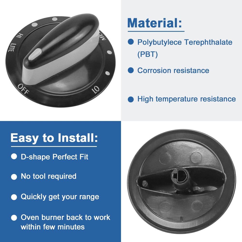 4 Pack 74011287 Gas Range Burner Knob Black with Maytag Gas Stove knobs AP410... PARTS NUMBER: Surface Gas Range Burner Knob WP1287 Range Top Burner Control Knob WIDE APPLICATION: The 74011287 surface burner control knob is suitable for D-shaft, General Electric stoves/ranges. It is equivalent to part number 74011287, 74007794, 1188854, AH2088607, EA2088607, PS2088607, WP74011287, LP12776 HIGH PERFORMANCE: The 74011287 cooktop burner knob can increase the service life and heat insulation of the knob, ensuring easy installation and good operation,The appliance this part fits is also referred to as a stove, oven, cooktop, wall oven, or range oven. It is a non-original after-sales part, but it meets OEM standards. Quality is strictly guaranteed COMPATIBLE MODELS: JGC6430ADB, MGC5430BDB, MGC5430BDB20, MGC5430BDS, MGC5430BDS20,MGC5536BDB, MGC5536BDB21, MGC5536BDB22, MGC5536BDS, MGC5536BDS21, MGC5536BDS22, MGC5536BDW22, MGC6430BDB,MGC6430BDB19, MGC6430BDW19, MGC6536BDB, MGC6536BDB20, MGC6536BDW20 etc EASY TO SET: The 74011287 stove knob is made of heavy-duty material. The 74011287 control knob is black Possible Repair Solution For: the oven knob teeth are worn out ; the knob is off ; the knob does not rotate anymore, you need to replace the high-quality knob. The 74011287 knob is easy to install, just unplug the 74011287 knob of the refrigerator, and it can be repaired without any tools 74011287-4PACK Shipping We offer FREE shipping on all orders! We ship within Three business days of payment, usually sooner. We use a selection of shipping services such as UPS, FedEx, USPS etc. We only ship to the lower 48 states, no APO/FPO addresses or PO Boxes allowed. Local pickups and combined shipping options are not provided at this time. Return You can return a product for up to 30 days from the date you purchased it. Any product you return must be in the same condition you received it and in the original packaging. Please keep the receipt. Payment We accept payment by any of the following methods: PayPal Please pay as soon as possible after winning an auction, as that will allow us to post your item to you sooner! Feedback Customer satisfaction is very important to us. If you have any problem with your order, please contact us and we will do our best to make you satisfied. Contact Us If you have any queries, please contact us via ebay. We usually respond within 24 hours on weekdays. Please visit our eBay store to check out other items for sale! Thank you for shopping at our store.