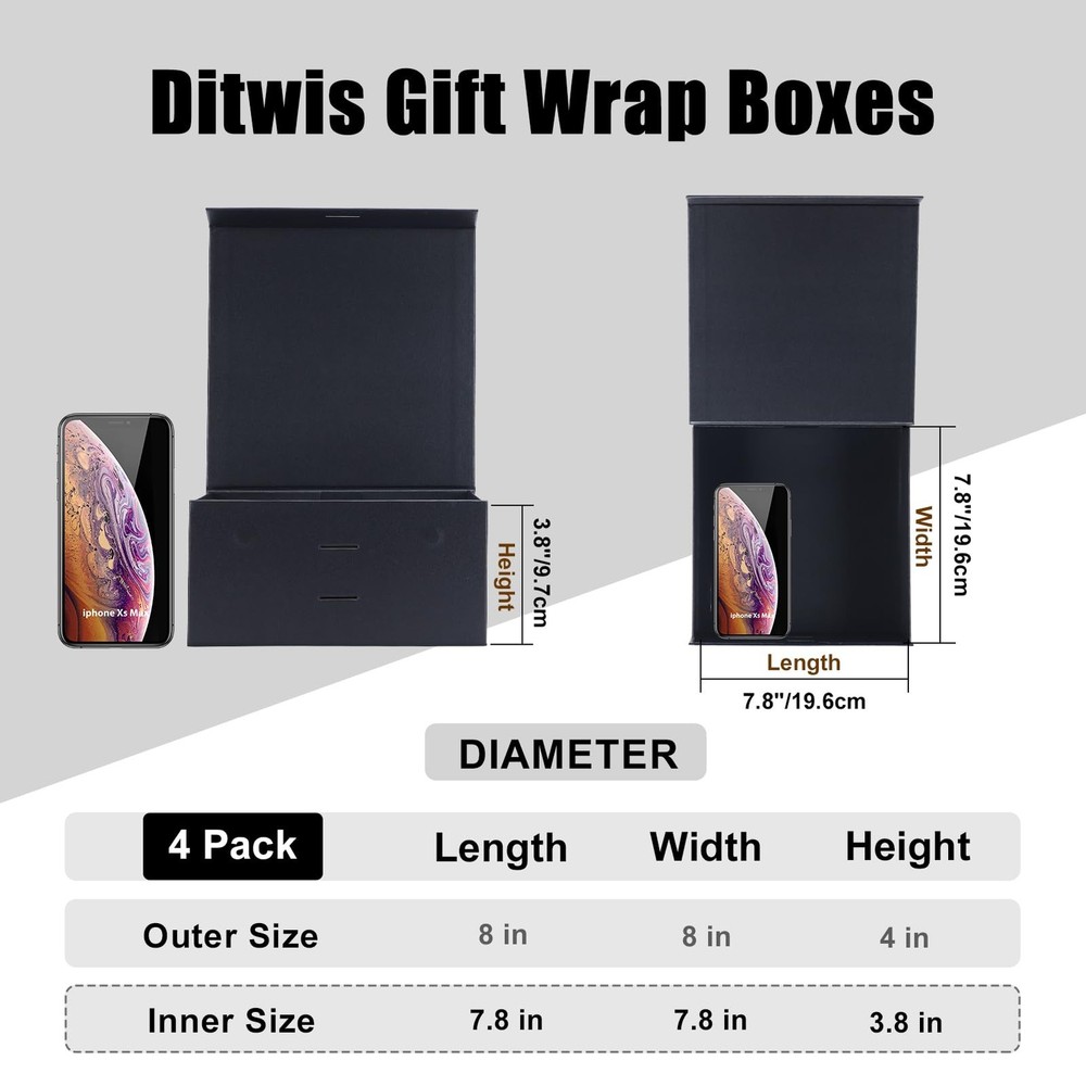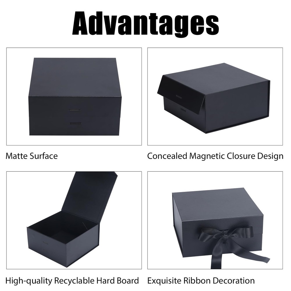4 pack black 8x8x4 elegant and classy gift boxes with magnetic closure lids are chic, sturdy, well-made, quick and easy to assemble, and can be reused. The small black box for gifts is easy to use and is prettier than a regular cardboard box. The fine matte texture adds a touch of class to the magnetic box for gifts. The ribbon that comes with is also great as a secure closure. These affordable gift boxes have a foldable design for easy storage, transportation, and saving space, tear off the white triangle sticker to easily assemble and glue the box. Brand: Item form: Box Occasion type: Birthday