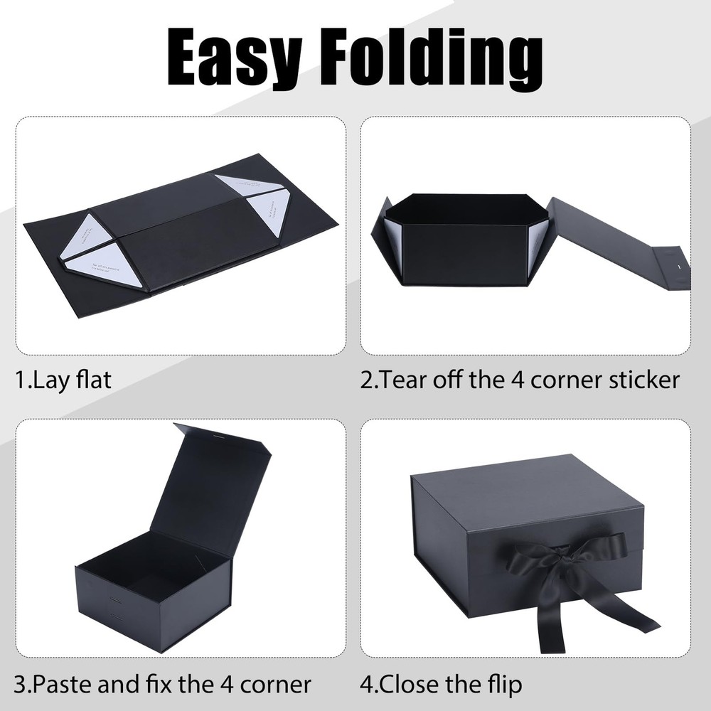 These boxes are absolutely stunning! The magnetic lids feel so luxurious and secure, and the matte black finish looks incredibly elegant. Assembly is a breeze—just fold and they're ready. I love that they come with ribbons for an extra polished touch. Perfect for special gifts and so reusable!