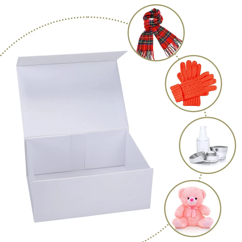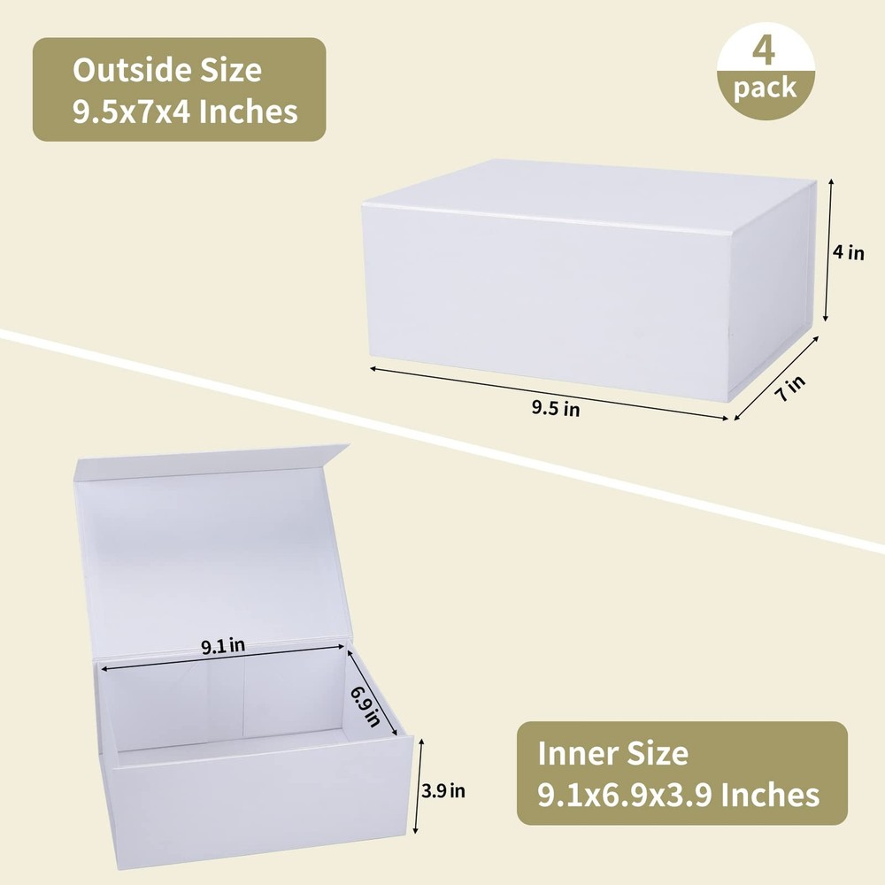 white gift box with magnetic closure lid 9.5x7x4 Inches pack of 4 Fashionable and Elegant: These cardboard gift boxes have glossy pearl white texture. The beautiful sheen and elegant design of gift box will definitely add a touch to your thoughtful gifts. Quality Gift Boxes: We care about the perfect condition when you received it, therefore, its cardboard is thicker and heavier than many others! These boxes are packaged well with corner protectors, which you will have no concern that they would be damaged or dented. They have concealed magnetic closure that keeps the lid closed tightly even after repeated usage. Multipurpose Box: The gift boxes with lids can hold various gifts, such as chocolates, goodies, cosmetics, perfumes, candles, wine, sunglasses, gift cards and others, which are suitable for gift wrapping for Christmas, wedding, birthday, bridesmaids and groomsmen proposal, anniversary, Valentines Days, Mothers Day, Fathers Day and more. It also can be storage box to keep your personal stuff and keepsakes well. Easy to Use: These magnetic gift boxes are foldable, comes with triangle stickers and magnetic clourse system. They arrive folded flat and pop into shape easily. Dimension Tips: The outside dimensions of collapsible gift box is 9.5 x 7 x 4 inches and the inside dimensions will be slightly smaller.