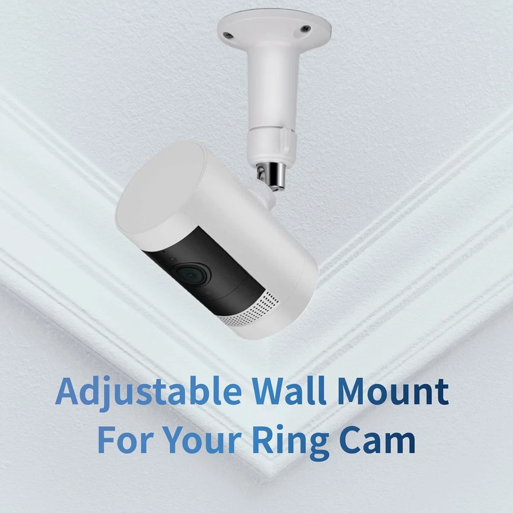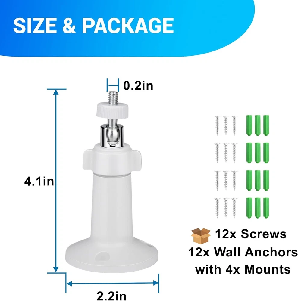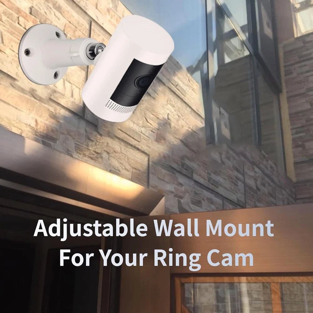 4 Pack Adjustable Wall Mount for Ring Stick Up Cam Wired/Battery and White Product Details Item Depth: 4.1inches tall, 2.2inches wide Mounting Type: Wall Mount Manufacturer: Whgwayq Part Number: GW-US-2 Item Weight: 5.9 ounces Package Dimensions: 4.13 x 3.9 x 3.82 inches Item model number: 4 pack Included Components: wall mount Batteries Included?: No Batteries Required?: No Color: White Brand: Whgwayq Material: Stainless Steel, Plastic Item Weight: 5.92 ounces Unit Count: 4.0 Count 【Compatibility with】: This indoor outdoor wall mounting bracket is customized designed ,stable and strong enough to hold your security camera. Perfectly compatible with Ring Indoor Cam,Ring Stick Up Cam Elite(2nd Gen), Ring Stick Up Cam Battery(3rd Gen), Ring Stick Up Cam Plug-in(3rd Gen),Ring Stick Up Cam Solar Power (3rd Gen). Also it can be used for other security cameras with 1/4” screw connector like arlo camera, wyze pan cam. 【Easy installation】:Wall Mount Bracket is equipped with screw-fixing base,make your All-new Ring Stick Up Cam stable whenever and wherever,preventing the camera from falling. You can install your ring camera on the wall, ceiling and anywhere you want(Ring camera is NOT included). 【Resistant and Waterproof 】: indoors and outdoors using, can be long-term use, value-for-money enjoyment. : Made of sturdy Aluminum and ABS plastic material,oxidation resistance,ideal for indoor or outdoor use. 【Resistant and Waterproof 】: indoors and outdoors using, can be long-term use, value-for-money enjoyment. : Made of sturdy Aluminum and ABS plastic material,oxidation resistance,ideal for indoor or outdoor use. 【360° ROTATION ADJUSTMENT】:The mount is easily adjustable with 360-degree swivel and 90 degree tilt.You can adjust your ring camera to any angles you want and ensure your household safety in an all-round way. 【Package Includes】 : 4x Wall Mounts, 12x screws and 12x dry wall anchors.