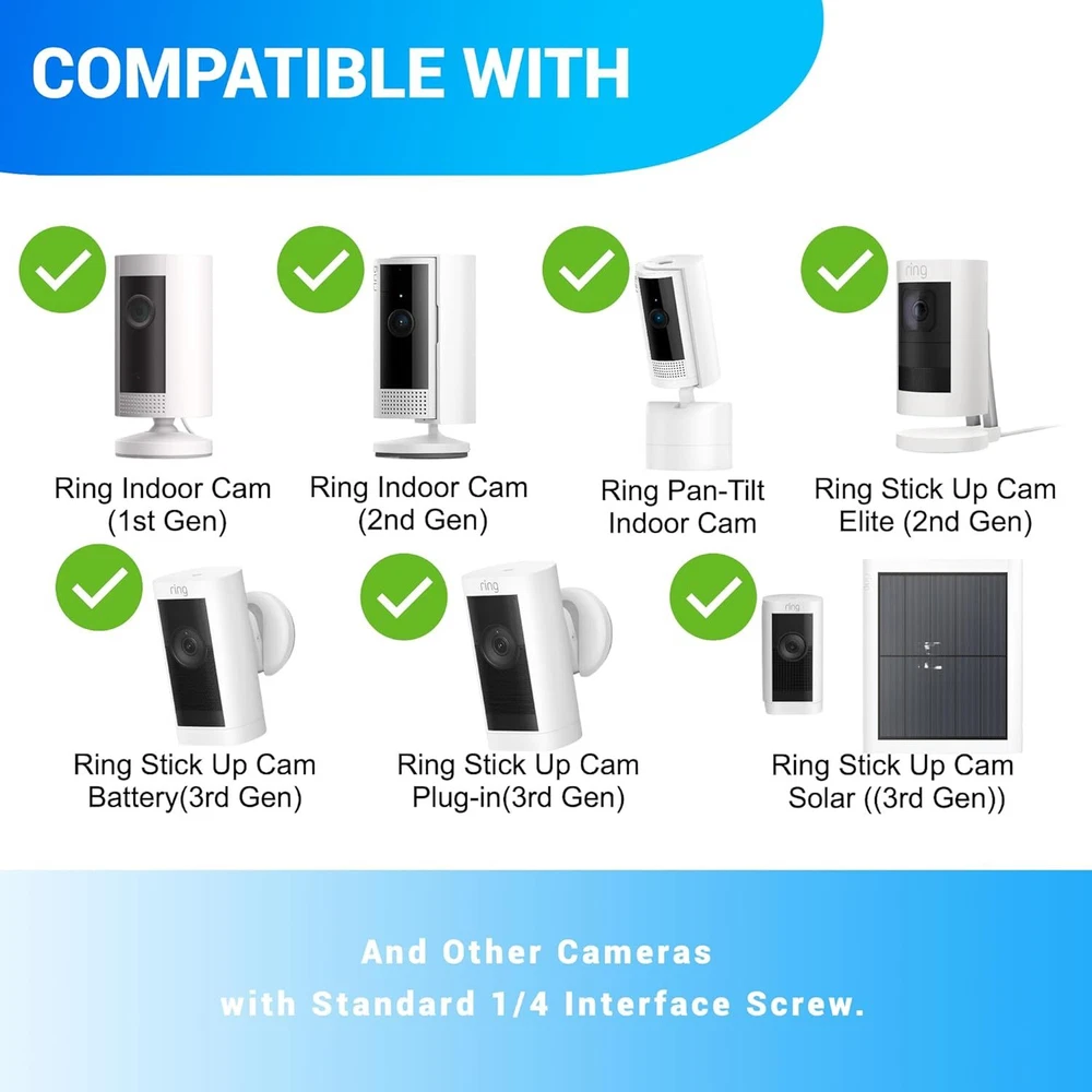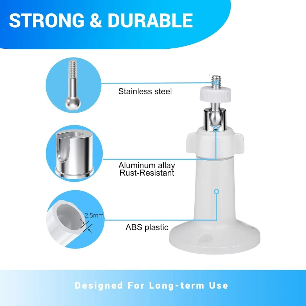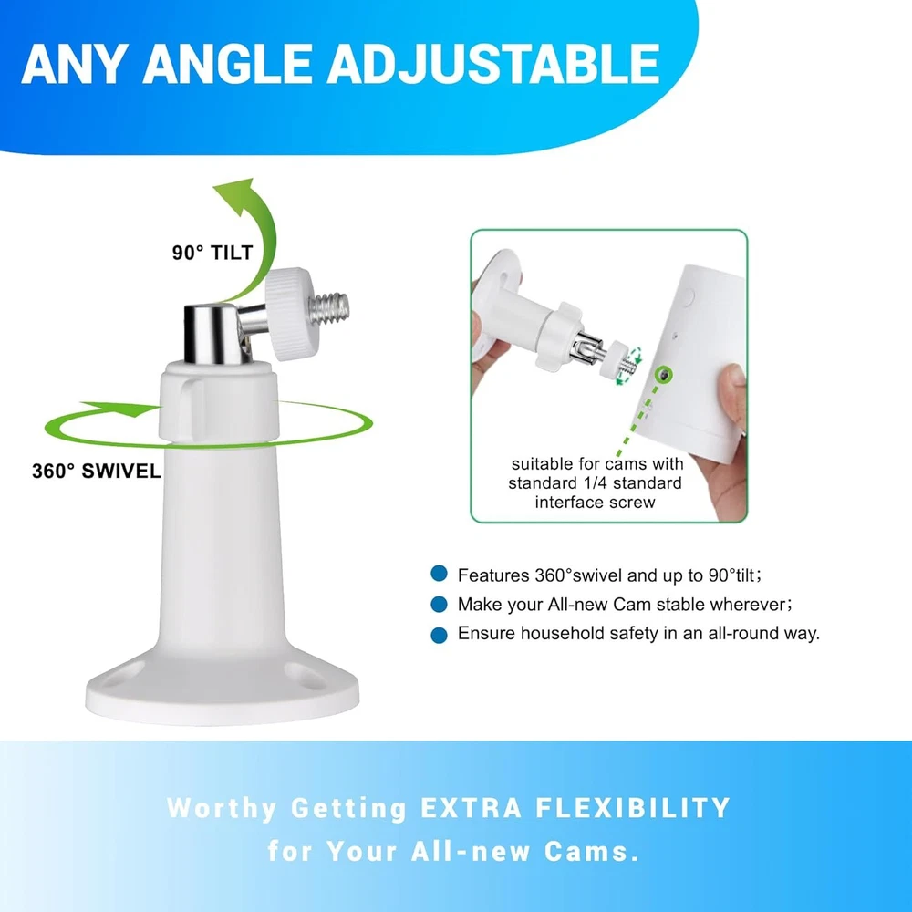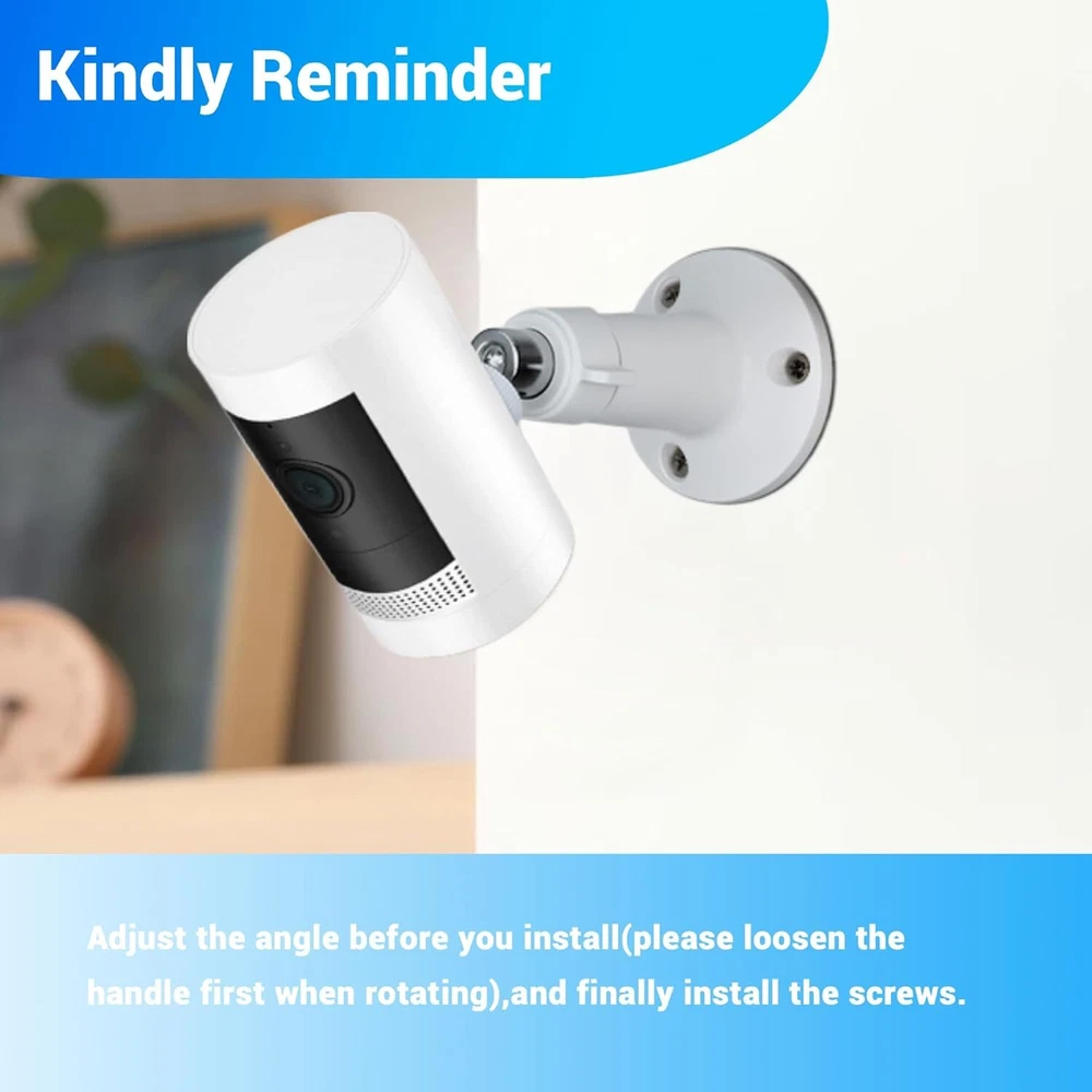 4 Pack Adjustable Wall Mount for Ring Stick Up Cam Wired/Battery and White Product Details Item Depth: 4.1inches tall, 2.2inches wide Mounting Type: Wall Mount Manufacturer: Whgwayq Part Number: GW-US-2 Item Weight: 5.9 ounces Package Dimensions: 4.13 x 3.9 x 3.82 inches Item model number: 4 pack Included Components: wall mount Batteries Included?: No Batteries Required?: No Color: White Brand: Whgwayq Material: Stainless Steel, Plastic Item Weight: 5.92 ounces Unit Count: 4.0 Count 【Compatibility with】: This indoor outdoor wall mounting bracket is customized designed ,stable and strong enough to hold your security camera. Perfectly compatible with Ring Indoor Cam,Ring Stick Up Cam Elite(2nd Gen), Ring Stick Up Cam Battery(3rd Gen), Ring Stick Up Cam Plug-in(3rd Gen),Ring Stick Up Cam Solar Power (3rd Gen). Also it can be used for other security cameras with 1/4” screw connector like arlo camera, wyze pan cam. 【Easy installation】:Wall Mount Bracket is equipped with screw-fixing base,make your All-new Ring Stick Up Cam stable whenever and wherever,preventing the camera from falling. You can install your ring camera on the wall, ceiling and anywhere you want(Ring camera is NOT included). 【Resistant and Waterproof 】: indoors and outdoors using, can be long-term use, value-for-money enjoyment. : Made of sturdy Aluminum and ABS plastic material,oxidation resistance,ideal for indoor or outdoor use. 【Resistant and Waterproof 】: indoors and outdoors using, can be long-term use, value-for-money enjoyment. : Made of sturdy Aluminum and ABS plastic material,oxidation resistance,ideal for indoor or outdoor use. 【360° ROTATION ADJUSTMENT】:The mount is easily adjustable with 360-degree swivel and 90 degree tilt.You can adjust your ring camera to any angles you want and ensure your household safety in an all-round way. 【Package Includes】 : 4x Wall Mounts, 12x screws and 12x dry wall anchors.