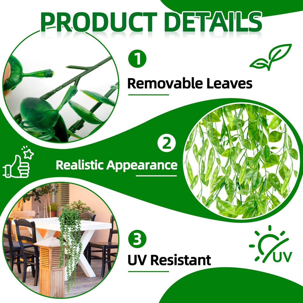 Value Pack: 4 pack different style artificial hanging plant with black pot. Our artificial floral accents will add a rich and elegant look to any decor. Size: The pot size is 3.5 "x 3.1" (W x H). The overall length of the hanging plants is approx. 22.0" for eucalyptus leaves, 21.5'' for pea pod leaves,30.1" for mandala leaves and 18.9" for string of pearls. High Material: These plants are made of a polyester/plastic blend so it's durable and easy to clean yet it has a very realistic look and texture. Indoor Decor: This delightful design arrangement is perfect for adding a natural touch to your decor without taking up table space. Wide Application: You can hang it on the wall, doors, mirror, banisters, fences, windowsill, conduit pipe, exposed electrical wiring, stairs, TV wall, and anywhere as you like with this long artificial hanging plants.