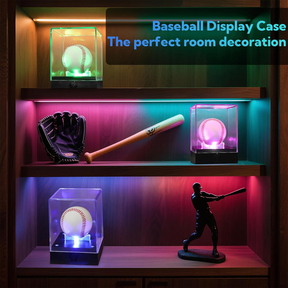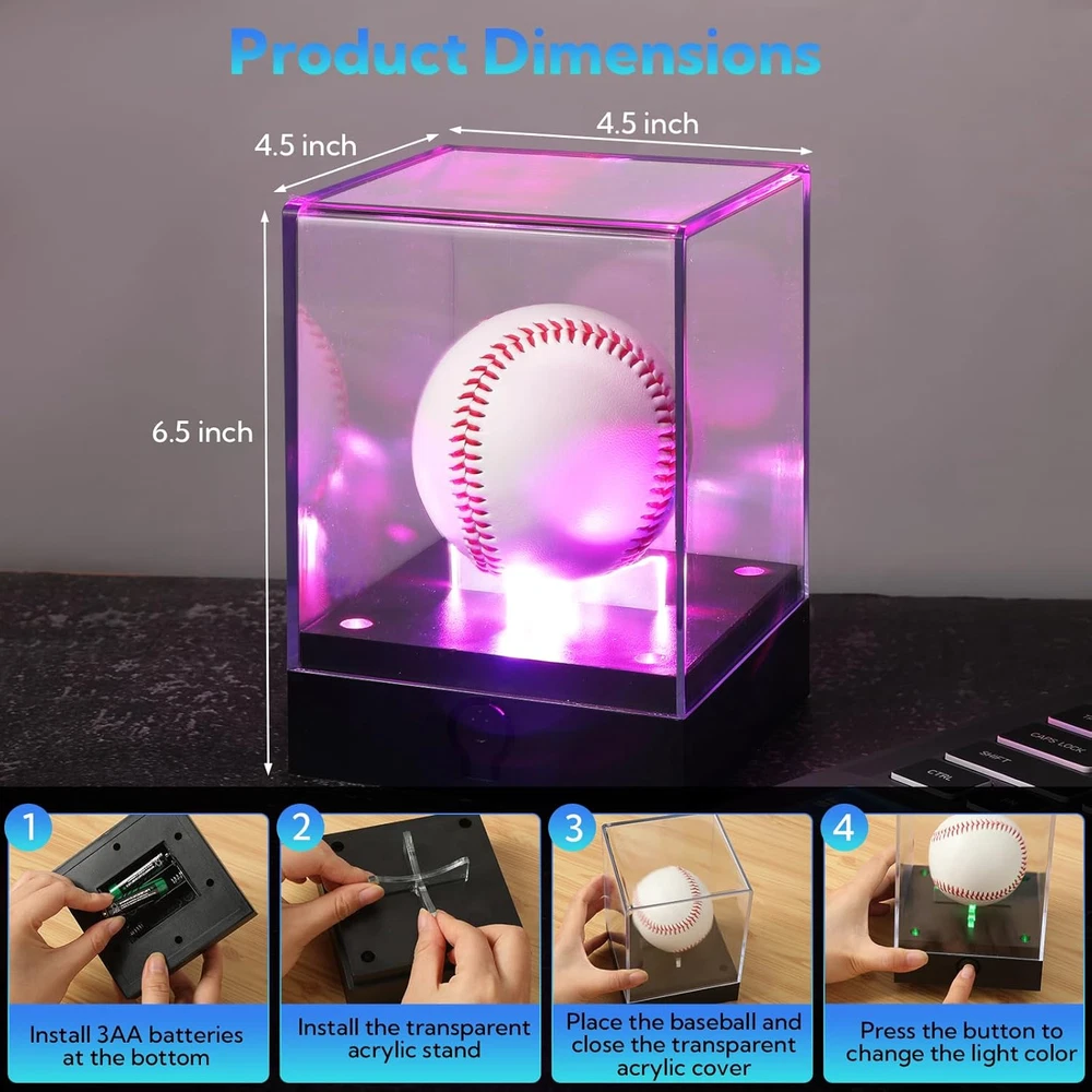 Acrylic 【 Museum-Grade UV Protection 】 Blocks 99% harmful rays to prevent autograph fading - keeps signed balls vibrant for decades unlike non-UV cases. Crystal-clear acrylic showcases every stitch detail under LED lights 【 7-Color Adjustable LED Showcase 】 Cycle static hues or dynamic color flow to match room ambiance - perfect for man caves, trophy rooms. Battery powered (3 AA ) - flexible placement anywhere 【 4X Display Power for Collections 】 Showcase signed balls, game-used softballs, championship golf balls together - ideal for multi-sport memorabilia. Stackable cubes create gallery-style exhibits 【 Pro-Grade Acrylic & Anti-Dust Seal 】 5mm thick shatterproof acrylic vs. flimsy 3mm competitors - survives bumps during fan gatherings. Tight-seal lid blocks dust from precious collectibles 【 Instant Memorabilia Gallery in 3 Mins 】 Place ball, snap lid, plug in lights - ready to impress guests. Doubles as jewelry/artifact display - versatility beats single-use holders Turn Signed Treasures into Dazzling Heirlooms - No Museum Needed! Does your signed ball collect dust in a box? Unleash the only UV-shielded display with dynamic LEDs - trusted by 1,000+ collectors to turn memorabilia into conversation centerpieces. Why Collectors Choose Us “My ’98 World Series ball FINALLY looks like a trophy!” - Coach Dave, HOF Memorabilia Club UV Defense → Stops signature fading under spotlight glare Color-Changing Drama → Cycle team colors during game nights 4 Cubes = Endless Display Magic Collection Type Pro Showcase Tip Signed Baseballs “Blue light makes ink signatures pop!” Game-Used Softballs “Green hue highlights scuff marks!” Championship Golf Balls “Rotating colors wow at country clubs!” Jewelry & Coins “Display grandpa’s watch beside his ball!” Ready to Showcase Your Legacy? 👉 [Add to Cart] - Preserve History in Style!