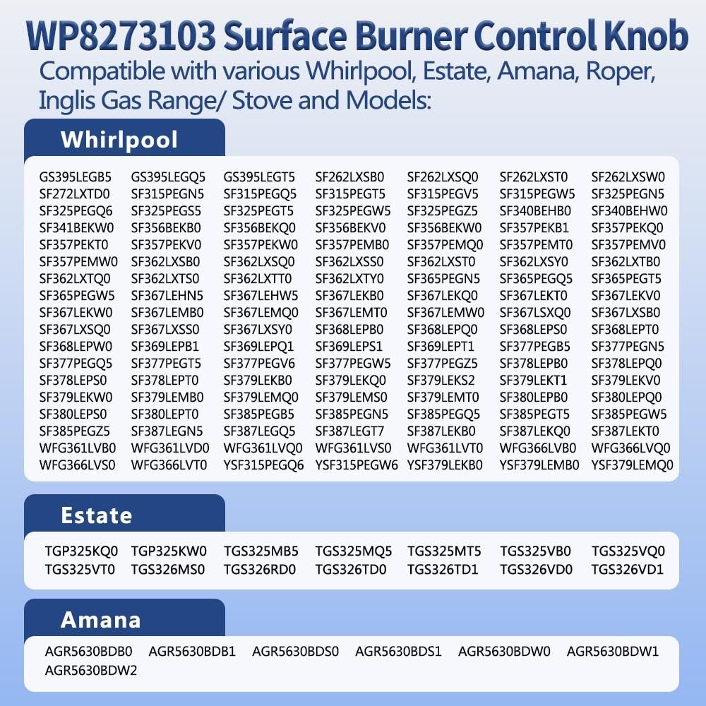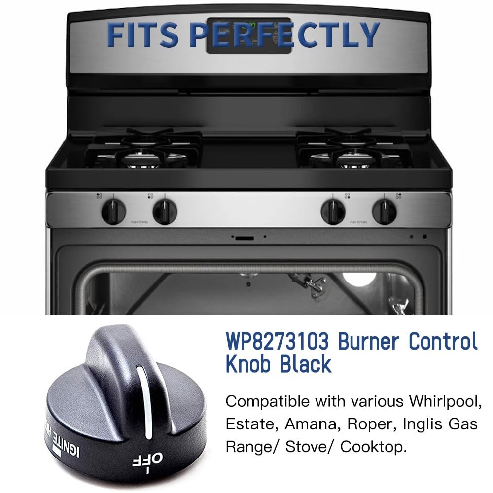 's Knobs are direct replacement for your Kitchen. This knob accepts a D-shaped shaft. No tools are required for completing repair. A stove top power burner knob, directly fit replacement for your worn, broken or missing knob. Replaces the following parts: 8273107, 8273111, PS11745570, AP6012363, AP3085376, PS393678, EAP393678, ER8273103,WP8273103, WP8273103VP Compatible brands and models include but are not limited to: TGS326MS0, TGS326MS1, TGS326MS2, etc. FGS326RD0, FGS326RD1, FGS326RD2, FGS326RD3, etc. SF368LEPQ0, SF368LEPQ1, SF368LEPQ2, SF368LEPQ3, SF368LEPB0, SF362LXTB2, SF315PEGT6, etc. AGR5630BDB0, AGR5630BDB1, AGR5630BDB2, AGR5630BDS2, AGR5630BDW0, AGR5630BDW1, AGR5630BDW2, etc. Fixes the following symptoms: 1. Selection will not set 2. Will not turn. 3. Will not stay on. Specifications: 1. Material: Plastic 2. Color: Black 3. Product Dimensions: 1.7"Φx 1.27"H (4.3 x 3.3cm) 4. Diameter of install hole: 0.24" (6mm) 5. Quantity: 4 Pcs 【Perfect Replacement】NOTE: Please carefully confirm the mounting hole size of your original knob before buying to avoid failure to install. Our 4 Pcs WP8273103 Range Burner Control Knobs Black replace part numbers: 8273103, 8273107, 8273111, 831219, AP3085376, AP6012363, ER8273103, PS11745570, PS393678, WP8273103VP. The Product Dimensions approx: 1.78''L x 1.78"W x 1.27"H. 【Widely Applicable】The Range Control Knob is compatible with various Whirlpool Gas Range Stove, models including GS395LEGB5 SF262LXSB0 SF272LXTD0 SF315PEGN5 SF325PEGN5 SF340BEHB0 SF341BEKW0 SF356BEKB0 SF357PEKB1 SF362LXSB0 SF365PEGN5 SF367LEHN5 SF368LEPB0 SF369LEPB1 SF377PEGB5 SF378LEPB0 SF379LEKB0 SF380LEPB0 SF385PEGB5 SF387LEGN5 WFG361LVB0 YSF315PEGQ6 YSF379LEKB0, etc. 【Premium Quality】Made of durable, high-quality material and well-tested by the manufacturer. Meets OEM standards. Ensure long-lasting and effective performance. 【Save Time & Money】Saves you a service fee from the appliance guy! Inexpensive way to fix or repair a cooktop/ range. Easy to install and use, no tools needed. 【Buy With Confidence】Don’t hesitate to solve your range problems easily! If you have no idea about model number or have any questions in use, we are always ready to solve your problems. High-quality products and customer service is our priority.