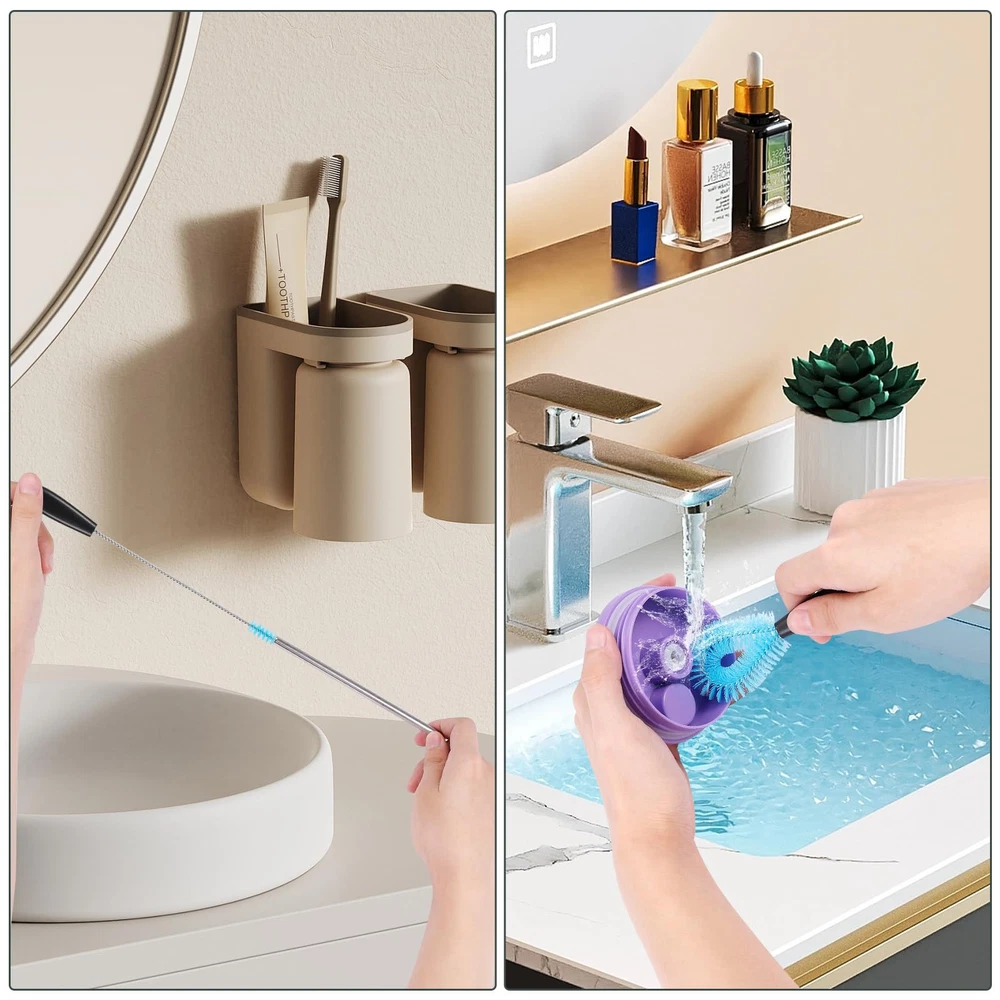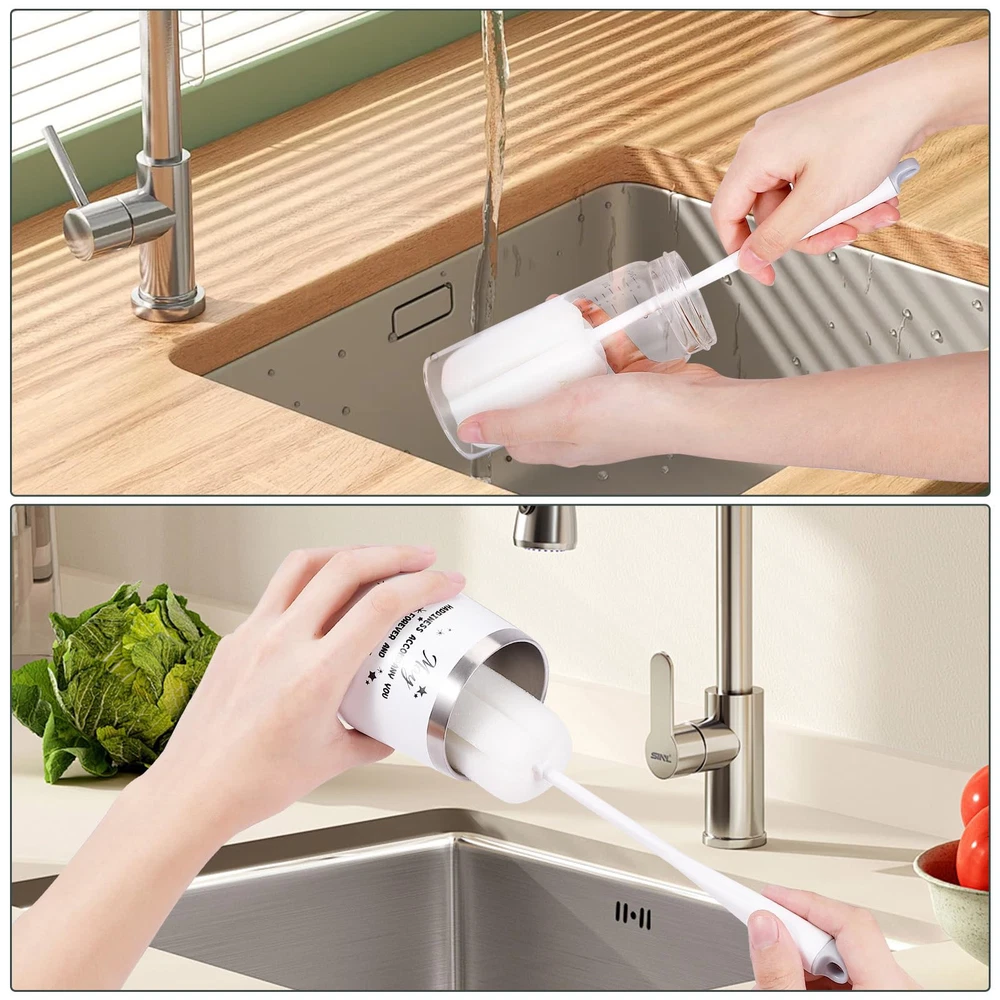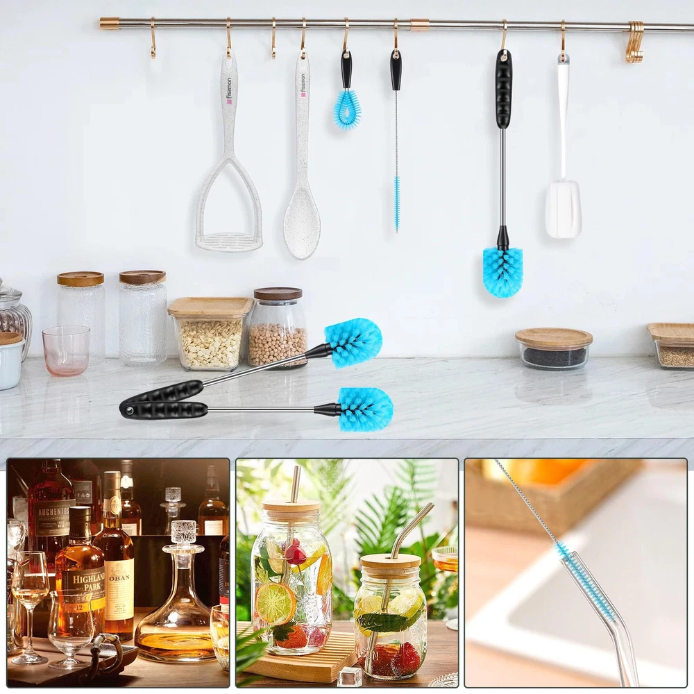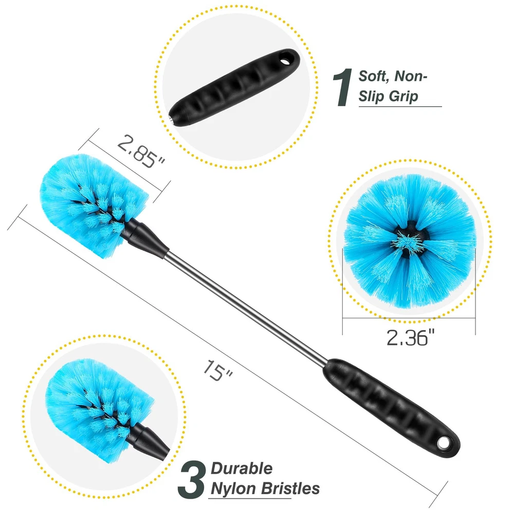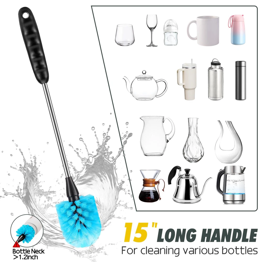 Water bottle cleaning brush BRUSH MATERIAL: The water bottle cleaning brush is made of stainless steel and durable nylon material for comfort and durability, and the bristles are very soft and won't leave scratches on your water bottle. NON-SLIP HANDLE: Rubber-covered handle and ergonomic grooves provide a non-slip grip, and the 15-inch extension brush is designed to reach the bottom of the bottle for a deep clean. NON-SLIP HANDLE: Rubber-covered handle and ergonomic grooves provide a non-slip grip, and the 15-inch extension brush is designed to reach the bottom of the bottle for a deep clean. EASY TO HANG: The water bottle cleaning brush has a hanging hole design on the handle, you can hang up several brushes to store them when not needed, it will not take up space.