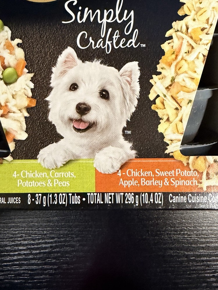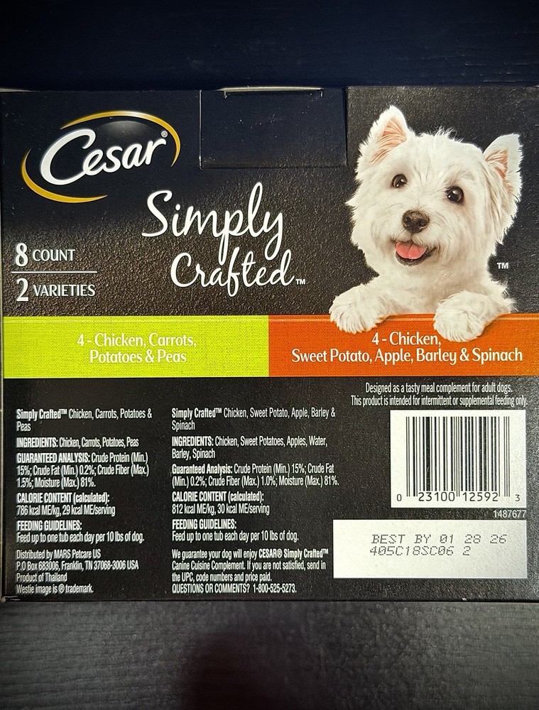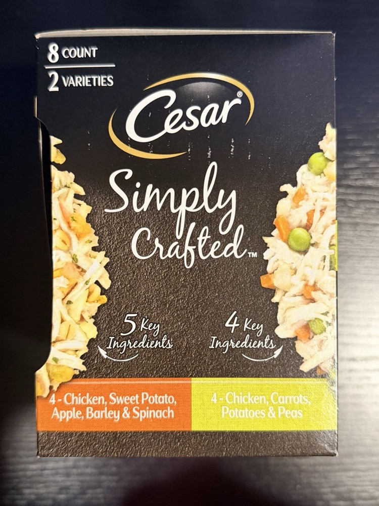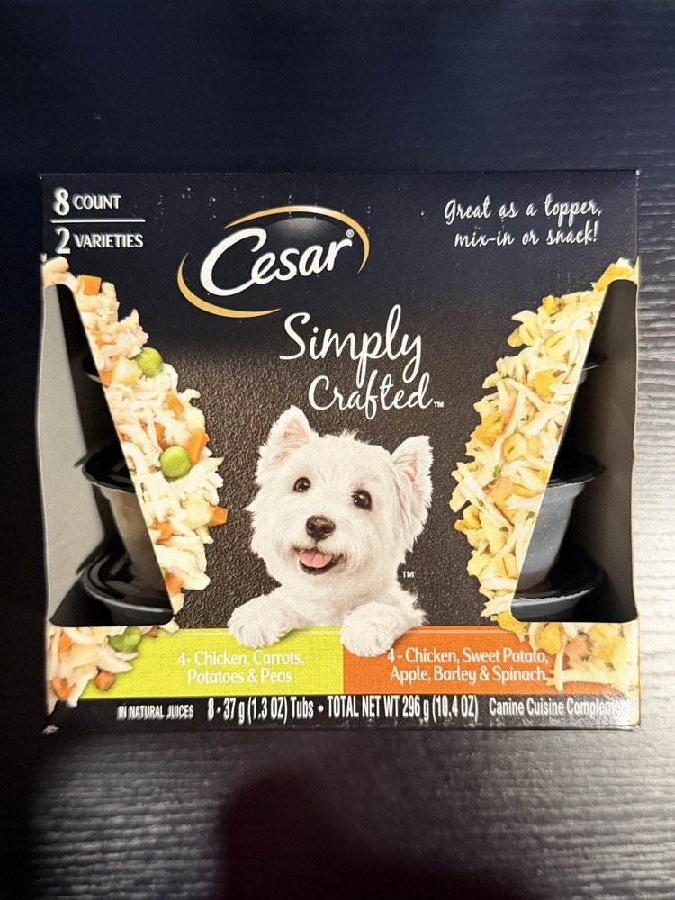 The Cesar brand knows the best way to show your dog love is by keeping them happy with gourmet meal complements.Cesar Simply Crafted Adult Wet Dog Food Meal Topper Chicken, Carrots, Potatoes & Peas and Chicken, Sweet Potato, Apple, Barley & Spinach Variety Pack will have your pup running for their bowl. Our delicious toppers are made with real chicken as the #1 ingredient and real veggies. You can place it on top of your dog’s regular kibble, mix it in, or serve as a special snack. Cesar Simply Crafted contains no artificial colors, flavors, preservatives, or fillers. Just peel-back the easy-to-serve trays of our Cesar Simply Crafted Chicken and Chicken, Carrots & Green Beans Variety Pack to make mealtime flavorful. Give your dog a delicious snack they’ll love and love you for.
