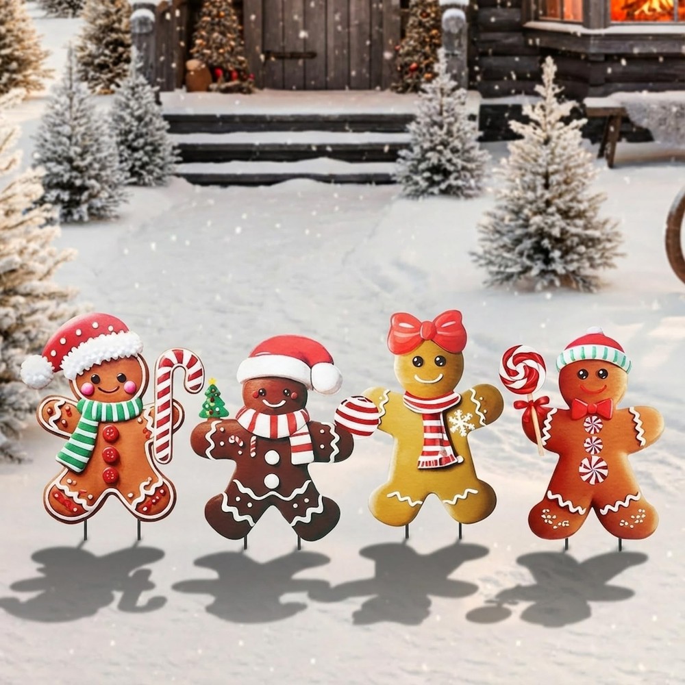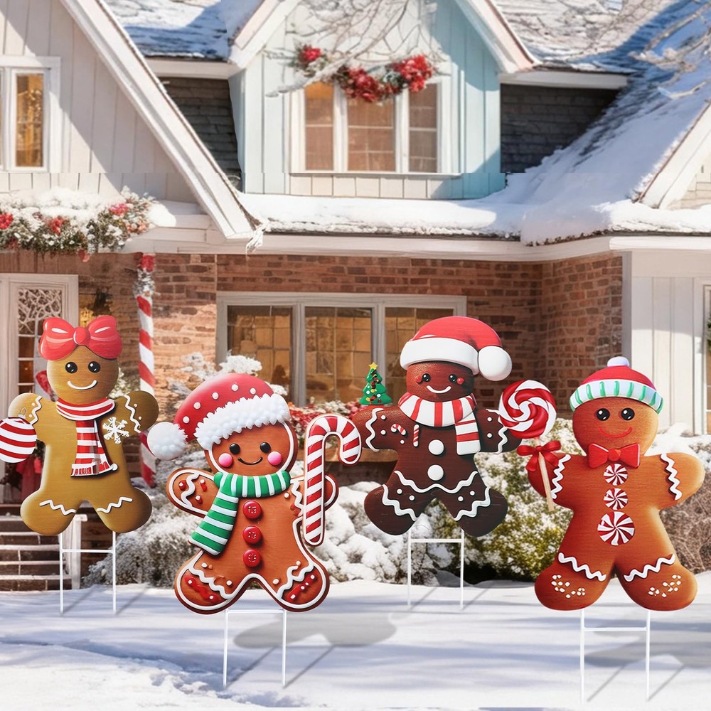 Features: Durable and Weatherproof Experience peace of mind knowing your summer yard sign is both durable and weather-resistant. Made to withstand outdoor conditions, these signs maintain their charm regardless of wind or rain, making them a reliable decor choice. Idea for Any Occasion Whether for a backyard party, a special event, or daily enjoyment, these colorful iron signs serve as the ideal decoration. Suitable for lawns, gardens, or patios, they add fun to any setting, enhancing your seasonal celebrations. Specifications: Material: metal Color: colorful Size: 15.7 inch Package includes: 4 x Christmas gingerbread yard decoration Notes: Manual measurement, please allow slight errors on size. The color may exist a slight difference due to different screen displays. What You Get: you will receive 4 pcs exquisite Christmas gingerbread metal stake, with 4 pcs H shaped stakes, they are about 12.99 x 15.75 inches/ 33 x 40 cm, large and eye catching, can decorate your yard and let everyone who passes by feel the taste of Christmas Gingerbread Man Design: our Christmas metal stakes feature a playful gingerbread design, each gingerbread man has a different depth of brown, with different Christmas hats and accessories, and the overall color uses the classic red, green and white color scheme of Christmas, adding fun and festive atmosphere to your holiday Quality That Lasts: gingerbread decorations are made of metal and finished with a durable, waterproof coating, these iron signs are designed to can be applied and preserved for a long time; Their colorful printing ensures they'll remain a vibrant addition to your outdoor decor for years to come Ideal Christmas Decoration: the colorful iron gingerbread man is an ideal decoration choice for Christmas, suitable for lawns, courtyards, balconies, gardens, entrances, parties and other special occasions, adding a lot of fun to your space Ideal Christmas Gift: if you are Looking for an ideal holiday present, our Christmas metal stakes make for a heartwarming gift that people would love; Our gingerbread metal stakes can convey the joy of the festival and share good wishes