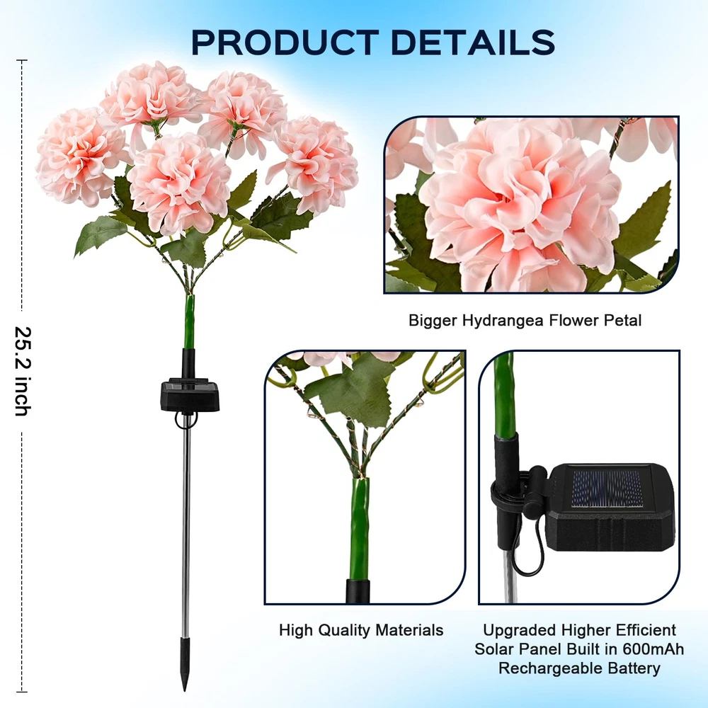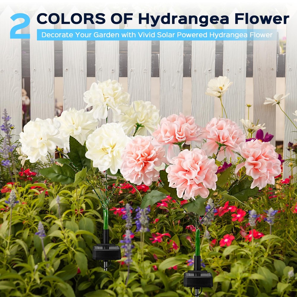 COLORFUL LIGHTS SOLAR HYDRANGEA FLOWERS: The solar flower lights equip with color light string instead of plain white light. When night falls, these solar garden lights can light up your garden and create a dreamy atmosphere. The flowers made of fine processed fabric, stems and leaves are propped up by iron wire, you can move the stems on them to whatever position you want them in. HIGH EFFICIENT BIGGER SOLAR PANEL: The solar garden lights are 100% solar powered. The size of the solar panel is 50 * 50mm. Built-in 600mAh rechargeable battery. To your surprise, the charging time is 6-8 hours, and the lighting time at night is 10-12 hours. Light up your garden by channeling the power of the sun without incurring a huge electricity bill. 2 LIGHTING MODES: There is an ON/OFF switch on the solar lantern, make sure you switch it on for the first time use. Turn the switch to "ON Ⅰ" for "Steady on" mode, slide to "ON Ⅱ" for "Flash" mode. The solar lights will turn on automatically at dusk and turn off automatically at dawn. IP65 WATERPROOF: The outdoor solar lights are made of durable and high-strength ABS material. IP65 waterproof ensures the solar garden lights fixture can function well even in heavy rain, snowstorms. It can keep working in your garden in any weather. EASY TO ASSEMBLE AND INSTALL: No tedious installation steps, no tools, no wiring, only need to assemble the parts and then insert the ground, place the solar lights in sunlight. It can lighting your yard, garden, patio, driveway, pool, garage, front doors, backyards, etc.