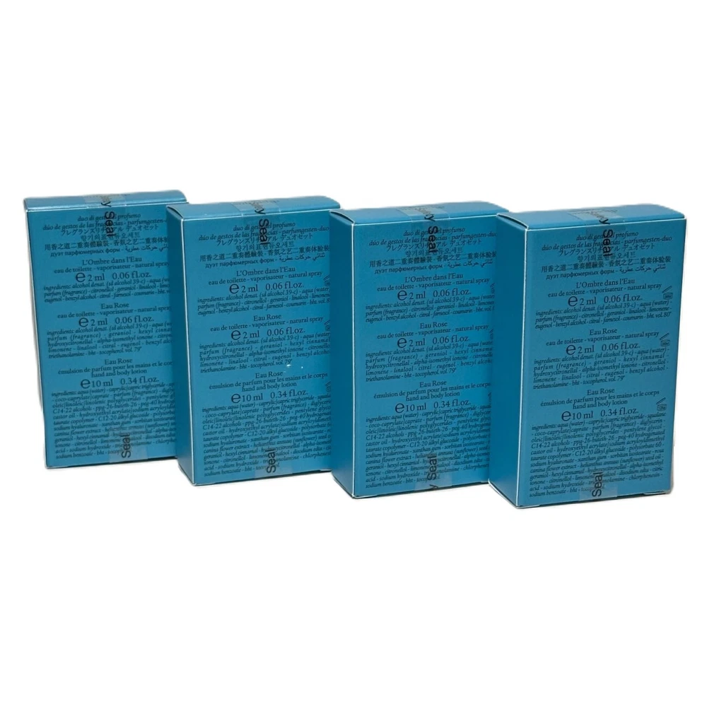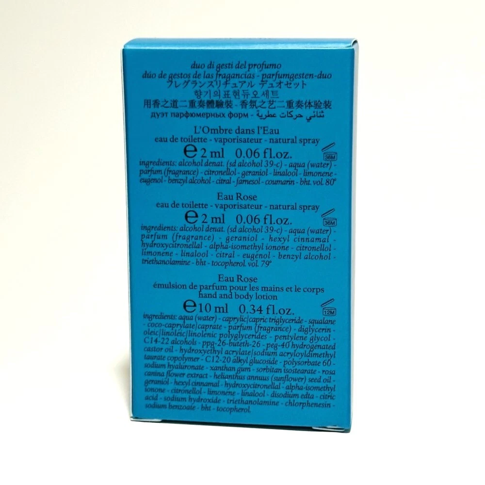 UPC: 659821906598 gtin13: 659821906598 Brand: DIPTYQUE Volume: 0.06floz MPN: DIPTYDUODEGESTES-MINISET-4PK Type: Item Fragrance Name: L'Ombre Dans L'Eau / Eau Rose Scent: L'Ombre Dans L'Eau / Eau Rose Publisher: DIPTYQUE Language: English