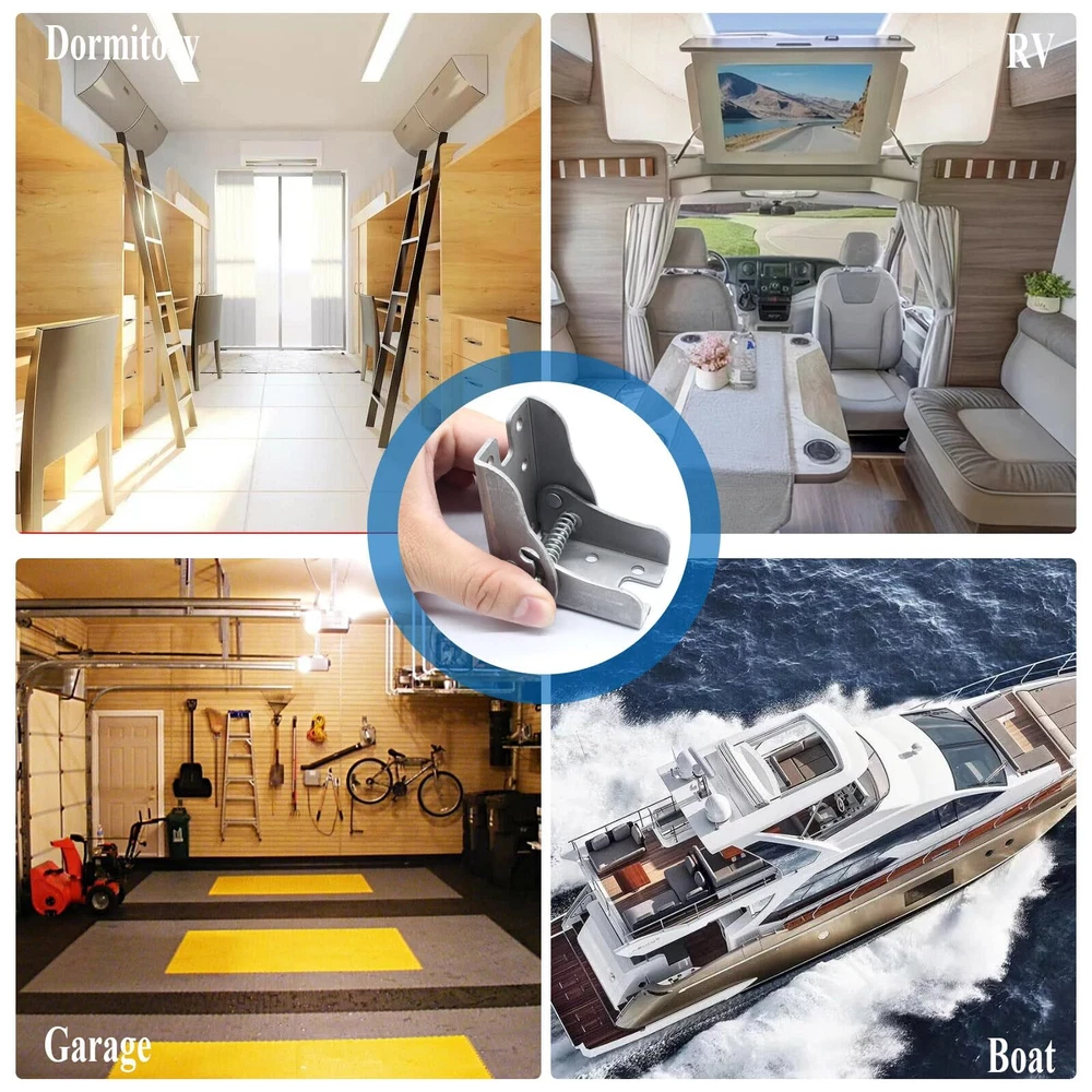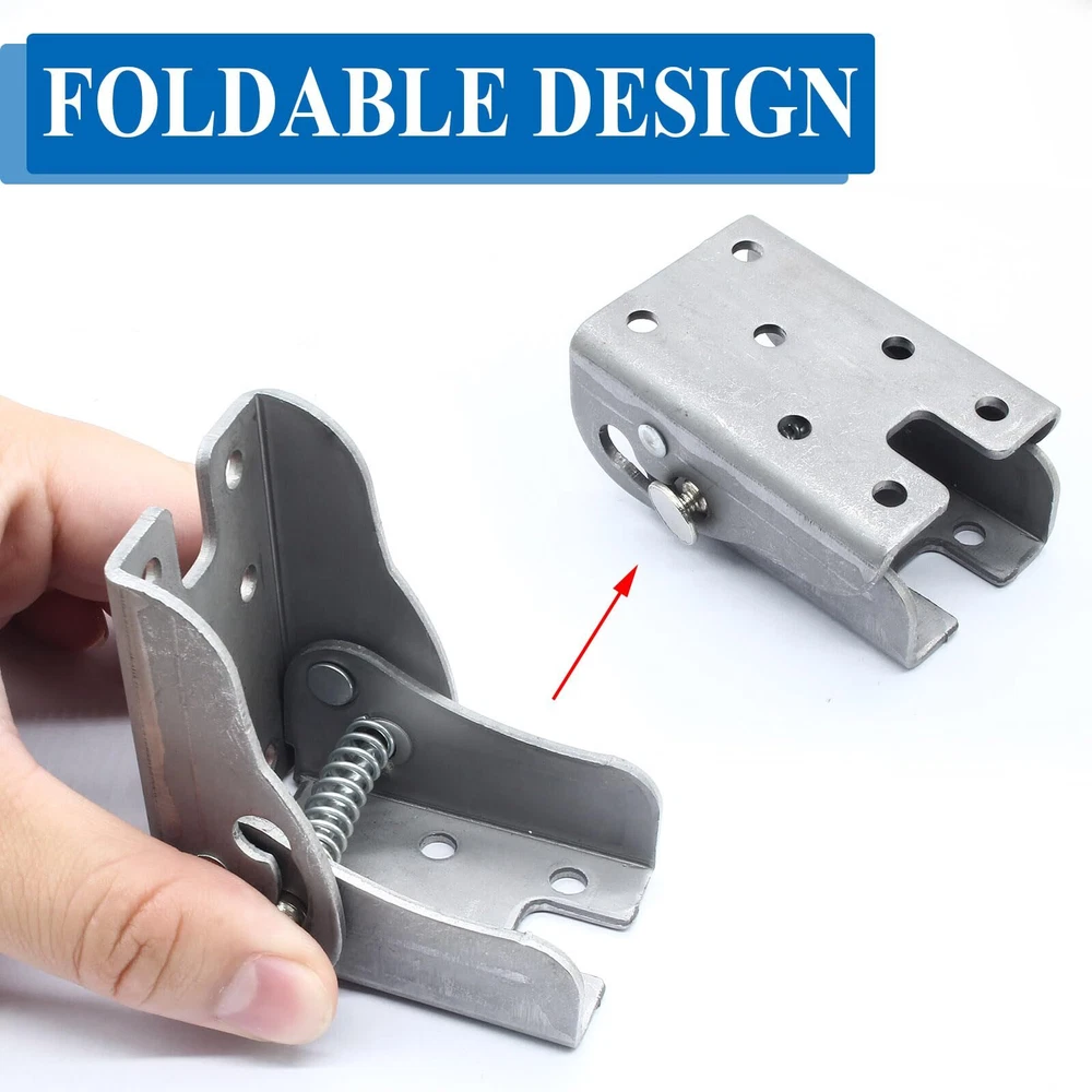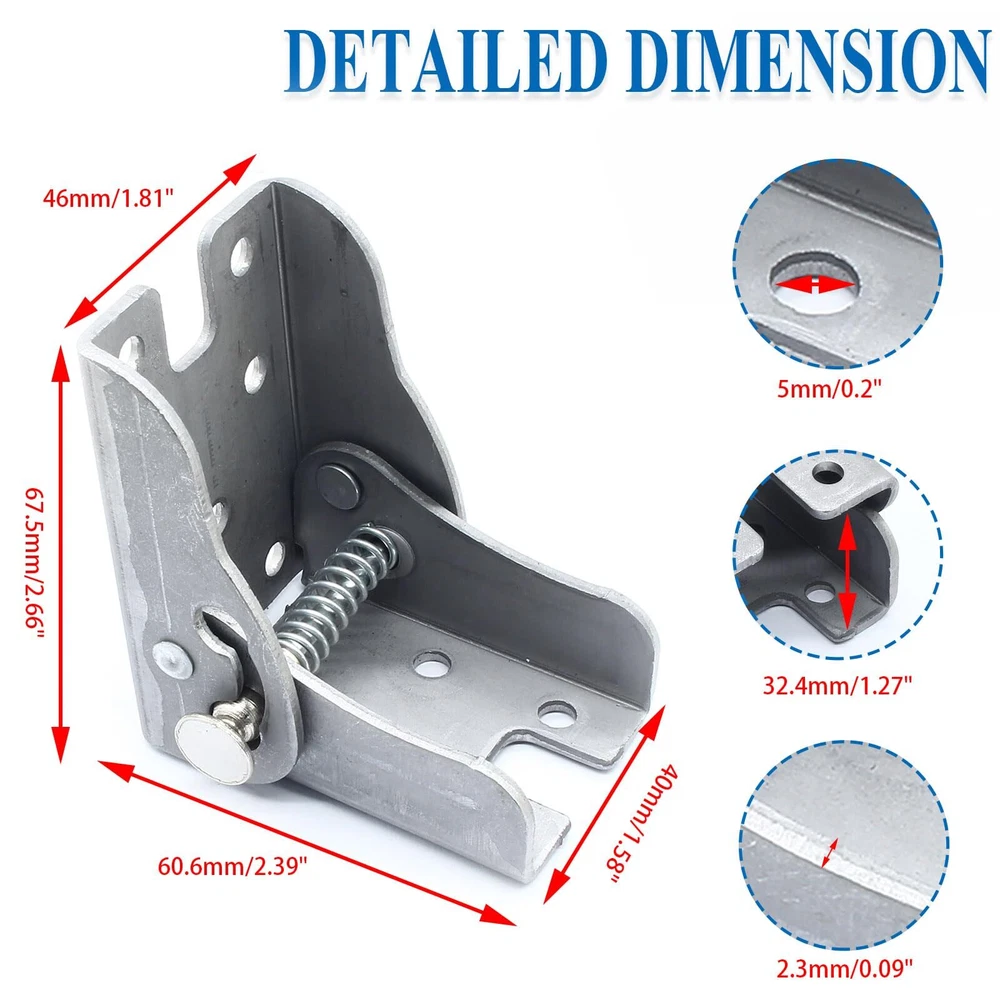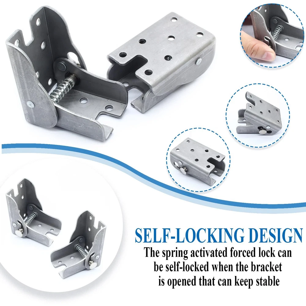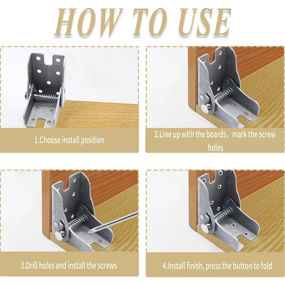 4 Pack Folding Table Leg Brackets, Foldable Self-Locking Hinge Extension Support Brackets Feature: -Easy to install, the package is come with mounting screws, easy and convenience for quick installation. -Self-locking design, with spring lock, ensure safety while using and save storage place when not use. -Wide range of usage, suitable for various furniture legs and some extensive applications. Specifications: Material: Metal Iron Color: Natural Folded Size: 73.3 x 45.8 x 32.4mm / 2.88" x 1.8" x 1.27" (L x W x H) Unfolded size: 67.5 x 46 x 60.6mm / 2.66" x 1.81" x 2.39" (L x W x H) Thickness:2.3 mm / 0.09" Hole Diameter: 5 mm / 0.2" Package Included: 4Pcs x Folding Brackets Sufficient Mounting Screws Notices: 1.The color of the item may have slightly different from the pictures due to different photography light. 2.Due to manual measurement, please allow an error of 1-3mm. Thank you for your understanding. 【What You Will Get】4 x 90 Degree Folding Brackets + Sufficient Mounting Screws. Unfolded size: 67.5 x 46 x 60.6mm/2.66" x 1.81" x 2.39" (L*W*H), Folded size: 73.3 x 45.8 x 32.4mm/2.88" x 1.8" x 1.27". Mounting screws are included in the package for easy installation. 【Premium Material】The Foldable Support Bracket is made of high-quality metal iron. It is sturdy, stable, rust-resistant, and corrosion-resistant, ensuring a long service life. Its versatile design easily various home styles. By using this hinge, your table becomes flexible, allowing you to save storage space effectively. 【Good Loading Capacity】The Folding Table Leg Brackets are constructed with a high-strength steel structure, exhibiting strong toughness and durability. They have a good loading capacity and can support weights of up to approximately 105 kg (230 lbs) per pair. 【Self-Locking Design】The Extension Support Bracket features a self-locking design with a push button and spring mechanism. It allows for easy folding and self-locking functionality. The spring-activated forced lock keeps the bracket stable when it is open. When you need to the table and not in use, simply press the latch to fold it. 【Widely Application】The Folding Self-Locking Hinge is adjustable from 0 to 90 degrees, making it suitable for tables, beds, workbenches, DIY projects, or any furniture legs that require extension. It finds extensive use in spaces with limited room such as kitchens, laundry rooms, retail stores, warehouses, offices, and more.