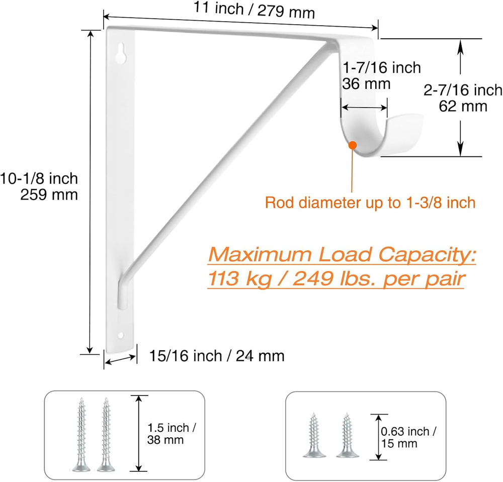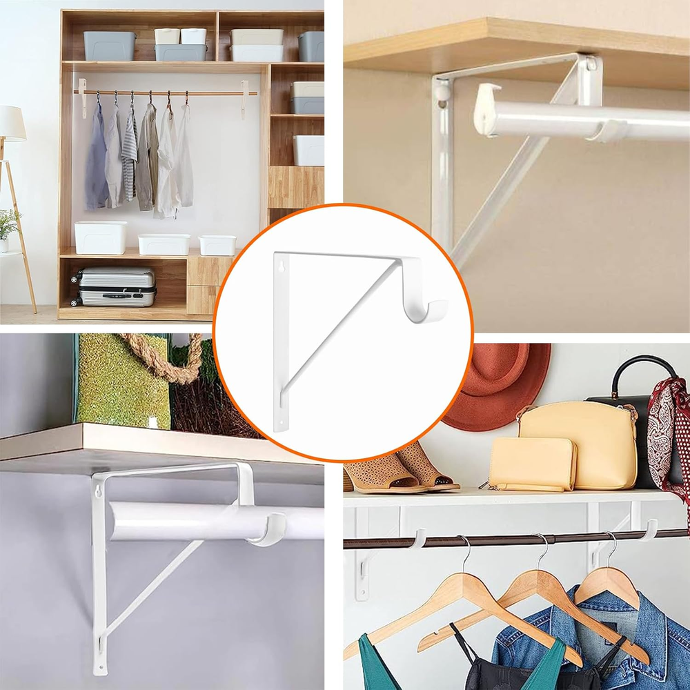 Store New Arrivals Add to Favorite View Feedback Contact 4 Pack Heavy Duty Closet Shelf & Rod Brackets, Wall Mounted Closet Shelf Description Item model number SRB-002-WH Unit Count 4.0 Count Batteries Required? No Finish Painted Mounting Type Wall Mount Part Number SRB-002-WH Color White Product Dimensions 11 x 1 x 10.2 inches Material Alloy Steel Item Depth 11 inches Item dimensions L x W x H 11 x 1 x 10.2 inches Item Weight 4.05 pounds Manufacturer KOVOSCH Size 4 Pack-White Finish Type Painted Brand KOVOSCH Included Components Anchors x 8 Screws x 16 Heavy Duty High-Quality Steel - KOVOSCH heavy duty shelf bracket are made from high quality steel with a fine painted surface, strong and long-lasting use. Classic L-Shaped Brackets - Our closet rod bracket is L-shaped with extra support bars. It helps to create more storage or display room in tight space. The neat style is suitable for all kinds of home decor. Size of Triangle Design Bracket - Closet Rod Bracket Size: L11 in x H10.2 in x W1 in with a 2.4 in hook to hang into closet rods up to 1-1/4 in. construction provides excellent weight capacity for the brackets, which can hold up to 300 pounds per pair. Easy Installation - Simply "hang" the bracket by screwing the top screw halfway on. Then lock the underside of the bracket in place with the screws. Package includes all mounting hardware for easy installation and overall installation will not take more than 15 minutes. Buy with Confidence - Choose KOVOSCH to dress up your home. If there is any quality problem, please feel free to contact us. Product description 1 Up To 1-3/8“ Rod 2 Outstanding Paint 3 Solid Weld Joints 4 Fixing Screw Hole ABOUT US We offer the best prices around on high quality products. Our E-store includes media such as books, movies, music and games while offering electronics, toys, sporting apparel, clothing, tools, general home, garden items and more. SHIPPING We are always working hard to ensure your package arrives as soon as possible. Please understand that some factors like weather, high postal traffic, and the performance of shipping companies are outside of our control. We offer free shipping to the lower 48 states and ship within 2 business days of payment, usually sooner. We do not accept P.O. Boxes. Please provide a physical address. RETURNS We offer a 30-Day Return Policy on items which you are not completely satisfied with. You have the option for a full-refund or an exchange of the item. No returns are available on items shipped outside of the USA. PAYMENT We accept PayPal. CONTACT US This page content is yet to come Please ad us to your favorite seller and visit again later Thank You CUSTOMER SATISFACTION We try our very best to make sure every customer is completely satisfied. If there's a problem, message us! We're happy to help.