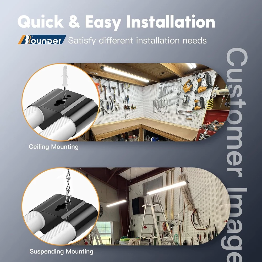 4 Pack Linkable LED Utility Shop Light, 4400 LM, Super Bright 6500K Cool Daylight, 4 FT Integrated Fixture for Garage, 40W Equivalent 250W, Surface + Suspension Mount, Black Color Black Shape Linear Material Polycarbonate (PC) Light Source Type LED Shade Material Polycarbonate (PC) Super brightness: With 4400 lumens brightness at 6500K cool daylight white, these 4ft led shop lights only consume 40W while provide the bright illumination with 250W (6 times more than conventional fluorescent lights). It is an amazing LED Efficiency of 110 lm/w, which can save the electricity expense for you. "D" shaped tube for durability: This shop lighting adopts brand new and creative "D" shaped design aiming to solve 3 major problems that customers encounter most, respectively bending tubes, dark spots and dead lights. Simple installation: Follow our installation guide for a quick and easy setup with included mounting hardware (56in Power Cord with Plug)! Directly mount to the ceiling or suspend from the ceiling for instant bright shop light in your garages, basements, warehouses, and storage area. Daisy-chain linkability: 4ft linkable led shop light can seamlessly connect up to 4 lights with plug connections for energy savings in your home, office or any workspace. Wide application: led shop lights can be applied in multiple areas, such as home garages, attics, barns, workshop, workbench, utility room, shed