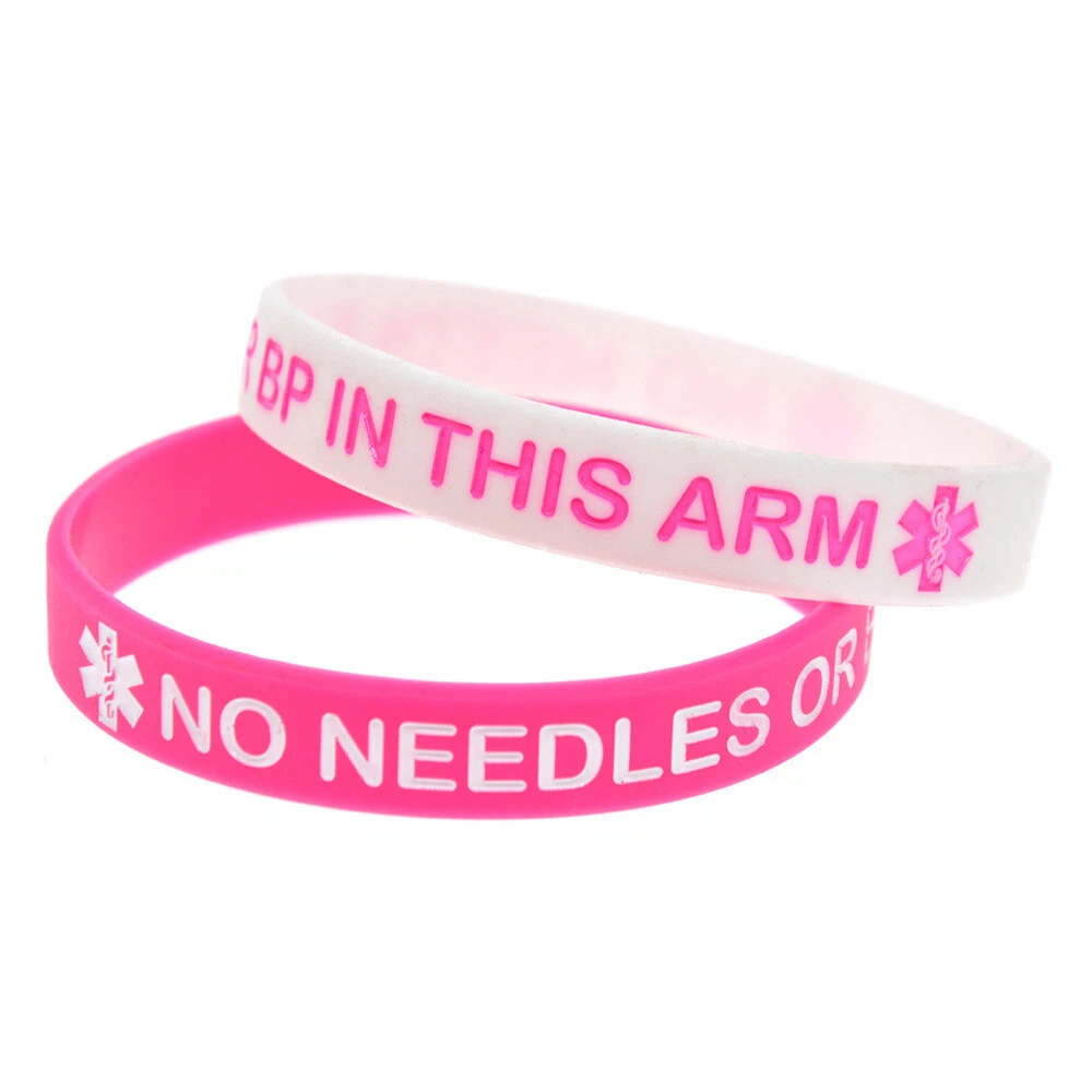 4 Pack Medical Alert No Needles or BP in This Arm Awareness Silicone Bracelets Choose your favourite color from the drop down menu Quantity advertised is for 4 bracelets Adult Approximate Size: 202mm*12mm(8"*0.5") Please order without any hesitation! You can even keep a spare one in your pocket or bag. Note: Due to the difference between different monitors, the picture may not reflect the actual color of the item. Your understanding will be highly appreciated. Package Included: 4 x Medical Alert Bracelets Make sure you're covered in an emergency Wear a medical wristband! Wear this band and protect yourself or buy it for a loved one Be safe in the knowledge that you or your loved one can get immediate and appropriate treatment should something happen. Make sure you wear your medical wristband at all times. You can keep it on even while you bathe as these are waterproof. If you are interested in more products, please kindly have a look at our eBay shop. Thank You for shopping with us and we hope to see you soon! Payment Delivery details Terms of sales About us Contact us Payment We accept PayPal , Payoneer, VISA, Bank Wire Transfer, etc. We only ship to confirmed eBay addresses . Your eBay address MUST MATCH your Shipping address. Delivery details 1. All items will be shipped within 24 - 48 hours after full payment is received. ( excludes weekends and holidays ) 2. United States Delivery time to below: - SpeedPAK Shipping -------------------------------- 7 - 12 business days 3. Global Delivery time to below: - China Shipping -------------------------------- 15 - 30 business days 4. If you have not received your shipment within Delivery Estimate , please feel free to contact us. We will track the shipment and get back to you as soon as possible with a reply. Our goal is customer satisfaction! Terms of sales About Import Tax: 1. Import duties, taxes and charges are not included in the item price or shipping charges. These charges are the buyer's responsibility. 2. Please check with your country's customs office to determine what these additional costs will be prior to bidding/buying. 3. Some countries' customs may charge taxes for importing good from another country such as Import Duty, Value Added Tax, a Purchase Tax, Customs clearance fees etc. 4. Buyers as importer are responsible for paying such costs. Buyers can not request to cancel the auction or request for refund or resend under this situation. About us Please contact us via eBay Message if you have NOT received item after 30 days , we will check it with post office, and then resend or refund any missing items. If you receive a wrong item or a dead-on-arrival (DOA) item, pls contact us asap for a resend or refund. Contact us If you have any question, pls don't hesitate to email us: Our working time is 9:00-18:00 [Beijing Time] ( Except Weekends ). During that period of time, we will reply to you as quickly as possible. We greatly appreciate your Positive Feedback . Pls do NOT leave negative feedback without asking for help. Our aim is to provide Top Level Customer Service, so we will try our best to solve any problems. Emails received on weekends would be responsed on Monday.