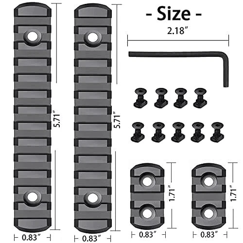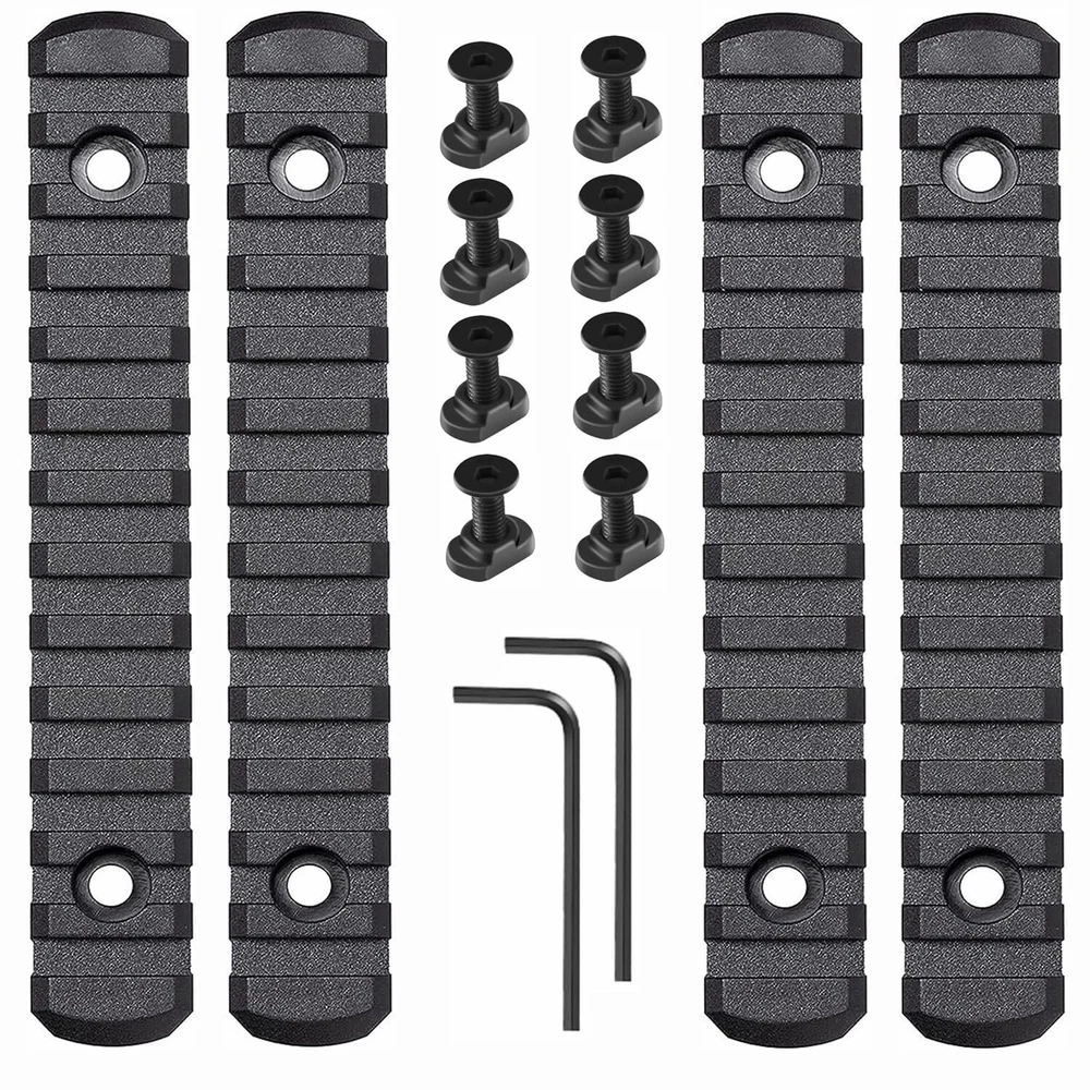 Packing list: 4 packs, nylon Single Picatinny Rails * 1 (4PCS), screws * 8 Product size 4*14.5cm Width 2.1cm Allow the attachment of all standard 21mm picatinny specrail-mounted accessories. Can position just enough rail area exactly where you need it for each accessory, available in two lengths Install these screws by allen wrench tool, simple to install or remove. Pack of 13-13-13-13 slots, 8 sets matched screws, 8 sets locking T-Nuts and 1 allen wrench . Ultralight rail with solid polymer construction and low profile design reduces bulk. 13-Slot 0.65Oz, 3-Slot 0.19Oz, much lighter than aluminum alloy, high strength and good safety Injection molded from a proprietary reinforced composite for enhanced strength and durability while remaining lightweight, Rail Sections also feature beveled ends to reduce snagging and eliminate sharp corners and edges.