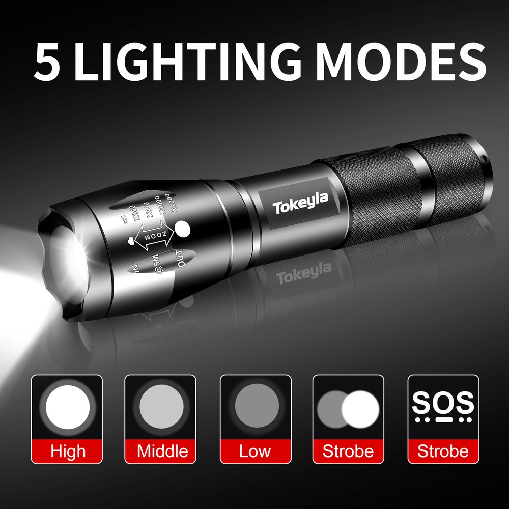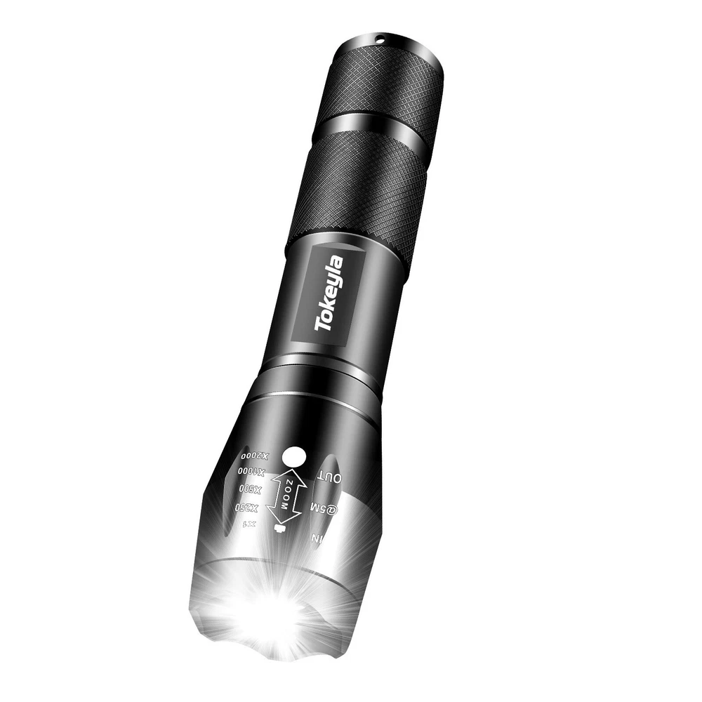 Item Height: 0.98 inch Lighting Technology: LED Color: Black Features: Battery Included, Handheld, Waterproof, Adjustable Focus, With Wrist Strap Country/Region of Manufacture: China Model: Super Bright LED Flashlight Small Item Weight: 8.46 ounce MPN: Does Not Apply Type: Flashlight IP Rating: IP55 Battery Included: No Number of Batteries: 1 Item Length: 4.88 inch Battery Technology: Rechargeable Battery(Not Included) Item Width: 1.18 inch Power Source: 1x Rechargeable Battery(Not Included) Material: Aluminum Operating Time: 1-5 Hours Brand: Tokeyla