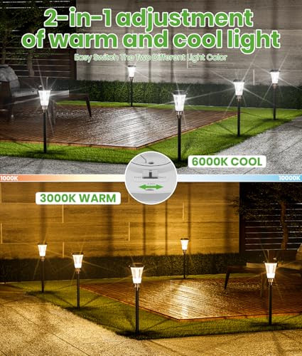 gtin13: Does Not Apply Style: Modern MPN: Does Not Apply Water Resistance Level: Waterproof Specific Uses For Product: Outdoor use only Theme: Garden,Yard,Patio,Pathway,Walkway,Driveway Outdoor Lights Control Method: Touch Assembly Required: Yes Item Width: 1 Warranty Type: Limited Lighting Method: Solar Lights Outdoor Brand: Does Not Apply Unit Count: 4.0 Count Power Source: Solar Powered Number of Light Sources: 4 Switch Type: Slide Indoor Outdoor Usage: Outdoor Embellishment: Crystal EAN: Does Not Apply Item Weight: 2.5 Pounds Light Source Type: LED Installation Type: Floor or Ground Mounting Shape: Torch UPC: Does Not Apply Room Type: Outdoor Color: cool/warm white Efficiency: High Product Dimensions: 13"L x 12"W x 12"H Mounting Type: Floor Mount Brightness: 30 lumens Number of Items: 4 Material: Plastic Item Length: 1 Finish Type: Polished Light Color: Warm White, Cool White Shade Color: White Included Components: 1 * User Manual, 4 * Solar Pathway Lights, 4 * Garden Stakes Shade Material: Polycarbonate Size: 4 pack Item Height: 1 Fixture Type: Non Removable Light fixture form: Path Voltage: 3.7 Volts Type: Does Not Apply Bulb Base: Flanged Special Feature: Energy Efficient, Dual-Color Adjustable, Waterproof, 3 Heights Ad