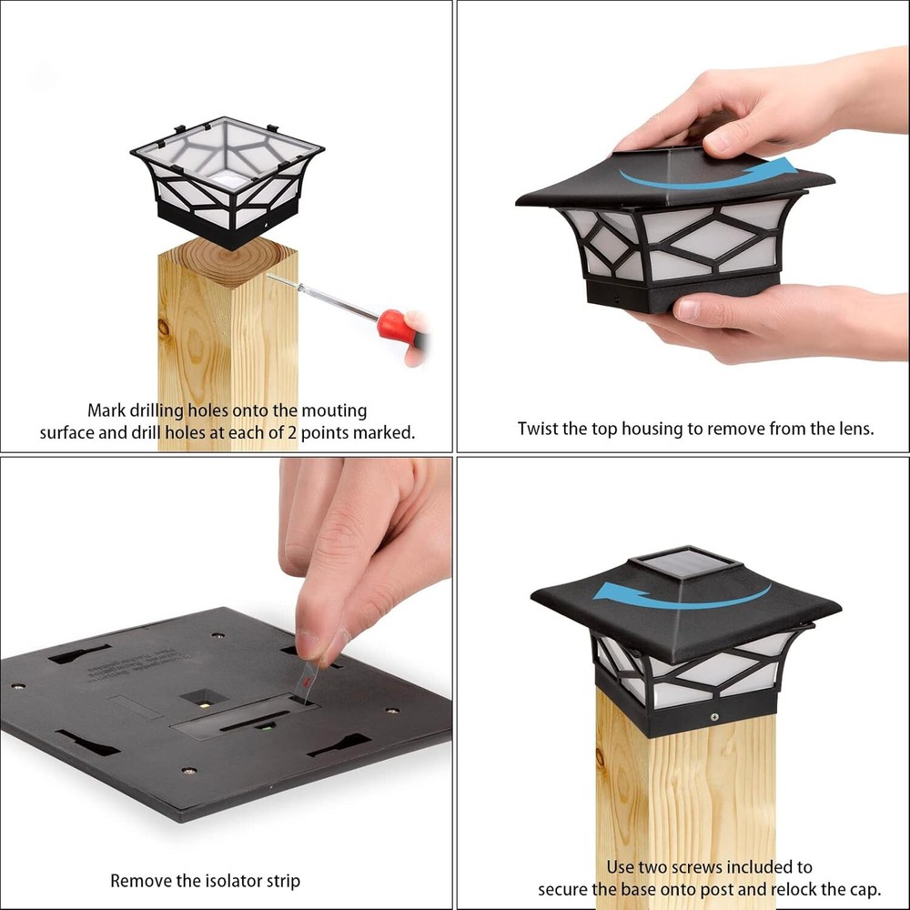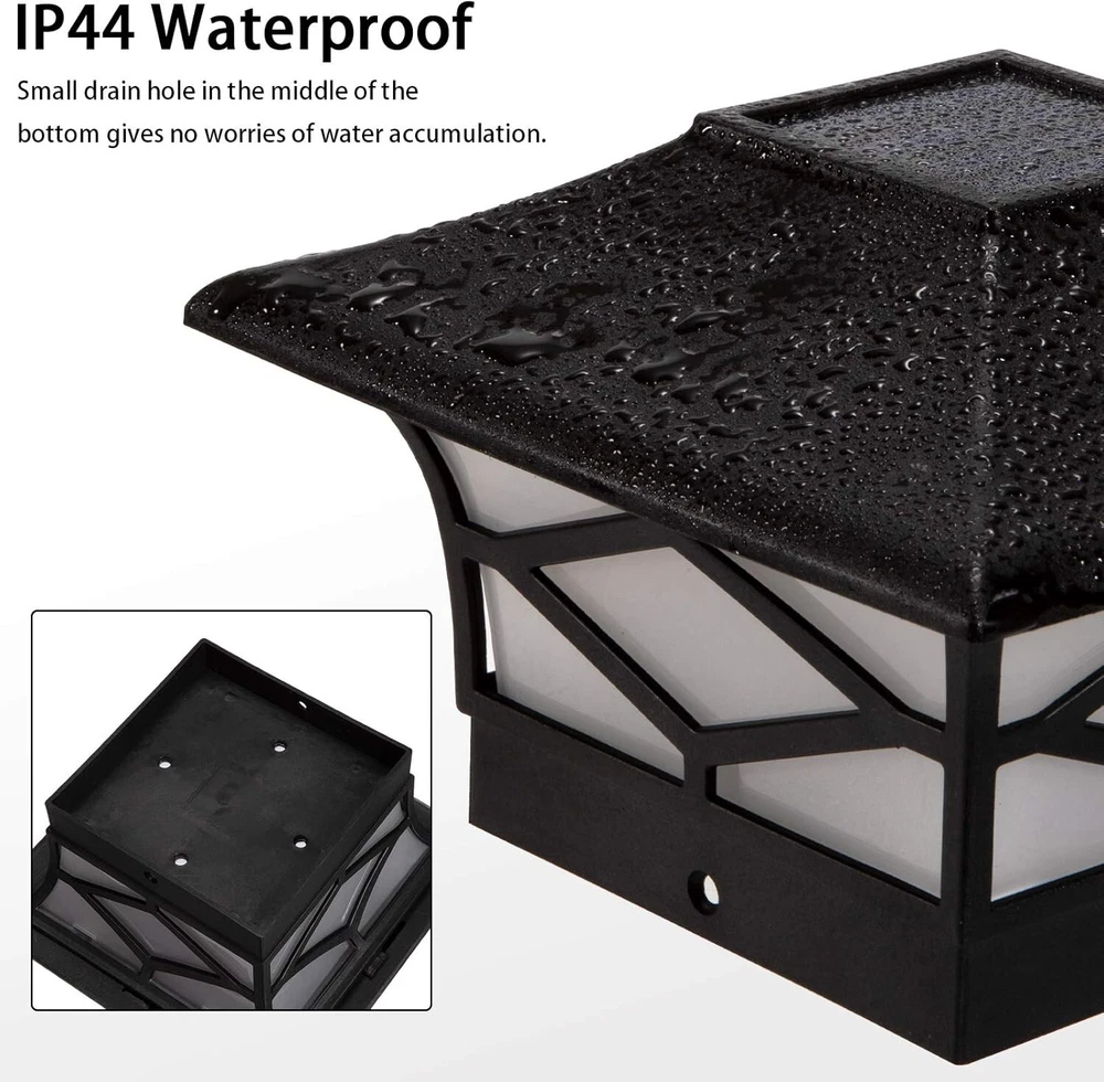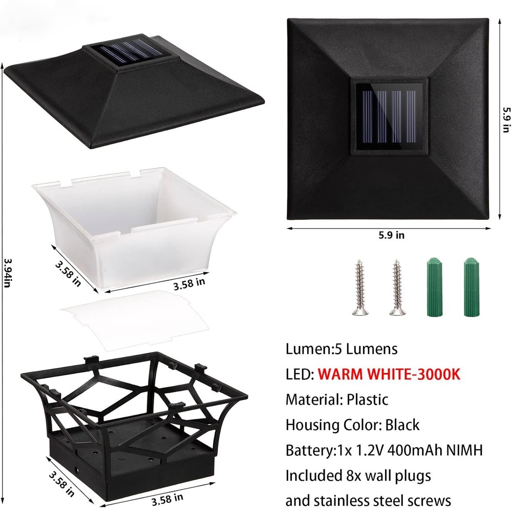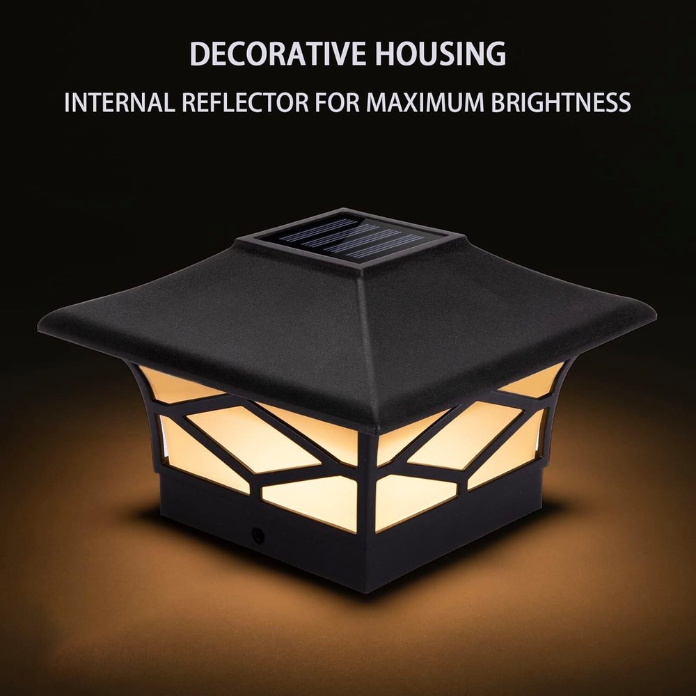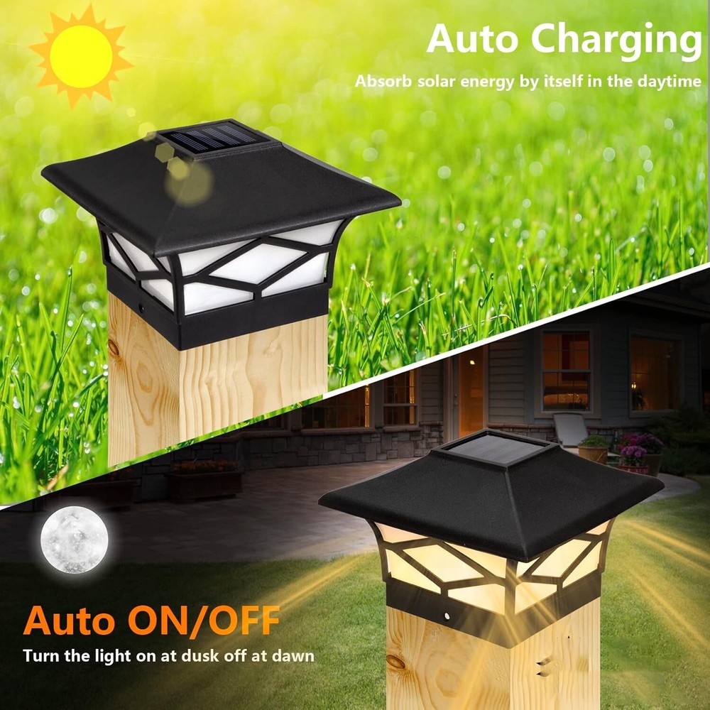 4 Pack Solar Post Lights For 4x4 Wood/Vinyl Outdoor Waterproof LED Deck Decor Solar LED Warm Lighting Decorate Garden Patio Porch (Free & Fast Shipping) 4 Pack Solar Post Lights – Outdoor Waterproof LED Deck & Fence Caps for a Stunning Ambiance! ✨🌞 Enhance your garden, patio, porch, or deck with these elegant and energy-efficient solar post cap lights! Designed to provide soft, warm illumination, these sleek black post lights add a touch of sophistication to your outdoor space while ensuring hassle-free, automatic lighting every night. Say goodbye to messy wiring and hello to a beautifully lit-up backyard! 🌞 Solar-Powered & Auto On/Off – No Wiring, No Electricity Bills! Equipped with a built-in daylight sensor, these solar deck lights absorb sunlight during the day and automatically turn on at dusk, casting a warm and inviting glow all night long. At dawn, they shut off automatically to recharge for the next evening, ensuring effortless operation and energy savings with zero maintenance! πŸ’§ All-Weather Resistant – Built to Last Year-Round! Crafted with high-quality, durable materials, these IP44 waterproof solar post cap lights are designed to withstand rain, snow, heat, and wind, making them perfect for year-round outdoor use. Whether you're lighting up your deck on a summer evening or creating a cozy winter glow, these lights are built to endure. 🏑 Stylish & Versatile Design – Perfect for Any Outdoor Setting! Featuring a sleek black finish and a modern yet timeless design, these solar post caps enhance the beauty of fences, decks, patios, porches, and walkways. Their elegant warm lighting creates a charming atmosphere for outdoor gatherings, romantic evenings, or peaceful relaxation in your backyard. πŸ”‹ Rechargeable Battery Included – Long-Lasting Illumination! Each solar post cap light comes with a pre-installed Ni-MH rechargeable battery, ensuring hours of illumination every night. Simply place the lights in a sunlit area, and let them do the rest! No extra wiring, no additional power sourceβ€”just pure solar energy at work! πŸ›  Easy Installation – Fits Standard 4x4 Wooden & Vinyl Posts These hassle-free solar lights are designed to fit standard 4x4 wood or vinyl posts (Inner base dimensions: 3.58" x 3.58"). Quick and simple installation means you can upgrade your outdoor space in minutes without tools or electrical work! 🌟 Why Choose These Solar Post Cap Lights? βœ” Automatic Solar-Powered Operation: No wiring, no electricity bills! βœ” Durable, Weather-Resistant Design: Withstands all seasons! βœ” Stylish and Elegant Black Finish: Enhances any outdoor space! βœ” Soft, Warm LED Lighting: Creates a cozy ambiance! βœ” Effortless Installation: Fits standard 4x4 posts! ✨ Upgrade your outdoor space with these stunning solar post lights! Whether you're hosting a backyard BBQ, enjoying a quiet evening on the patio, or enhancing your home's curb appeal, these lights bring beauty, convenience, and energy efficiency to your outdoor living. Order today and transform your space! πŸ’‘πŸ‘