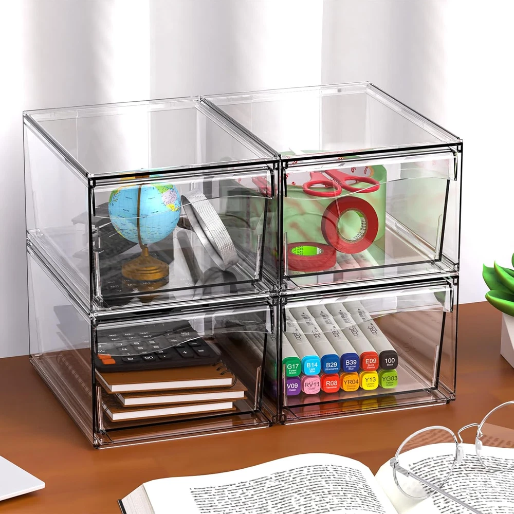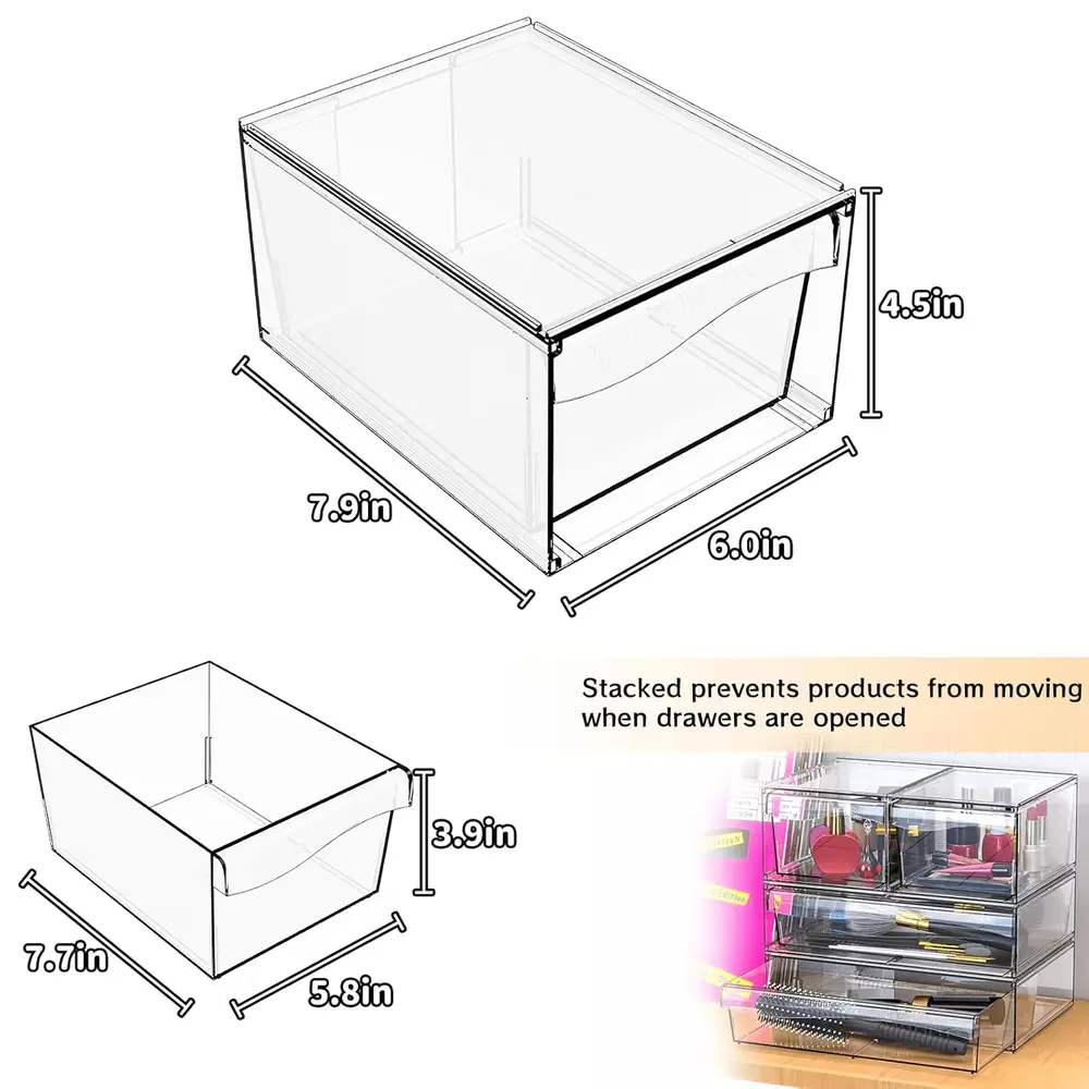 eBay 【Large Stacking acrylic organizers】- The make up storage has 4 independent drawer organizers, They can be used as organizers and storage for makeup, bathroom countertop, kitchen or laundry under sink, medicine cabinet, pantry, vanity. 【Multifunctional clear storage bins】Design of drawers of different sizes makes it a perfect under the sink storage for storing medicine,lotion,skin care,facial cleanser, lipsticks, eye shadows, concealers, and other skin care products 【Stackable Drawers Design】-clear organizers can stack each other,You can use each drawer separately,It is very suitable to be placed on the dormitory,bedroom,Vanity Countertop,dressing table,office desktop,Bathroom Counter clear organizing containers 【This clear stackable storage bins is Perfect Gift】 - Perfect choice as a under sink organizer and Makeup organizer gift to women,Girl,girlfriend, daughter, wife, mom, and friends. College dorm room essentials for girls. 【Stylish and Durable cabinet organizers and storage】: This organizer is also a must-have for beauty bloggers, makeup artists, and college students. Very suitable as: desk storage, under sink storage, makeup storage, under bathroom sink organizer Product Description Stackable Organizer Drawers Maximizes Countertop and Cabinet Storage Capacity Organizer can stack each other,You can use each drawer separately or match it with Our other drawers from our brand,the medicine organizer compact and simple design, does not deform, and is shiny. A great helper for desk organizer Vanity Can be placed on the makeup table, to store your makeup supplies, such as brushes, loose powder, powder, mask, foundation liquid, sunscreen and so on cosmetics, so that your desktop clean and orderly, items classification, transparent design can make you very simple to find what you need. Coffee bar This acrylic stacking box can be placed next to the coffee table, used to store your coffee and various coffee seasonings, will keep the whole table very clean, so that you can quickly find your things next time. The effect of two boxes stacked together Two kinds of acrylic stacking boxes together also have a certain degree of beauty, but also can put different kinds of things, as a storage or a better choice, just can also be placed in a small cabinet, transparent design is also easier to find things Stacked prevents products from moving when drawers are opened Product size Acrylic stacking box is composed of two parts, drawer and shell, the size is not the same, the drawer size is7.7*5.8*3.9inches.the shell size is7.9*6*4.5inches.