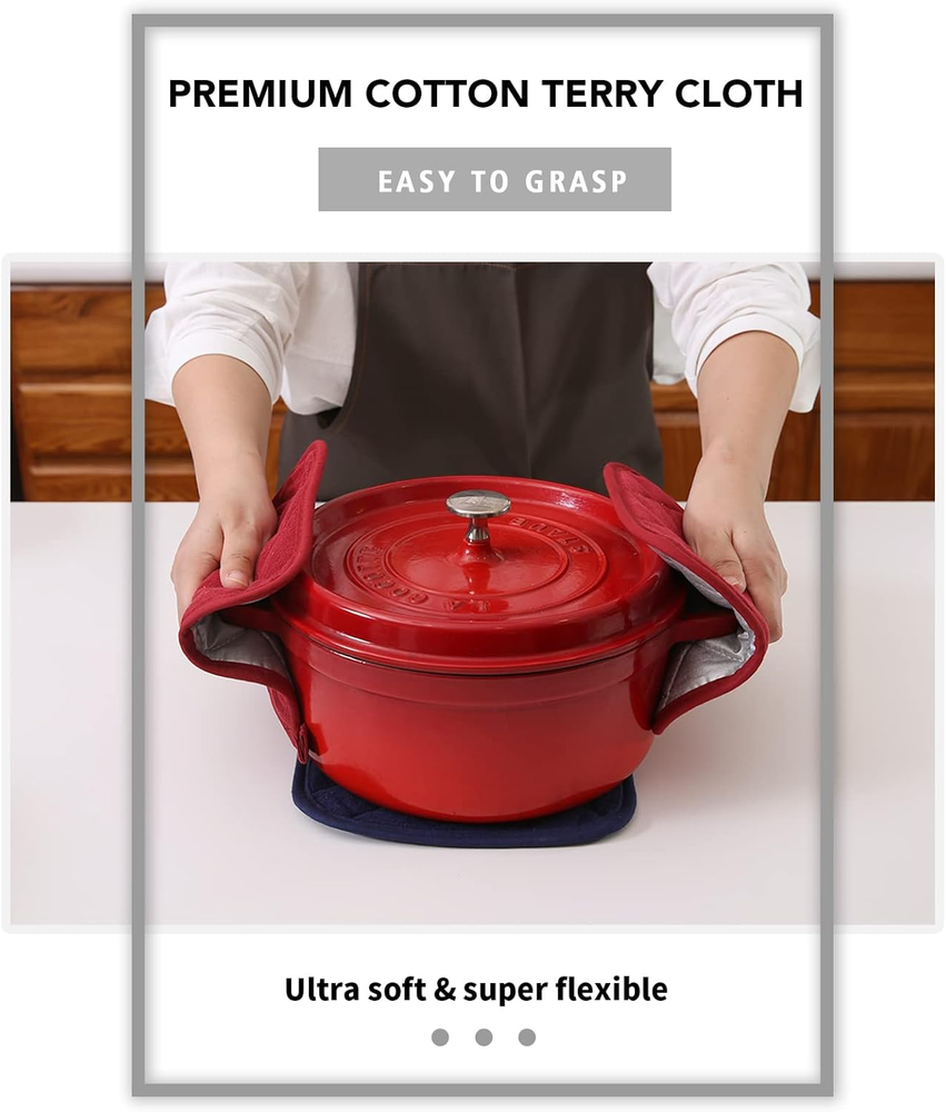 THICKER ENOUGH HOT PADS: Use as hot pads for hot dishes, hot pots and pans, cast iron cooking pots. Protect countertops from scratches, placemat under heavy cast iron set. PROTECT YOU FROM HEAT - The construction of these pot holders for kitchen helps to protect your hands and arms from the heat of the oven. Do not use pot holders in a hot oven or over an open flame. DURABLE AND FIRM GRIP - The flexible material allows for ease of use and firm grip on the hot dish or pot, adding safety to the cooking process.Fashionable, practical and safe to use in the kitchen as potholder or trivets. Perfect for indoor or outdoor usage all year round! QUILTED AND PADDED - Heat resistant up to 400 degrees allowing safe removal of baking dishes and cast iron from the oven and hot pots from the stove. GREAT GIFT CHOICE - Great gifts for Mother's day, wedding day, birthday, holidays, housewarming, and hostess gifts. Product Description CottonPot holders & Silicone Pot Holders Add to Cart Add to Cart Add to Cart Add to Cart Add to Cart Customer Reviews 4.6 out of 5 stars 9,596 4.7 out of 5 stars 2,267 4.7 out of 5 stars 2,267 4.6 out of 5 stars 5,205 4.6 out of 5 stars 9,596 Price $8.99 $ 8 . 99 $9.99 $ 9 . 99 $9.99 $ 9 . 99 $13.99 $ 13 . 99 $12.59 $ 12 . 59 Materials Cotton Silicone Silicone Cotton Cotton Quantity 4 Pack 4 Pack 2 Pack 5 Pack 6 Pack Size 8 IN 7 IN 9*12 IN 8 IN 8 IN Heat Resistnace 446F 480F 480F 446F 446F Machine Washable ✔ ✔ ✔ ✔ ✔ More Color ✔ ✔ ✔ ✔ ✔
