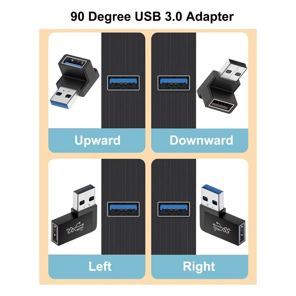 These USB 3.0 adapters are a game-changer for tight spaces! The 90-degree angles let you plug in cables without bending or straining ports, and the 5Gbps speed keeps data transfers fast and smooth. Perfect for crowded setups, and the 4-pack covers every direction you might need. Super sturdy and works flawlessly with USB 2.0 too—no lag during charging or file transfers. A must-have for anyone tired of bulky cables blocking other ports!