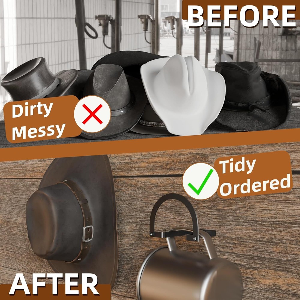 Love this cowboy hat rack! It keeps my hats in perfect shape while adding a cool western vibe to my wall. The sturdy alloy steel hooks hold them securely, and the black finish looks sleek. Super easy to mount—no more tossing hats around! Fast shipping was a bonus. Highly recommend for any cowboy hat lover!