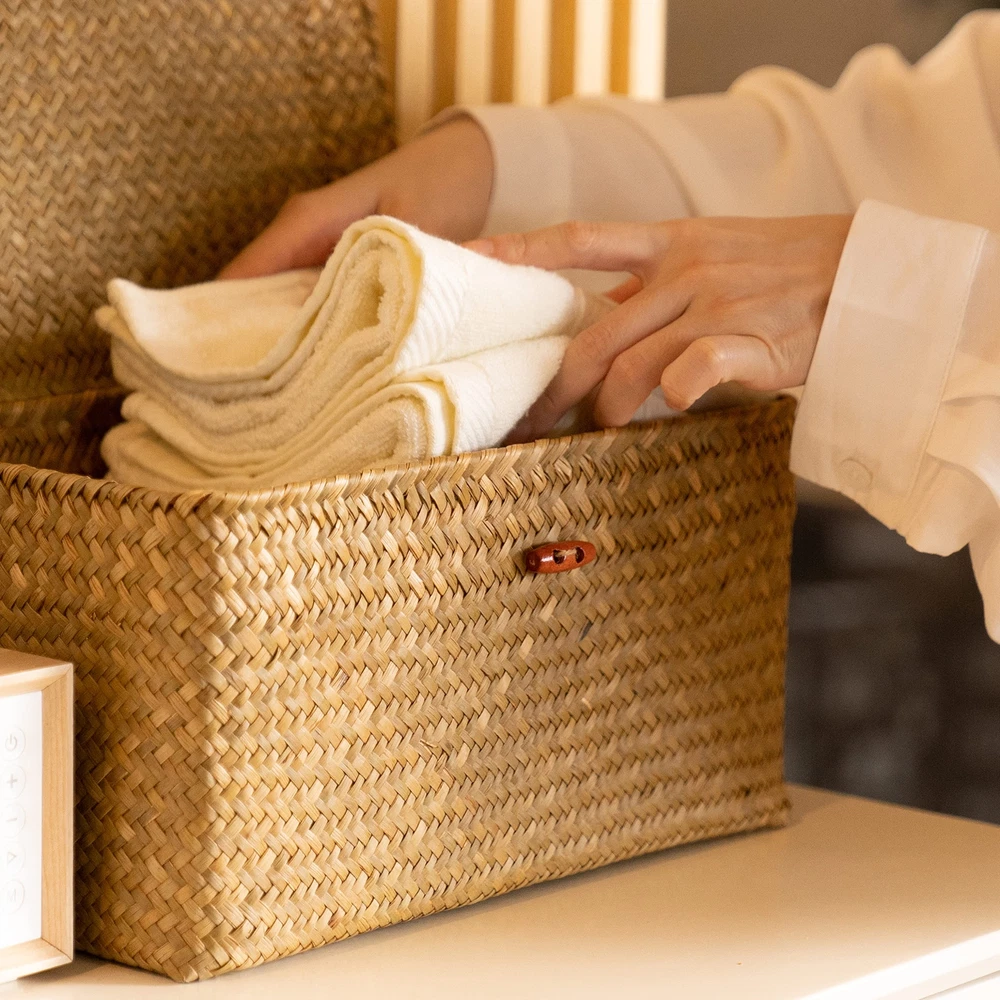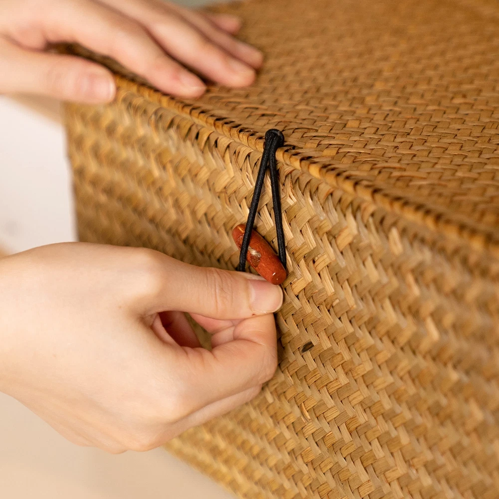 Dimensions: XL: 14.2 x 9.4 x 7.1H, L: 12.2 x 7.1 x 5.9H, M: 10.2 x 5.9 x 4.7H, S: 9.1 x 4.7 x 3.9H. Material: 100% Natural Seagrass with iron wire frame, provides durable quality and soft touch. Save Space: Perfect for storage DVDs, CDs, books, remote control, buttons, snack in living room. Skin-care products, socks, Card issuance in bedroom. Toiletries, towels in bathroom. That will make your home organized. Features: These storage baskets with lids that could protect your things from dust. The pastoral design style will make your home full of nature. Easy Cleaning: Wipe gently with damp cloth and store in a dry area.