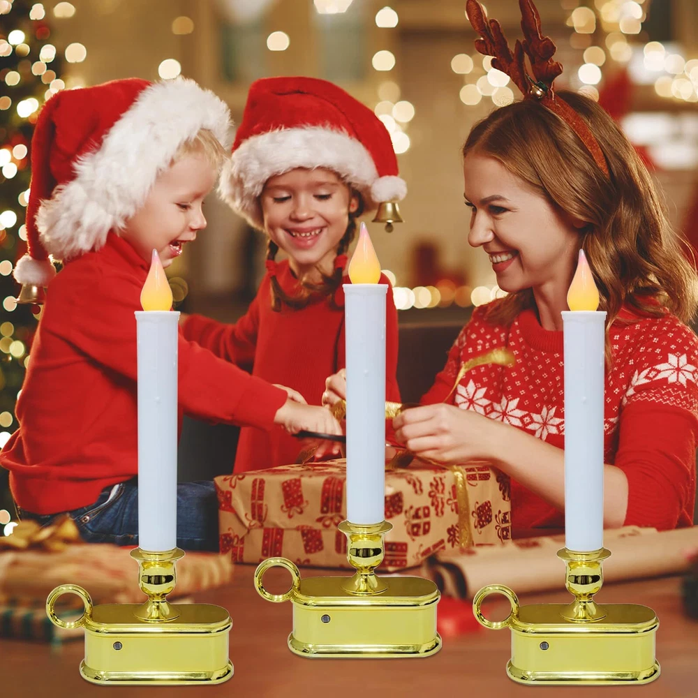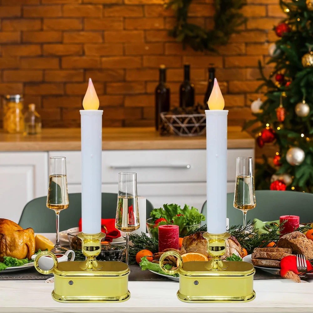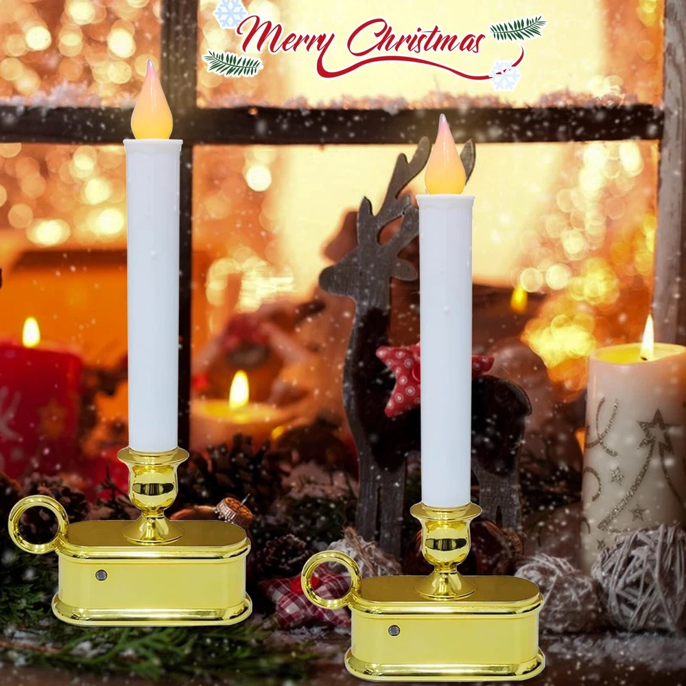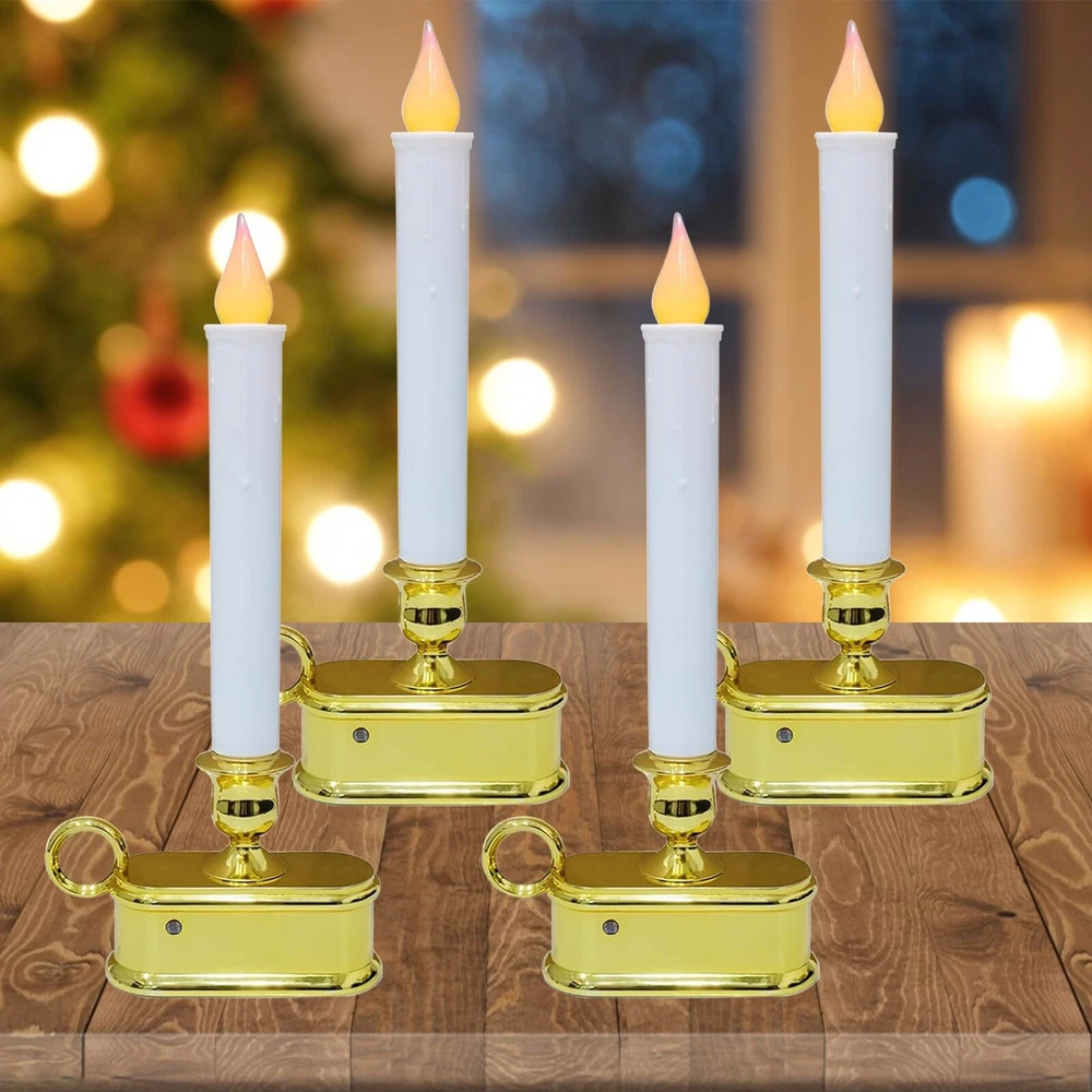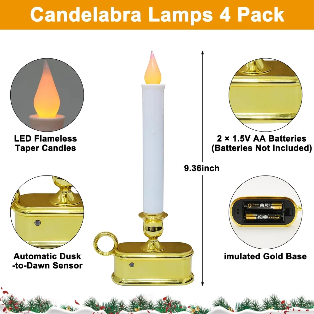 1 Set of 4 Flameless Taper Candles: 1-Light 9'' flameless dripping taper candle lights are made by plastic with led flickering. Durable and shatterproof plastic construction prevents breakage. This led candle lamps is great addition to your Christmas home decor. Battery Operated: The 1-Light battery powered window candle lamps last up to 30 days on 2 x "AA" size batteries(Not included). With no wires or flames to worry about and no fire hazard or risk of burning, these christmas window candle lights are also perfect for use as candles. Switching Modes: Sensor, turn on or turn off. window candle lamps have light control function, when the sensor button is turned on, the candle light will automatically turn on at dusk and turn off at dawn. If you don’t want to use the sensor function, you can also manually turn on or off the candle lamp. Energy Saving and Safe: Automatic sensor LED battery operated candlesticks, smokeless, odorless, no open flame, no heat, no melting wax, showing a flickering orange light, flame-free candles is safe, long-lasting and realistic. you can place it on windows, dining tables, kitchens, living rooms, bookshelves and anywhere for Christmas decor. Vintage Appearance Design: Christmas candle holders feature plastic white teardrop tubes that feature realistic wax drops. Combined with the vintage antique gold base, which looks and high-end. The LED flameless bulb emits warm flickering orange light, creating a warm and romantic Christmas atmosphere.