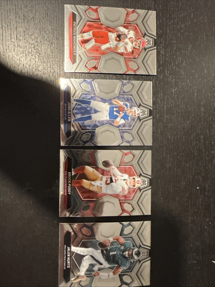 4 Panini Mosaic Patrick Mahomes, Josh Allen, Brock Purdy, And Jalen Hurts. Condition is Used. Shipped with USPS Ground Advantage.