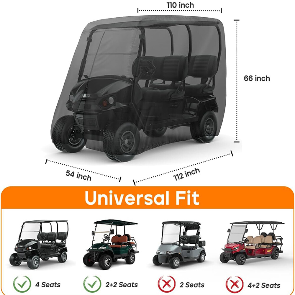 4 Passenger Golf Cart Cover Enclosure Waterproof For Evolution Classic 4 Plus Specification Color: Black Material: 190T Polyester Size (L*W*H) : 112" x 48" x 73" / 285*122*185 cm Feature Fitment: This universal cover is compatible with most major brand two-seater golf carts, for Yamaha, Honda, Club Car, and EZGO. Easy to Access with Zipper: Features a rear zipper for effortless access without removing the cover, equipped with a waterproof zipper made from high-grade alloy to prevent rusting, offering superior practicality. Great Protection for Outdoor: Protects your golf cart from rain, UV rays, sand, snow, dust, fog, scratches, and harsh weather conditions. Includes a carrying bag for convenient storage. Material: Constructed from polyester with a waterproof coating, ensuring protection against rain, UV rays, sand, snow, dust, fog, scratches, and severe weather. Breathable: Designed with dual air vents for improved airflow during extended storage, reducing the risk of overheating and moisture accumulation. Package Included 1 x Golf Cart Cover 1 x Storage Bag •We accepted Online Payment payment ONLY •We will ship your order within 24 hours after receiving your verified payment (Excluding Weekends and Public Holidays) •The estimated delivery time is within 3-7 working days(not including the weekend). •United States:3-5 working days(not including the weekend) •If you fail to receive over 7 days, please contact us and we will try our best to help •Return items must not be used or have any sign of abuse or intentional damage. •Buyer is responsible for all return shipping charges. •We reserve the right not to refund S&H when the item has been posted. We are a company run business with more than 10 years experience in whole sale of quality Motorcycle And Car Parts & Accessories Specification Color: Black Material: 190T Polyester Size (L*W*H) : 112" x 48" x 73" / 285*122*185 cm Feature Fitment: This universal cover is compatible with most major brand two-seater golf carts, for Yamaha, Honda, Club Car, and EZGO. Easy to Access with Zipper: Features a rear zipper for effortless access without removing the cover, equipped with a waterproof zipper made from high-grade alloy to prevent rusting, offering superior practicality. Great Protection for Outdoor: Protects your golf cart from rain, UV rays, sand, snow, dust, fog, scratches, and harsh weather conditions. Includes a carrying bag for convenient storage. Material: Constructed from polyester with a waterproof coating, ensuring protection against rain, UV rays, sand, snow, dust, fog, scratches, and severe weather. Breathable: Designed with dual air vents for improved airflow during extended storage, reducing the risk of overheating and moisture accumulation. Package Included 1 x Golf Cart Cover 1 x Storage Bag PAYMENT •We accepted Online Payment payment ONLY SHIPPING •We will ship your order within 24 hours after receiving your verified payment (Excluding Weekends and Public Holidays) •The estimated delivery time is within 3-7 working days(not including the weekend). •United States:3-5 working days(not including the weekend) •If you fail to receive over 7 days, please contact us and we will try our best to help Terms of Sale •Return items must not be used or have any sign of abuse or intentional damage. •Buyer is responsible for all return shipping charges. •We reserve the right not to refund S&H when the item has been posted. ABOUT US We are a company run business with more than 10 years experience in whole sale of quality Motorcycle And Car Parts & Accessories On Mar 22, 2025 at 17:22:20 PDT, seller added the following information:
